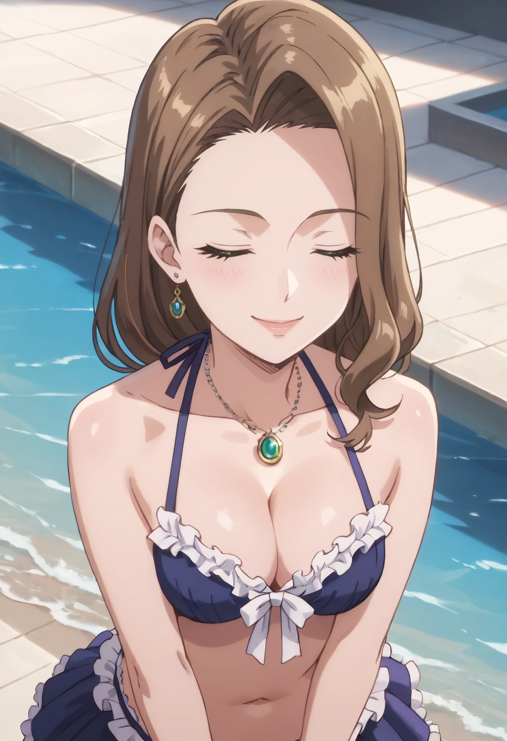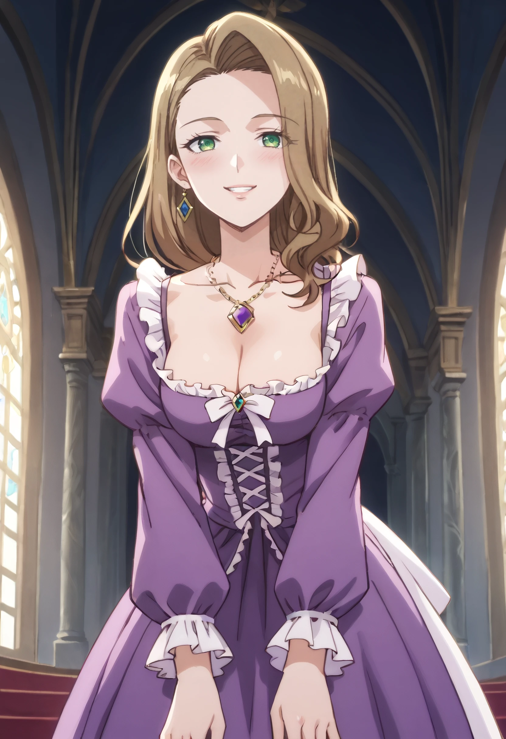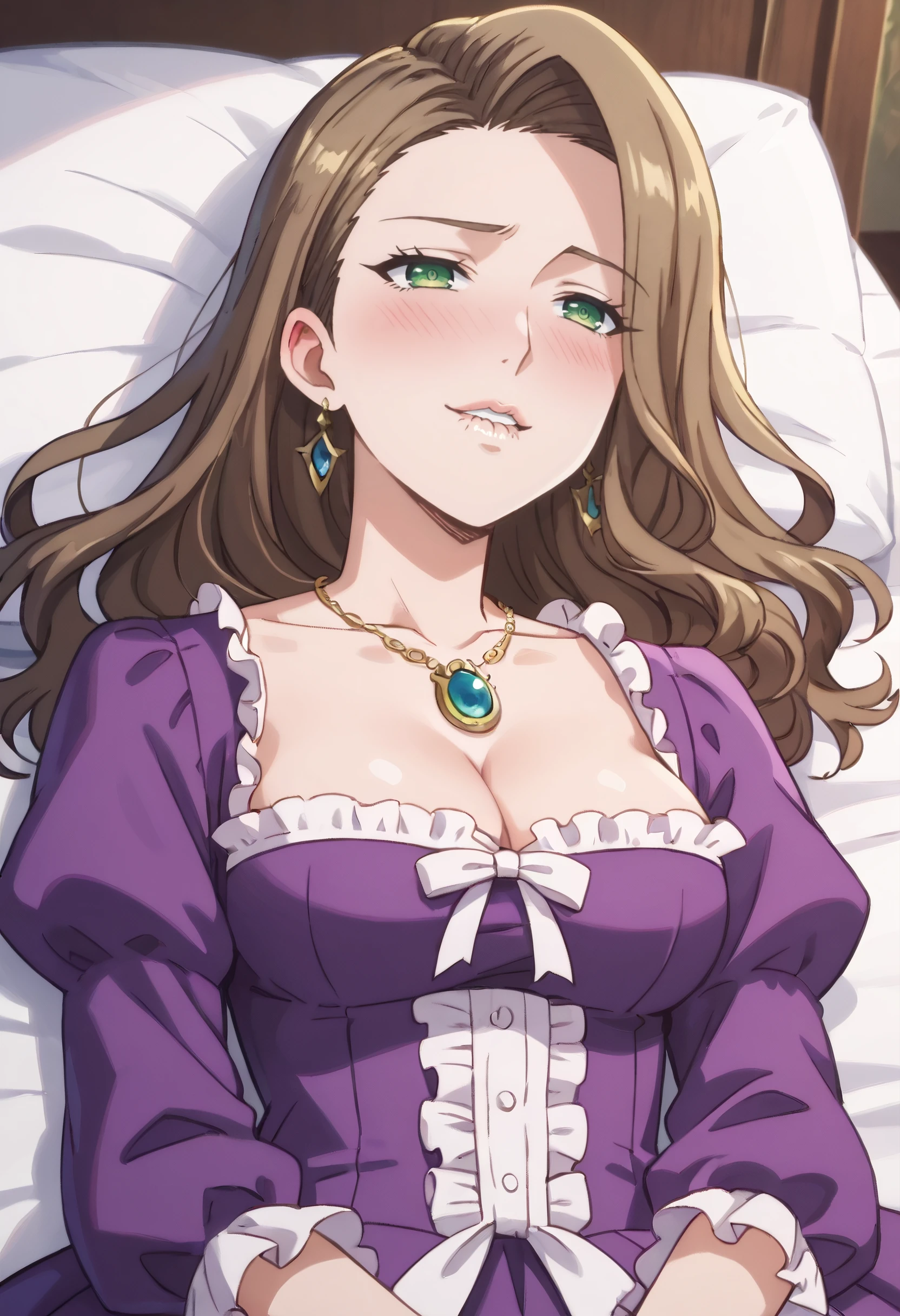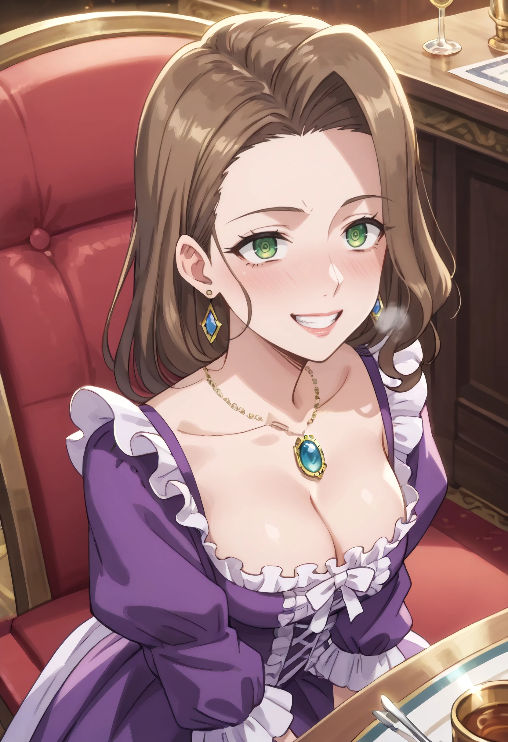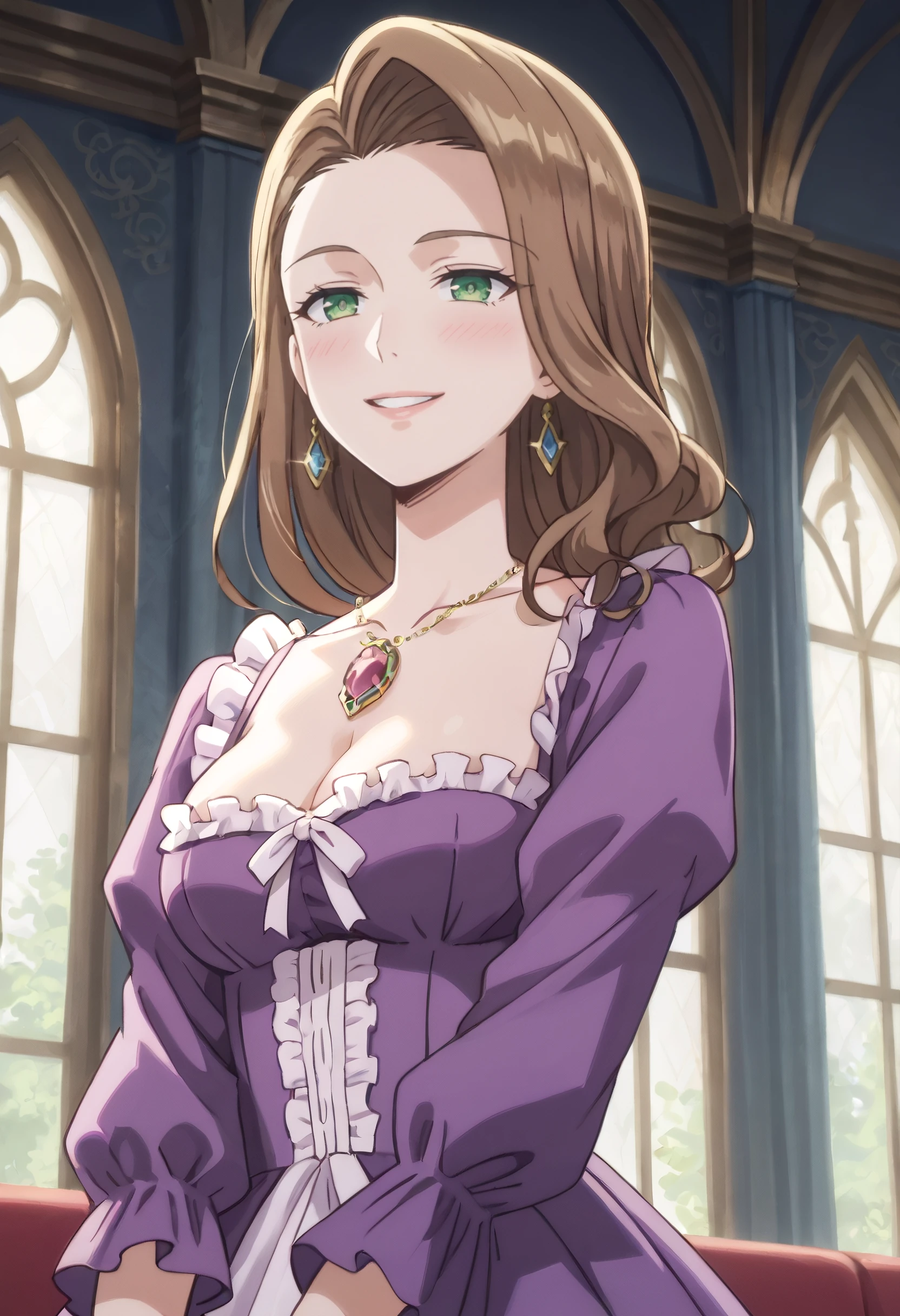 jewelry, earrings, dress, frills, cleavage, collarbone, long sleeves, necklace, purple dress, frilled sleeves, puffy sleeves, gem,