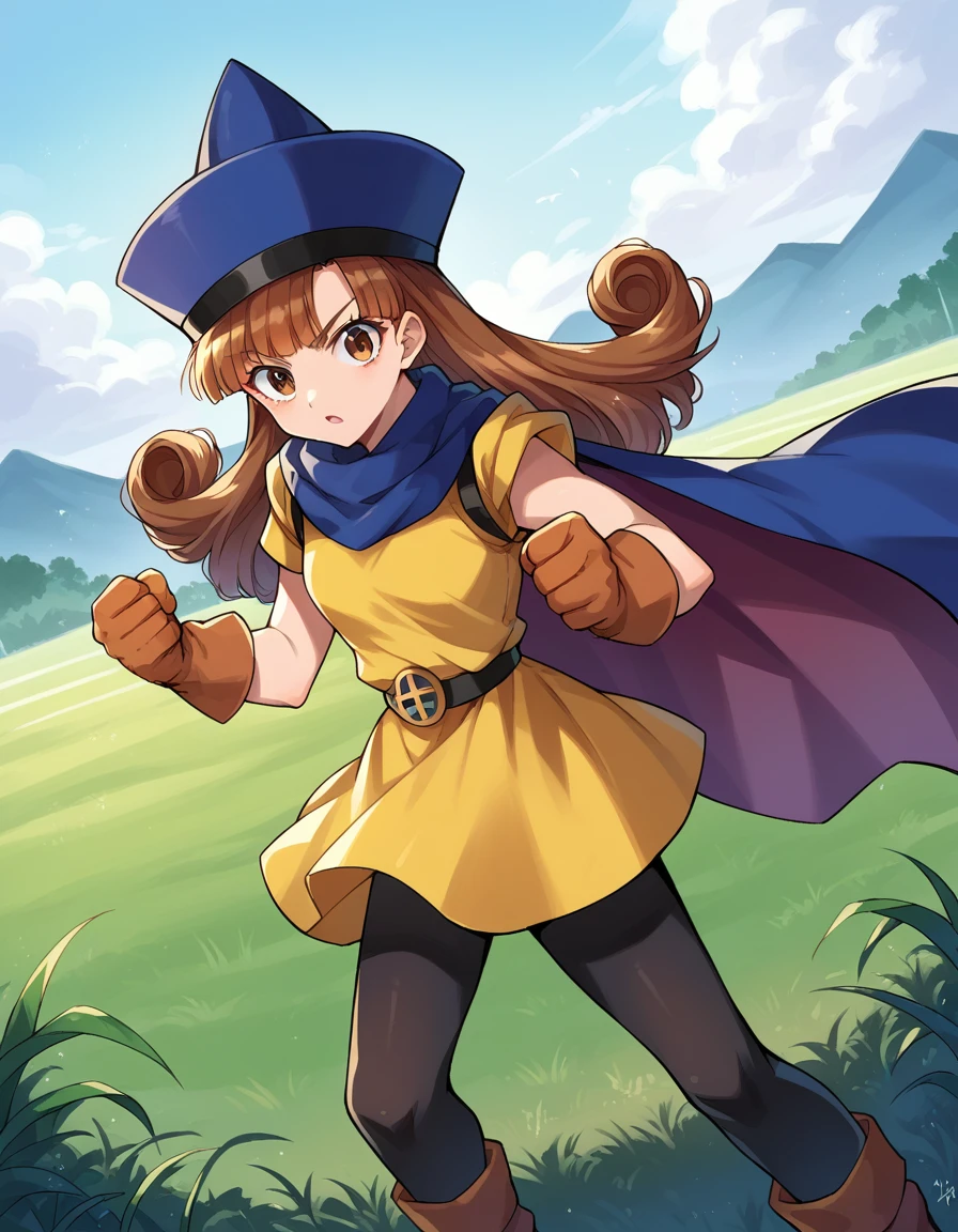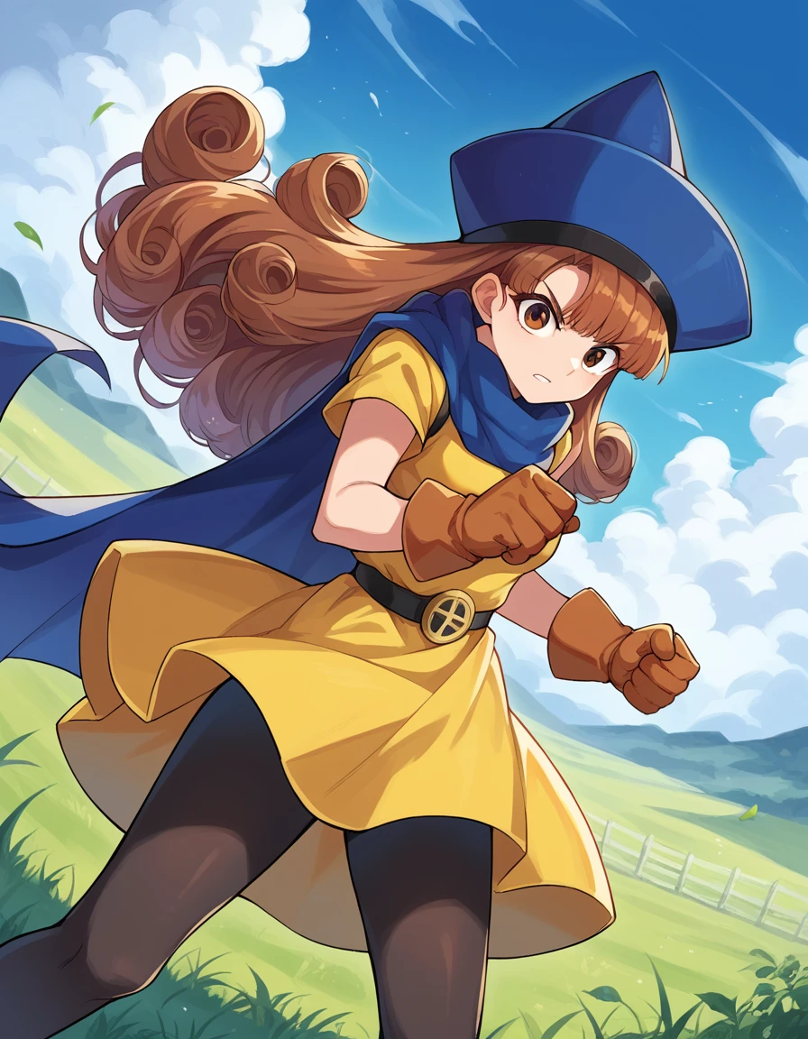 cape, dress, gloves, hat, pantyhose, yellow dress, scarf, short sleeves,