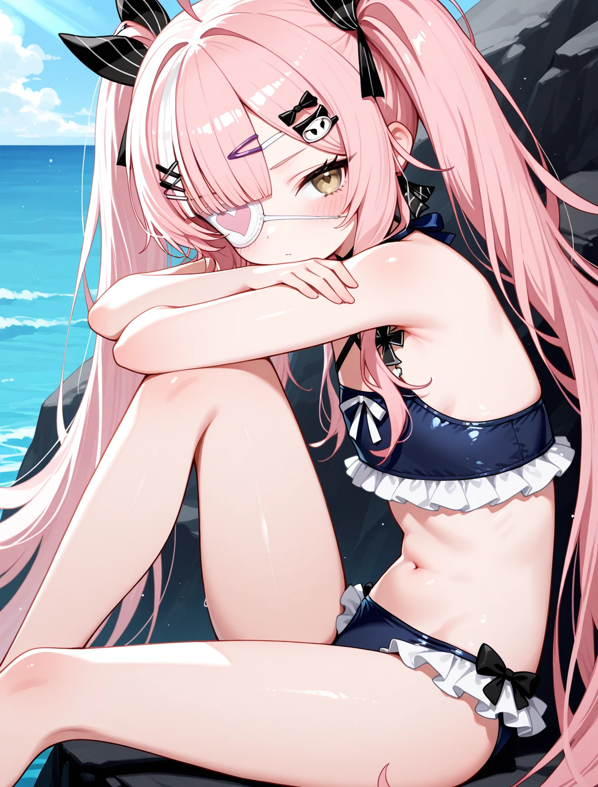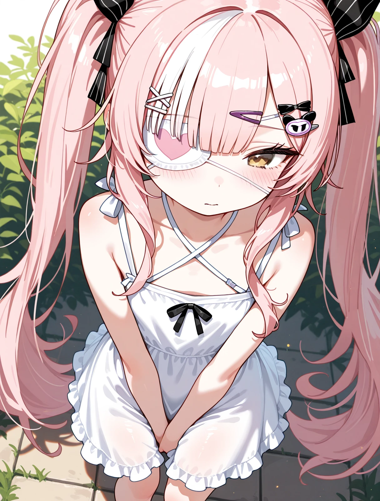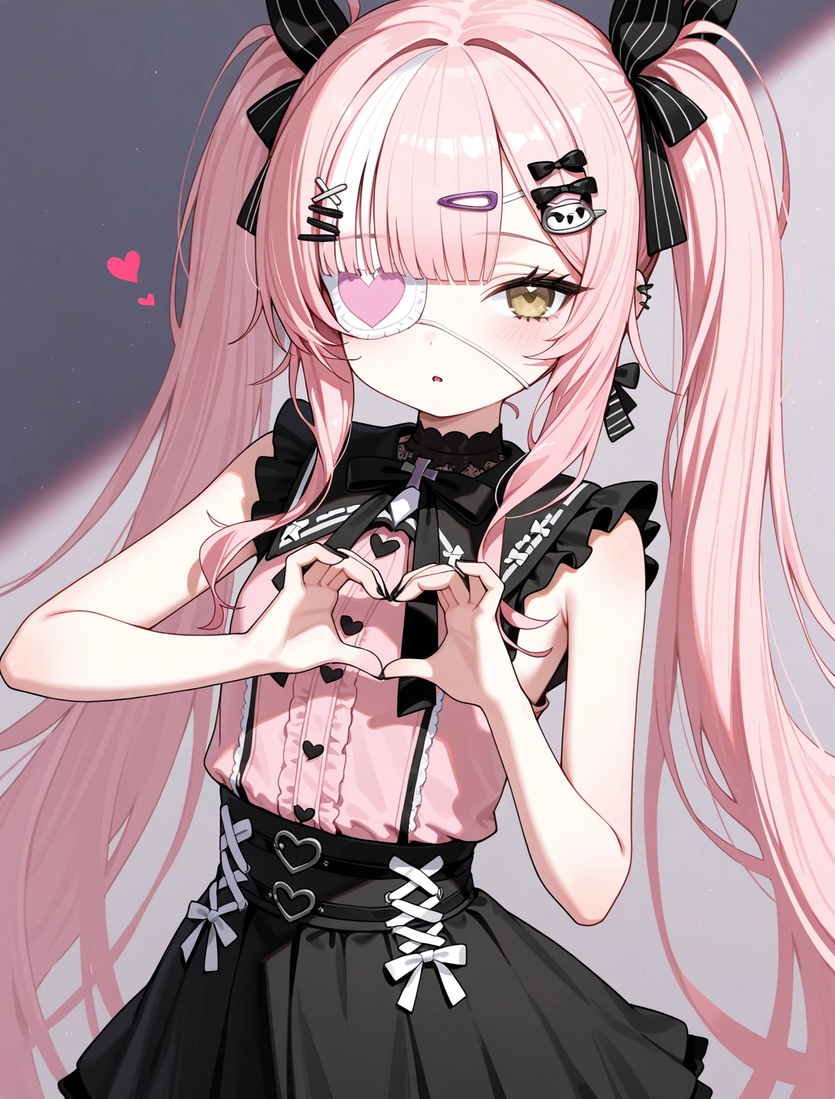 原版(original):z47_\(azur_lane\),twintails, hair_ornament,x hair ornament,yellow eyes, pink_hair, eyepatch,black_jacket, sleeveless,open_jacket, sleeveless_dress,