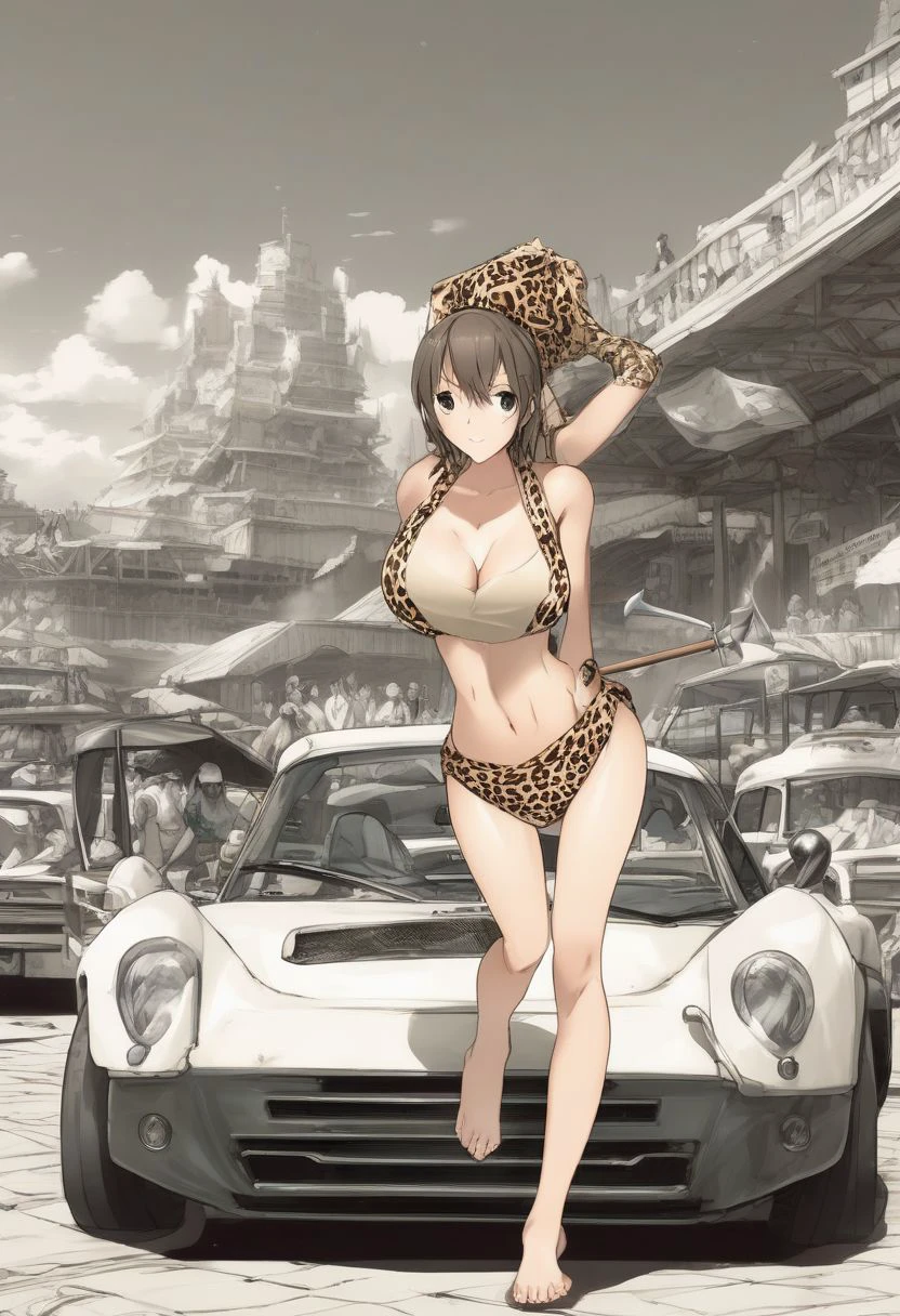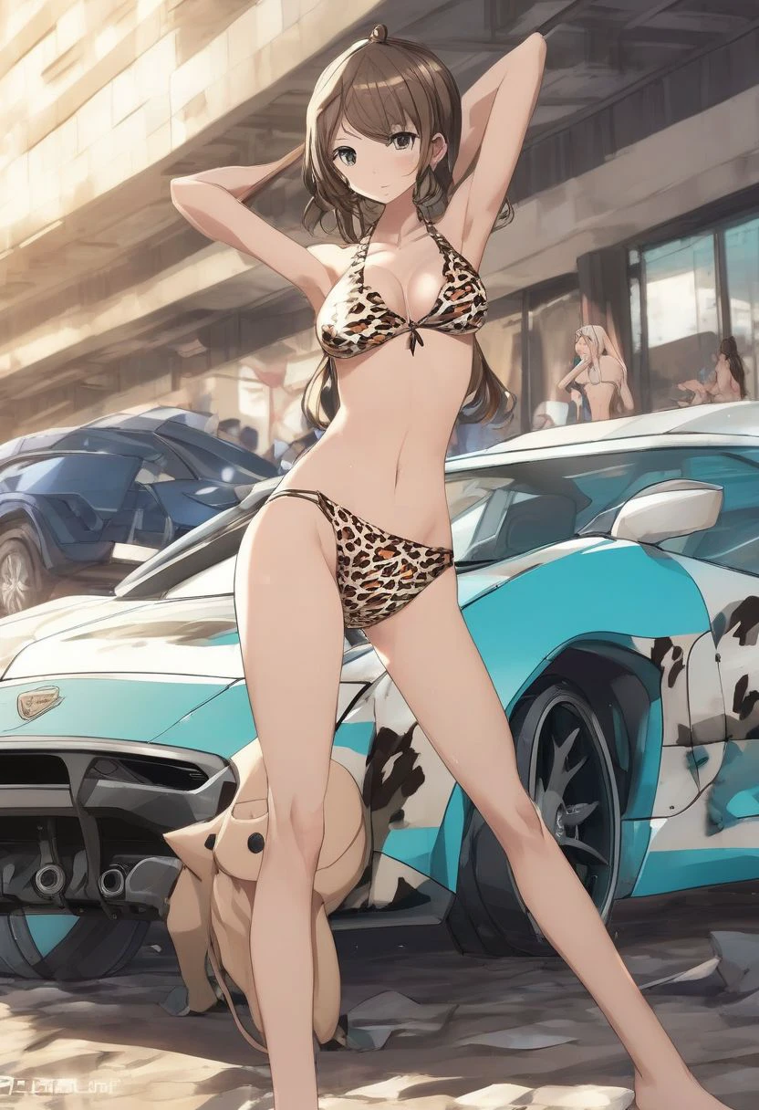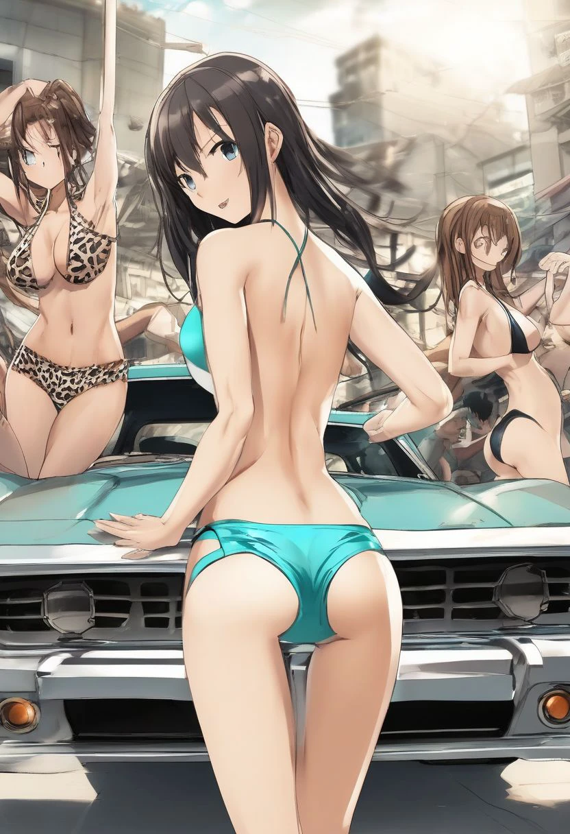 aqua dress, one-piece swimsuit, animal print, ass, monochrome, blurry background, ground vehicle, TAN-BIKINI-SKINNED FEMALE, polearm, car, multiple girls, ???????, breasts, panties, pants, shirt