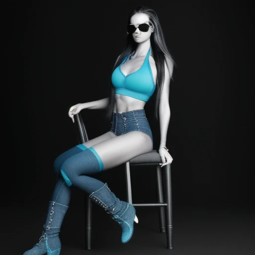 long hair, sunglasses, sports bra, model poses, black background, monochrome, chair, barefoot, blurry, boots, weapon, denim, denim jacket, realistic, vulva, aqua dress