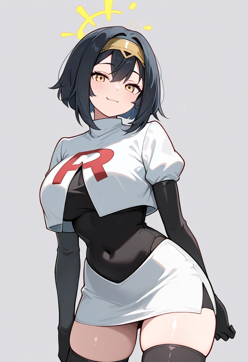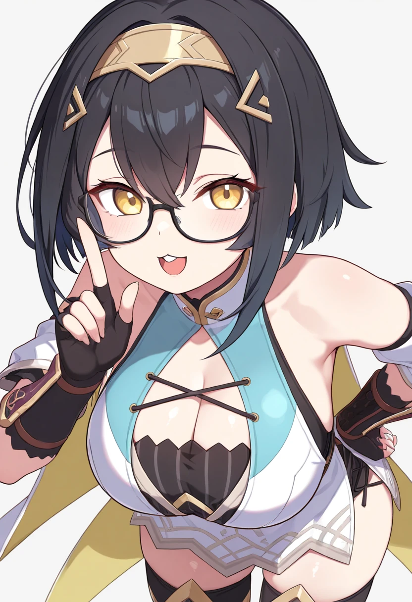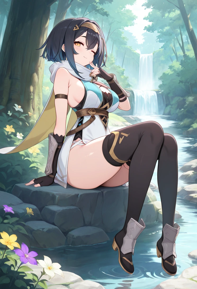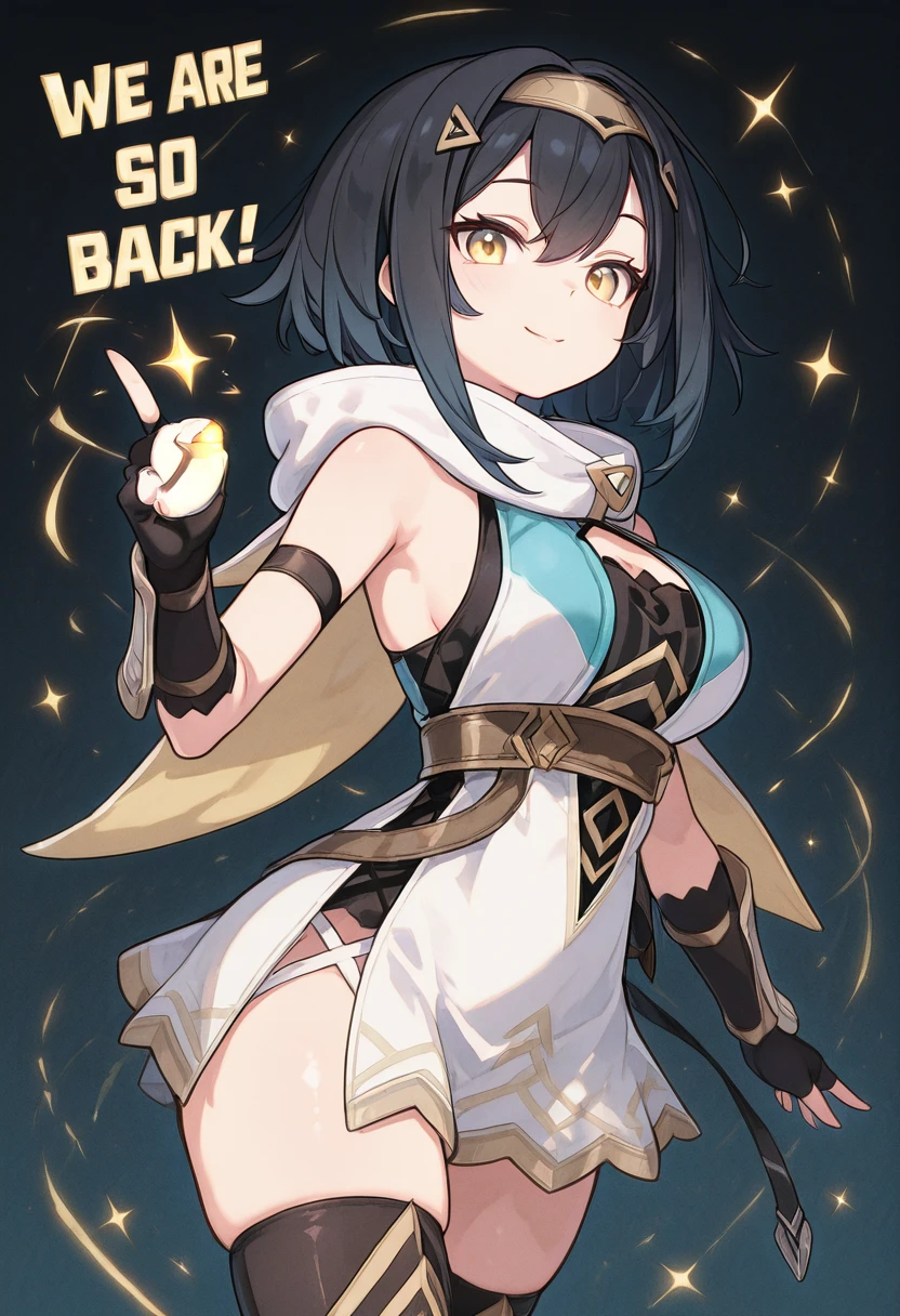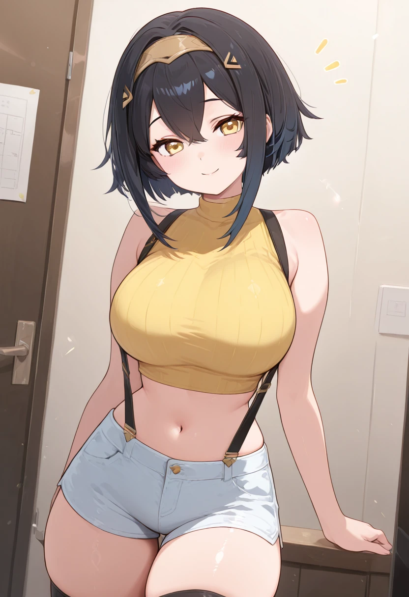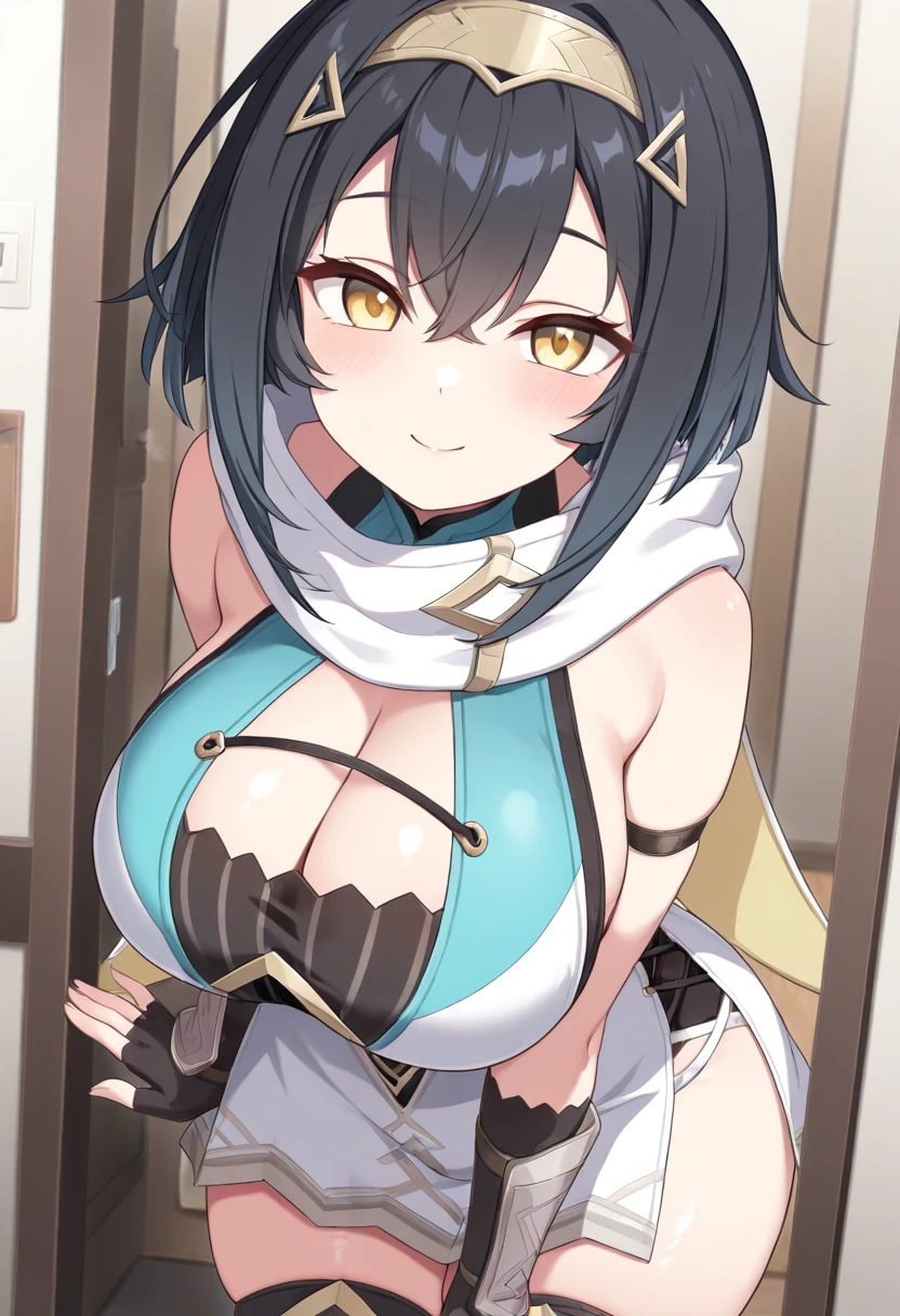 zzAmber, yellow eyes, black hair, medium hair, short hair with long locks, hair ornament, dress, cleavage, sideboob, bare shoulders, hairband, sleeveless, black gloves, fingerless gloves, scarf, blue shirt, black thighhighs,