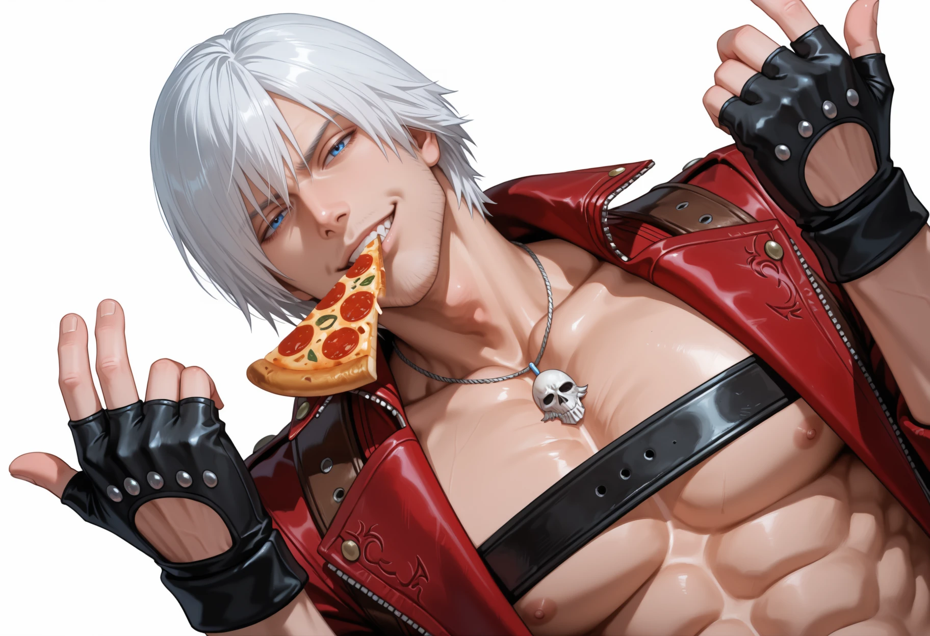 Recommend adding these tags: upper body, half-closed eyes, looking at viewer, smile, smirk, hands up, food in mouth, pizza slice