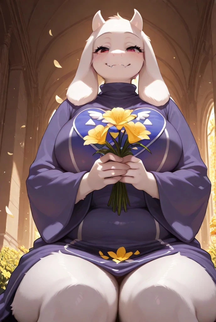 1girl,Toriel,red eyes, animal ears, tail, horns, colored skin, furry, body fur, white fur, thick thighs, curvy, wide hips, furry female, fang, snout, white horns, goat ears, goat girl, goat horns,