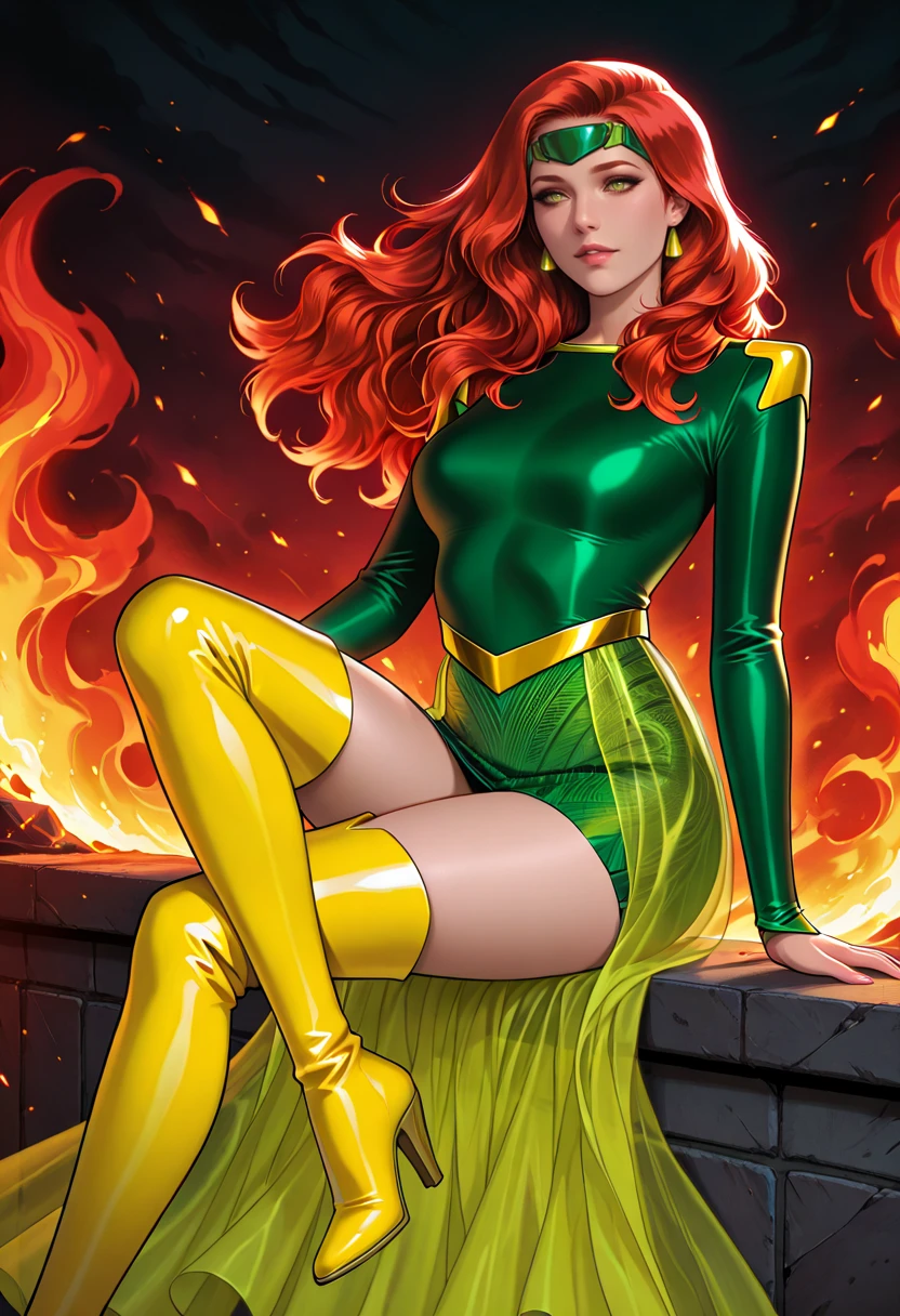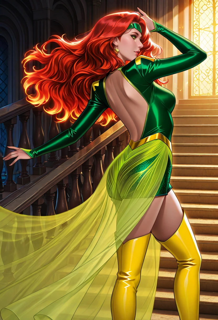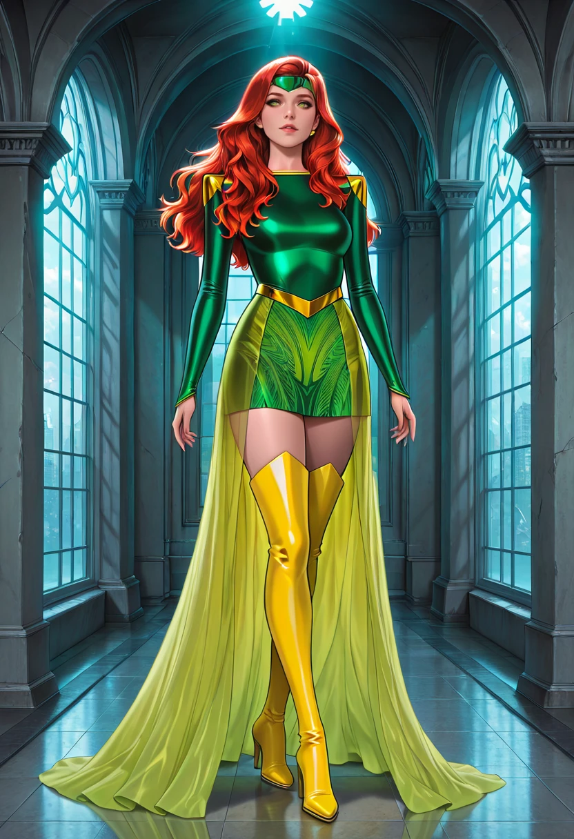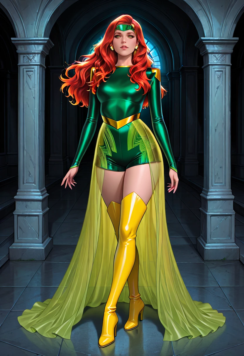 jean grey, hellfire gala 2022, long hair, red hair, boots, yellow boots, thighhighs, high heel boots, thigh boots, green eyes, long sleeves, shorts, jewelry, headband, green leotard, see-through dress, long dress