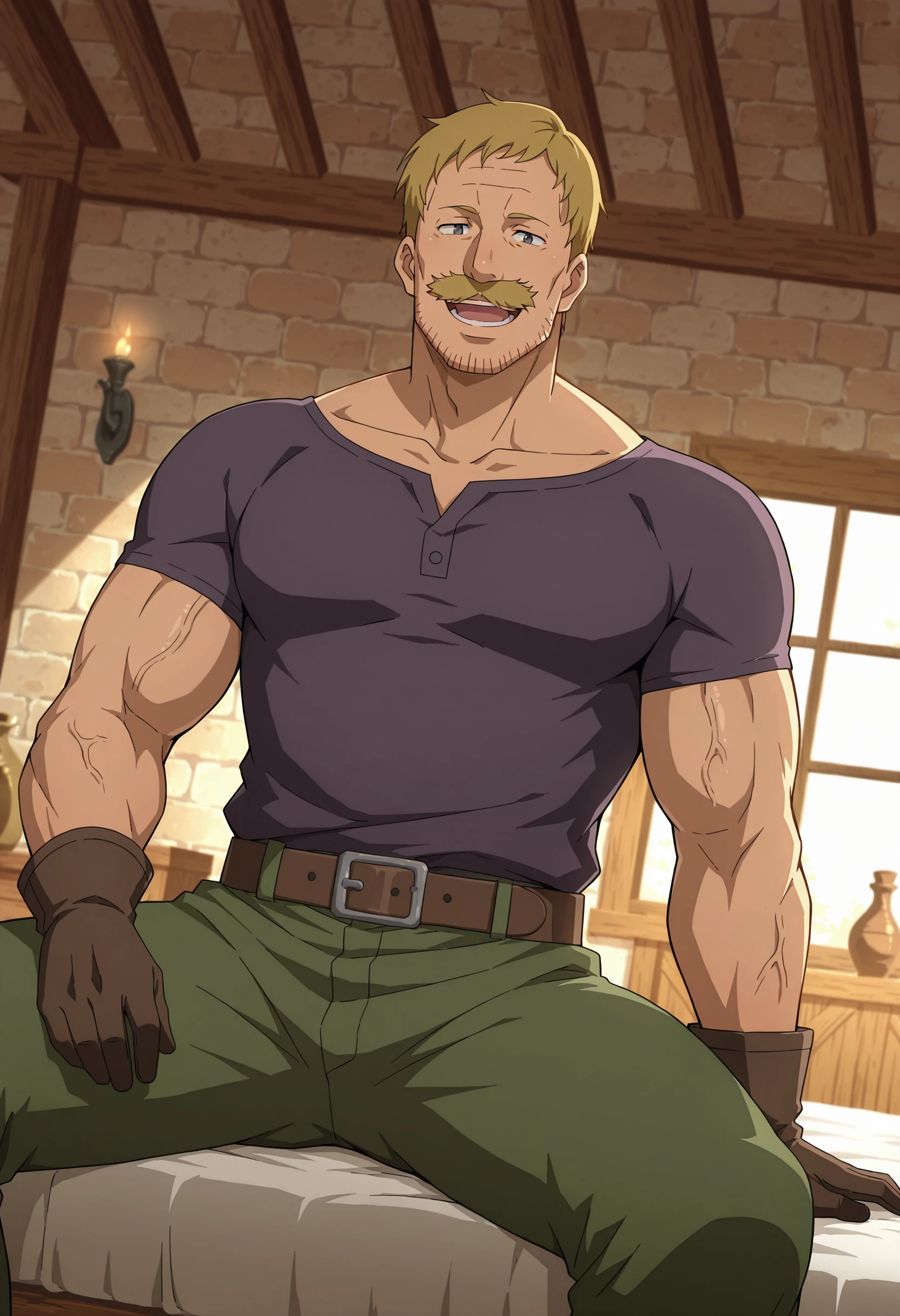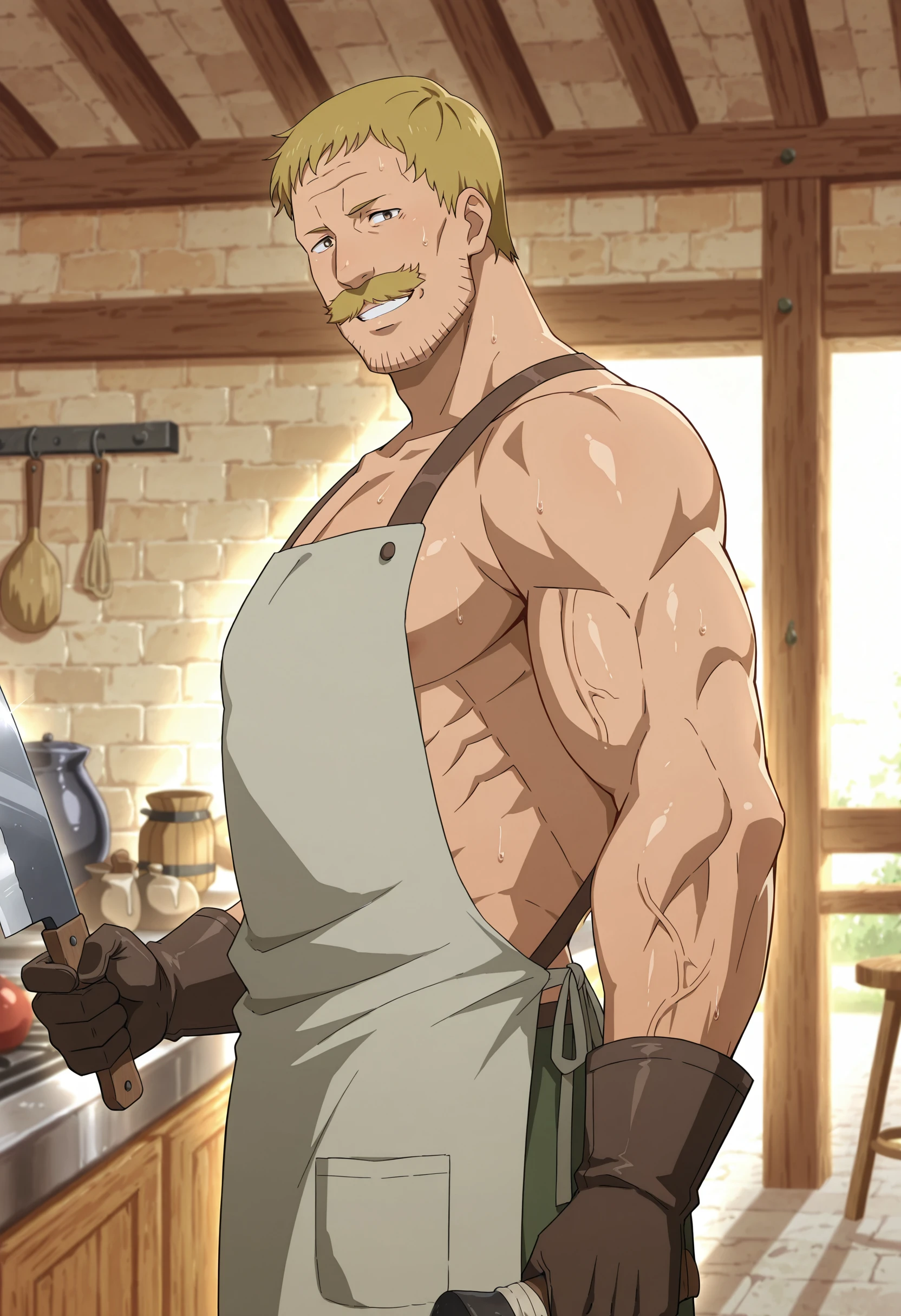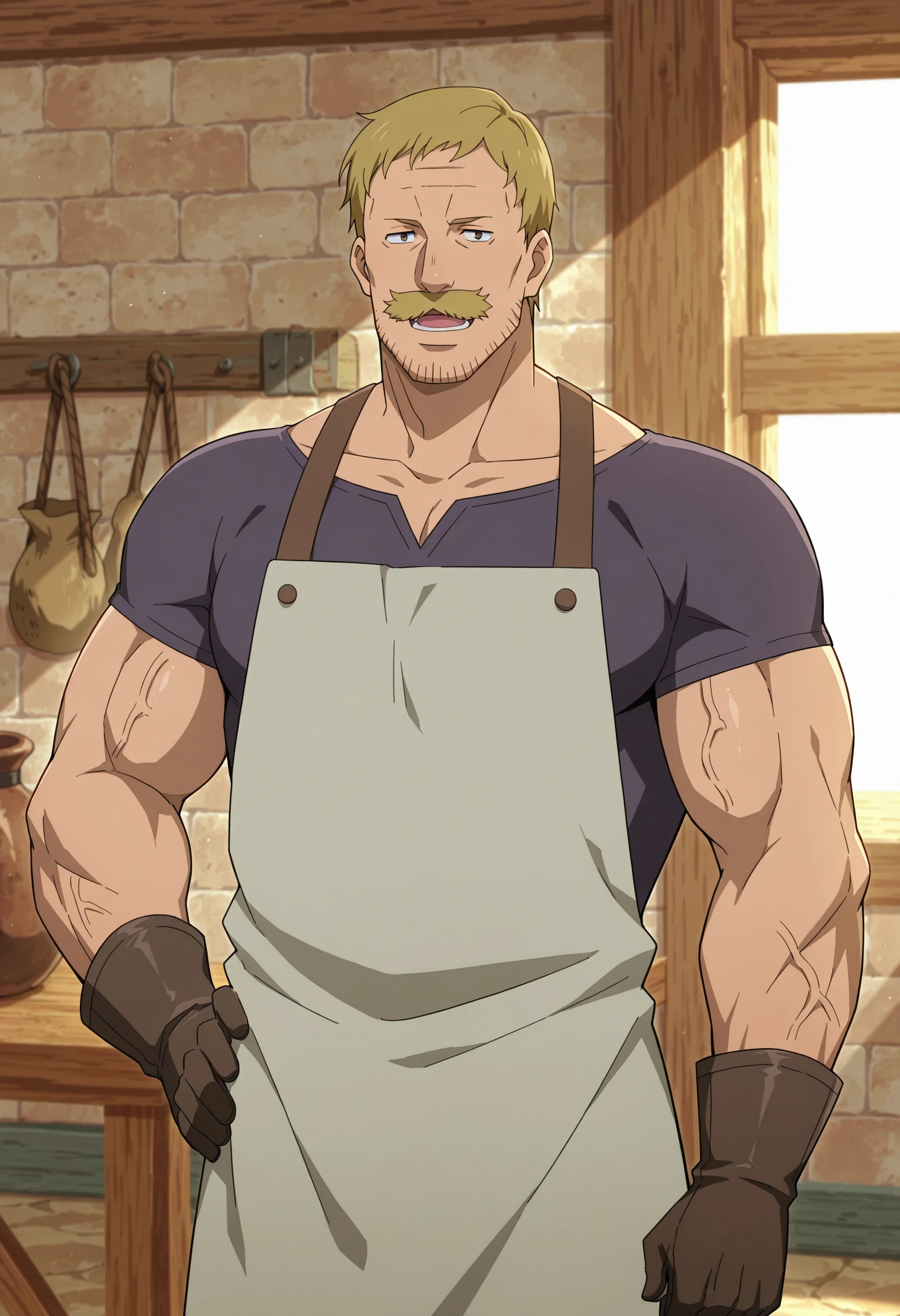 blonde hair, mustache, stubble, purple t-shirt, gray apron with brown straps, gloves, green pants