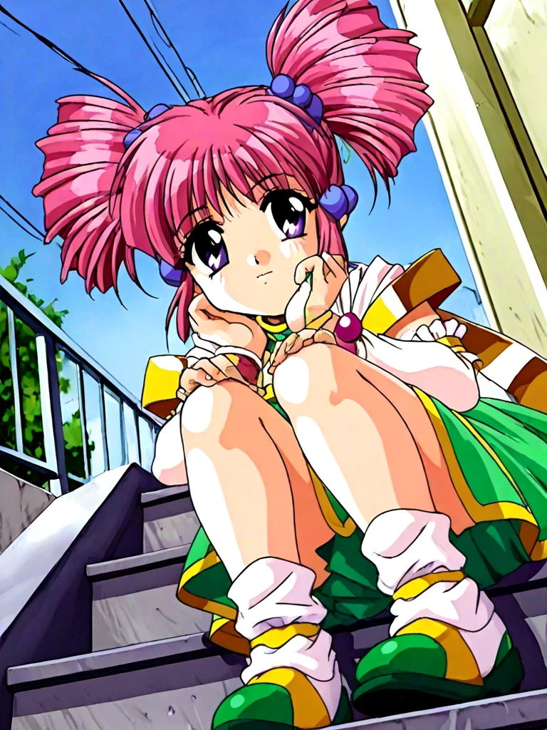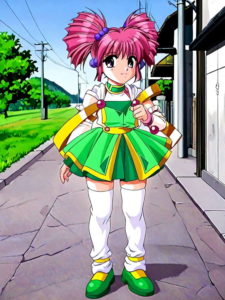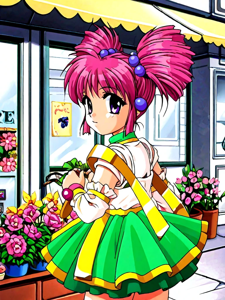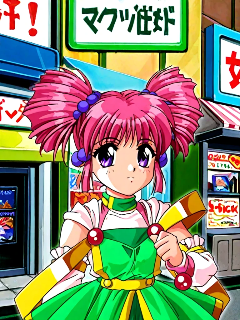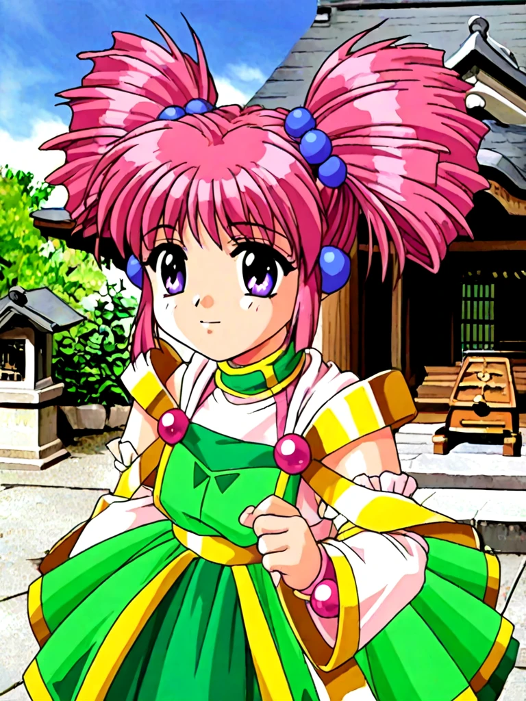 miena, 1girl, purple eyes, pink hair, twintails, twin drills, drill hair, hair bobbles, green skirt, dress, gem,