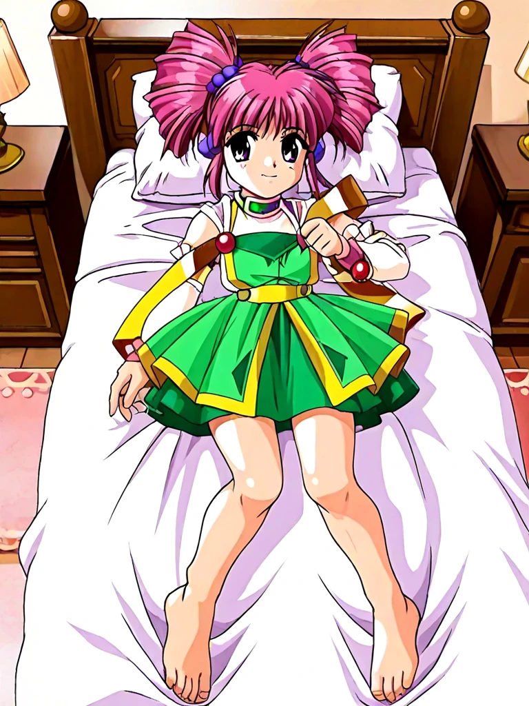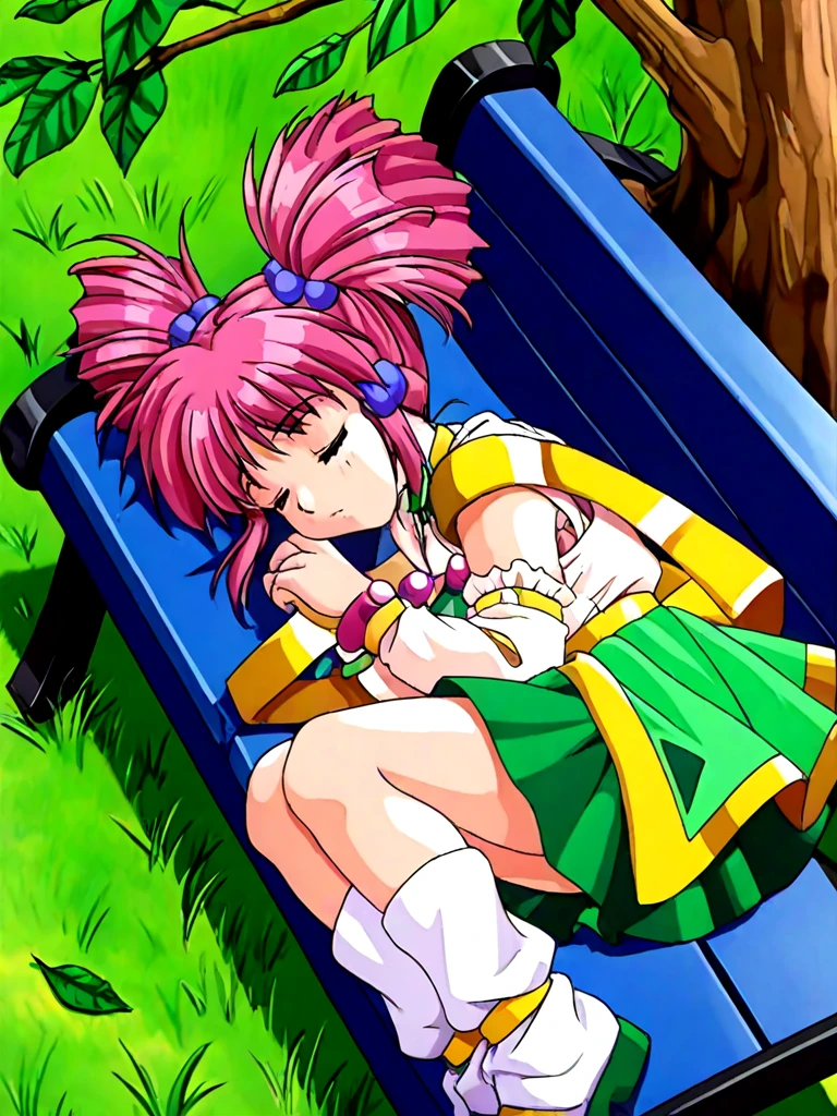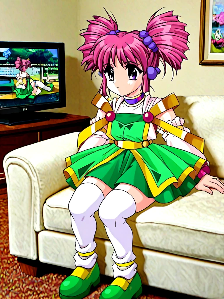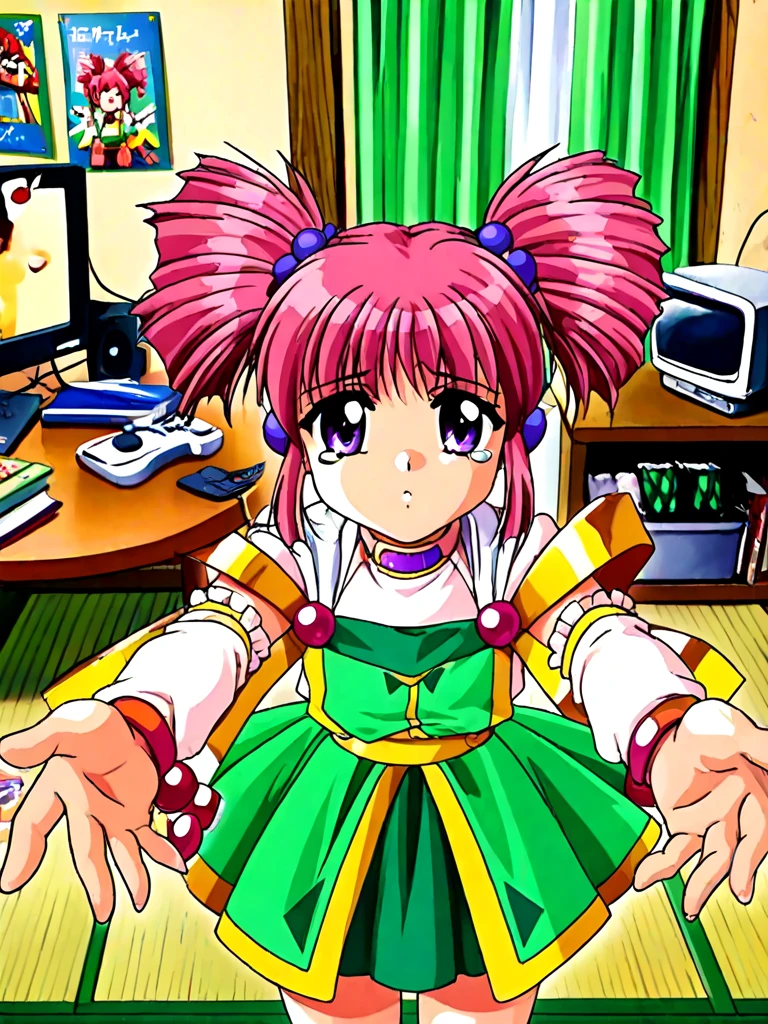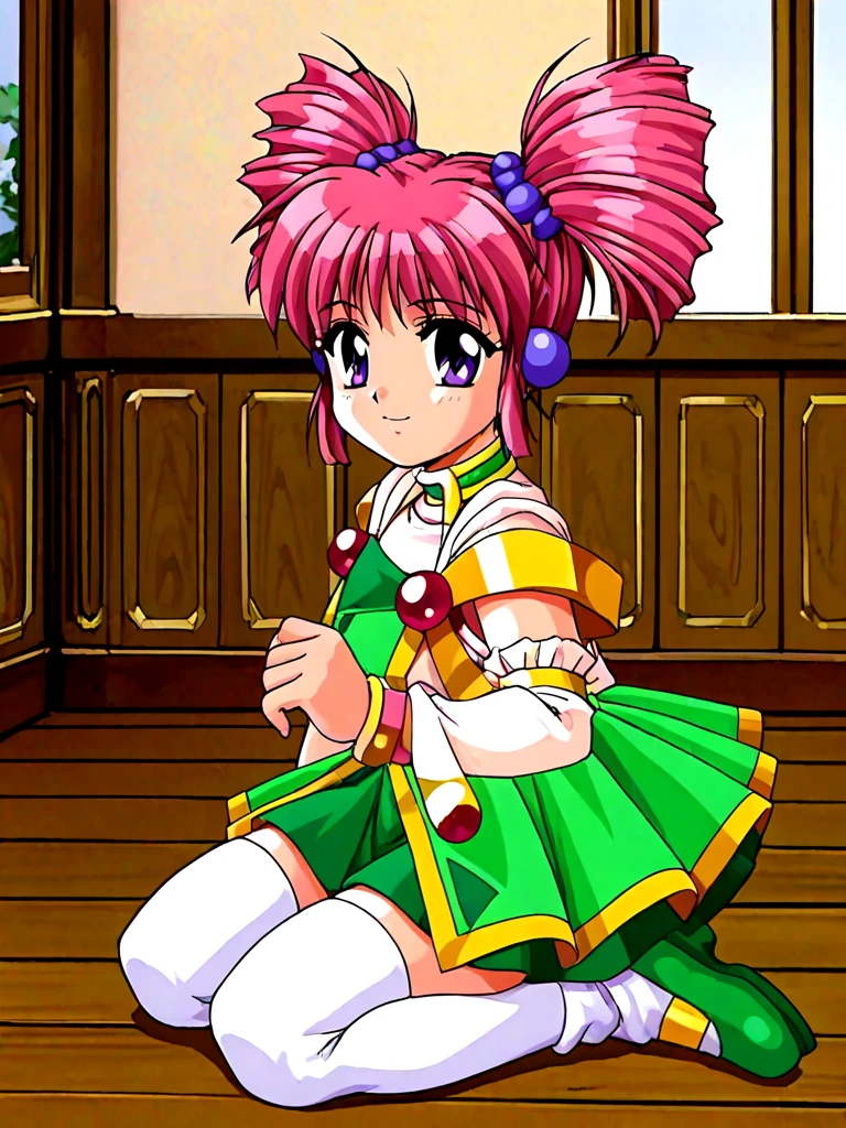 miena, 1girl, purple eyes, pink hair, twintails, twin drills, drill hair, hair bobbles, green skirt, dress, gem,
