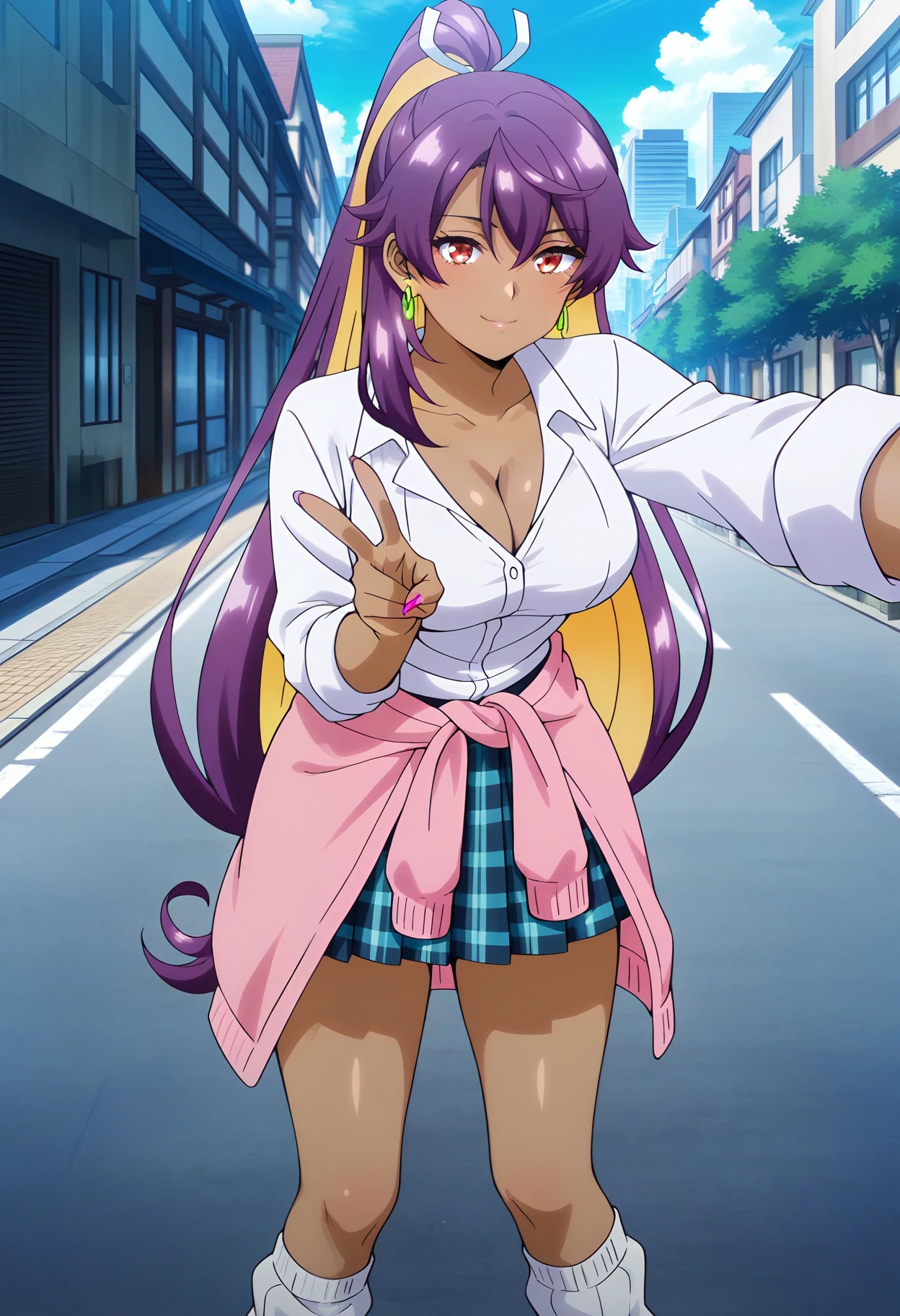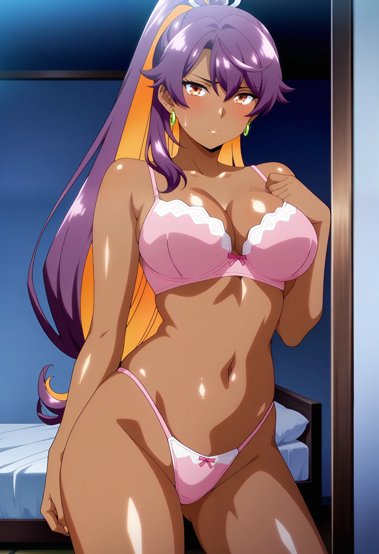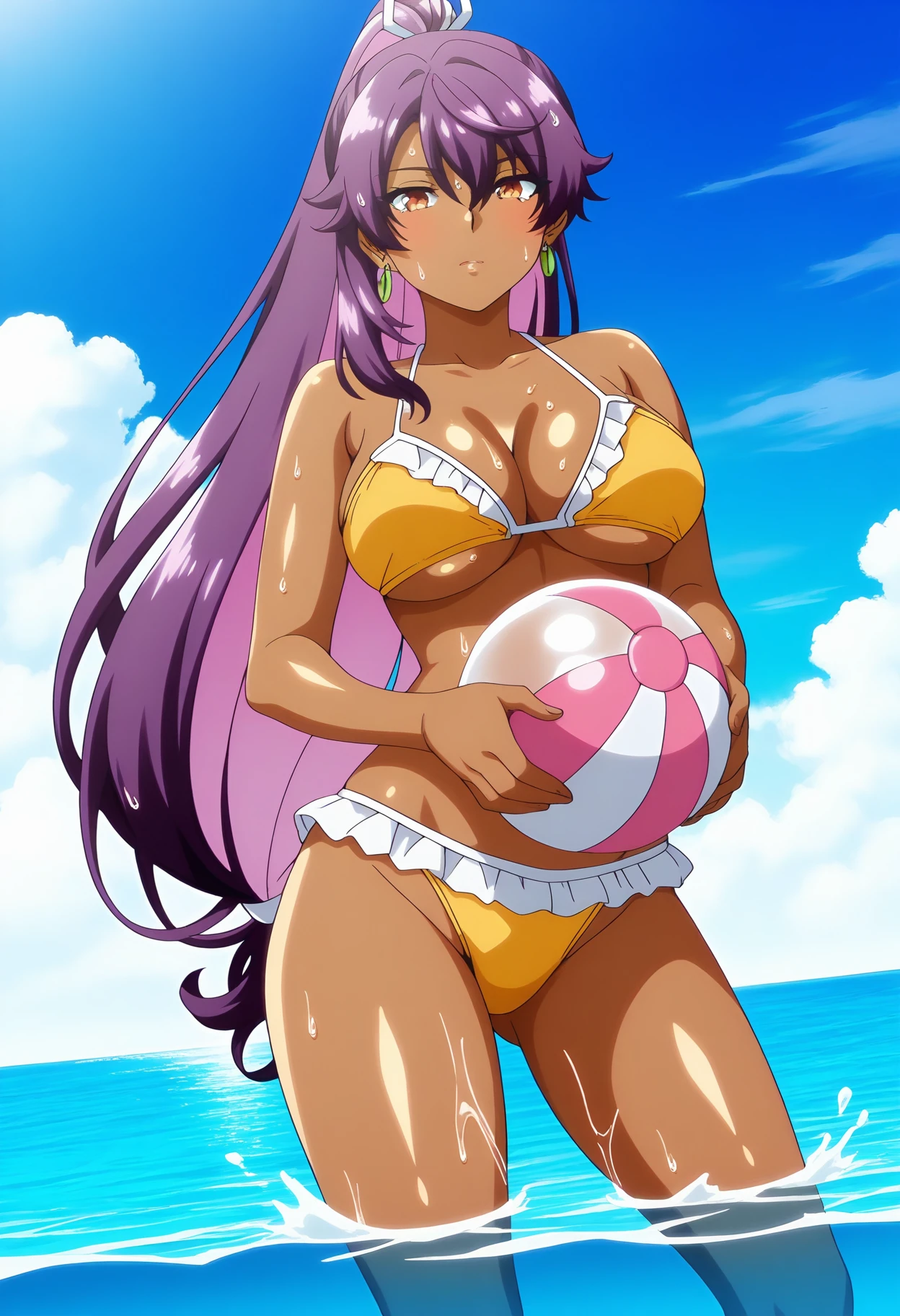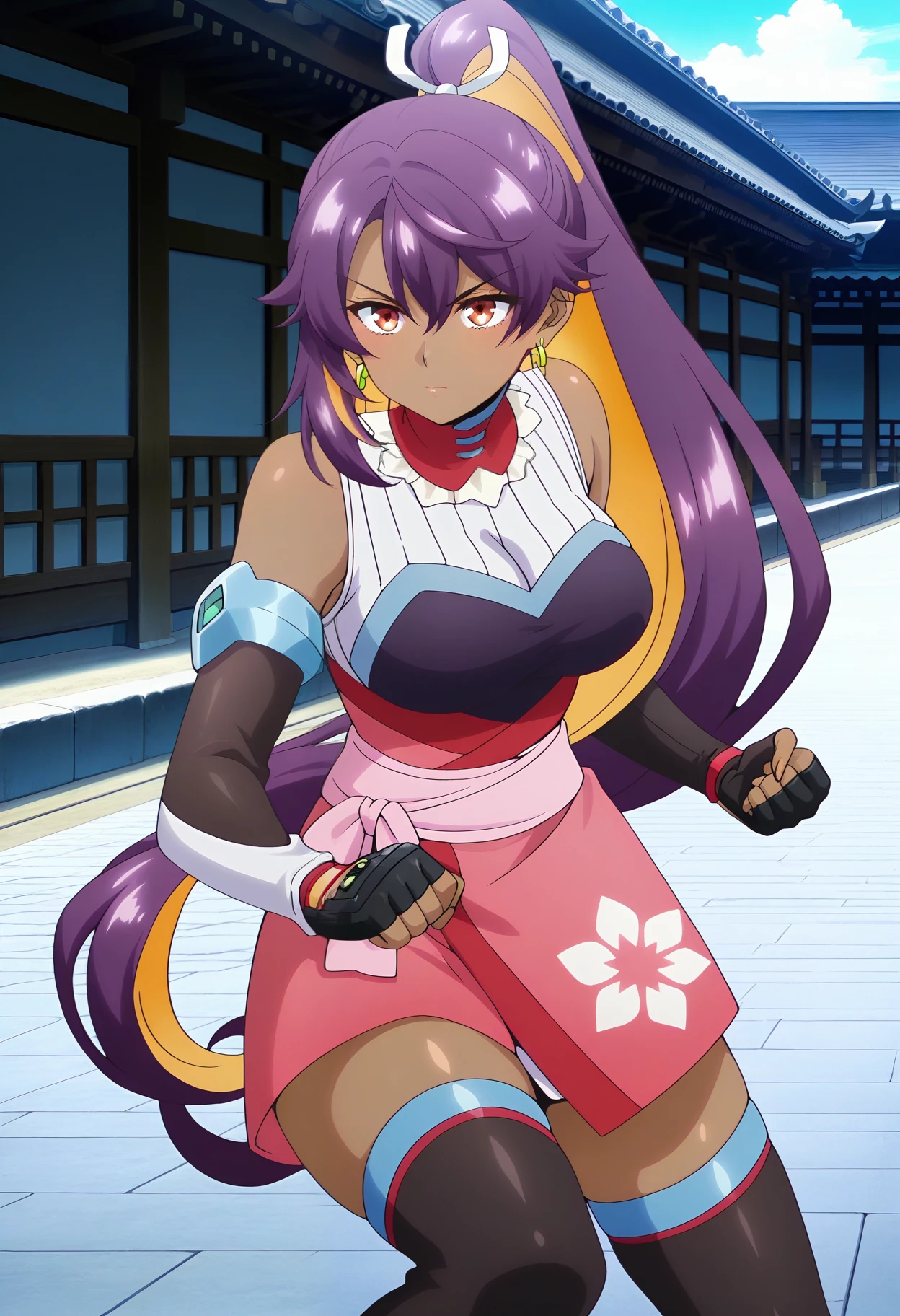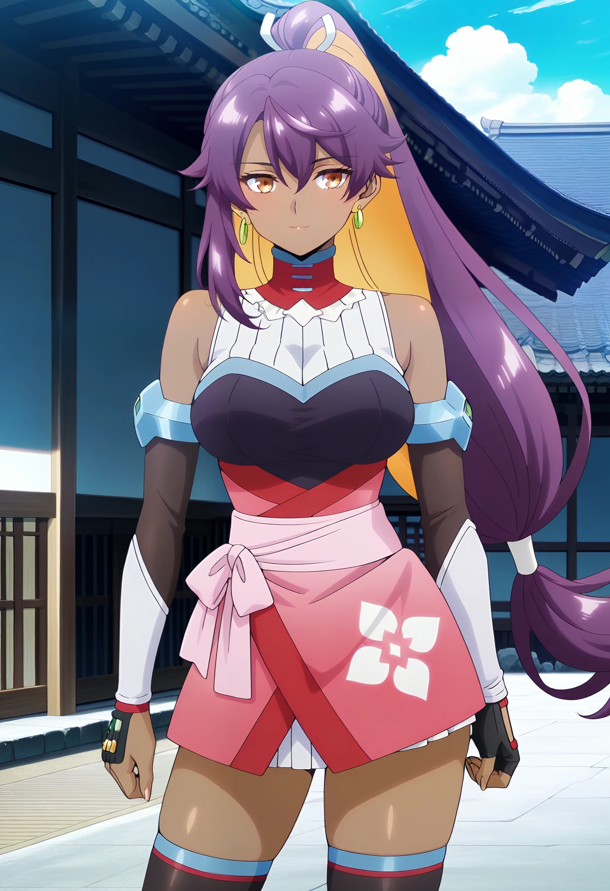 yurawz, very long hair, high ponytail, purple hair, colored inner hair, orange eyes, dark skin, dark-skinned female, large breasts,earrings, detached sleeves, bare shoulders, shash, japanese clothes, skirt, single glove, black glove, fingerless glove, black thighhighs