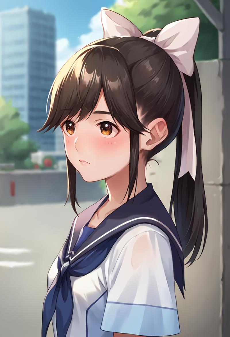 score_9, score_8_up, score_7_up, masterpiece, source_anime 1girl, ct_m4na, long hair, ponytail, hair bow, blue serafuku, blue sailor collar, white neckerchief, long sleeves, blue skirt, outdoors, depth of field, city, cowboy shot, shiny skin, upper body, Negative prompt ❌: