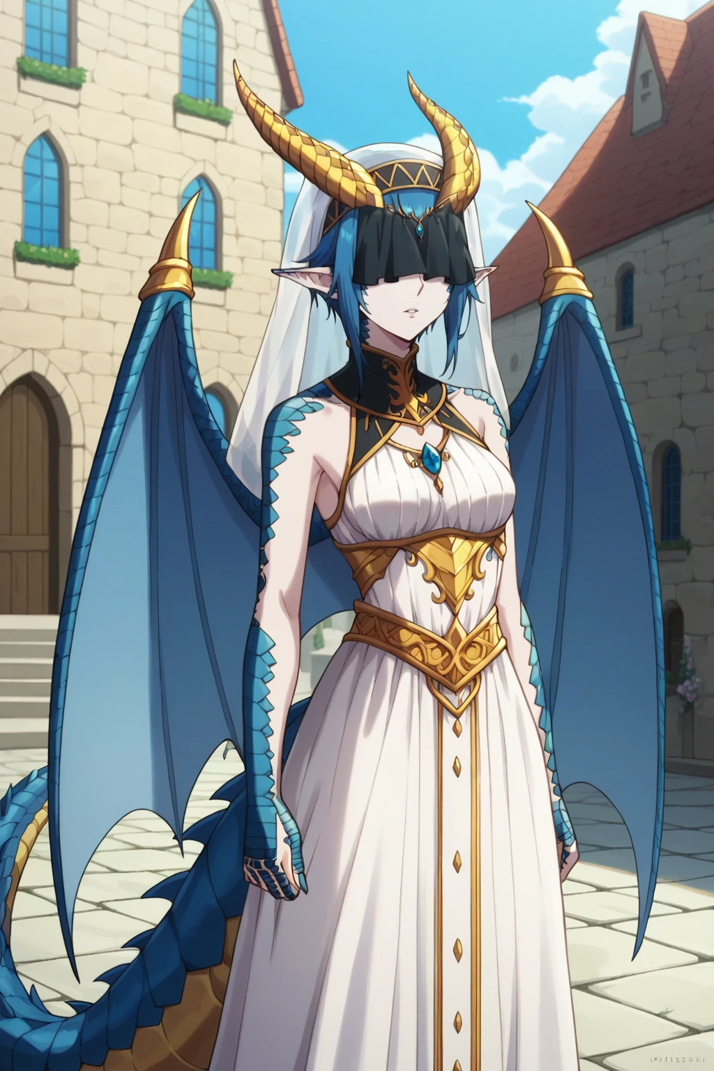 KJOskadi, dragon girl, monster girl, dragon tail, scales, blue hair, horns, blue eyes, slit pupils, pointy ears, short hair, long ears, pale skin, wings,
