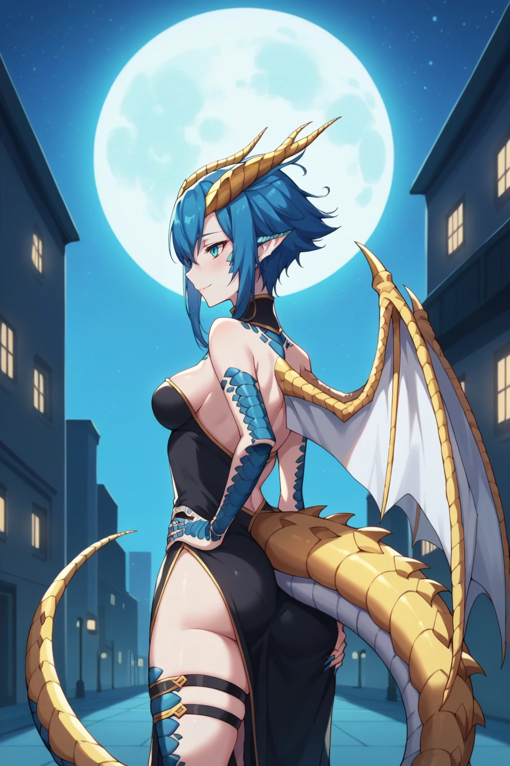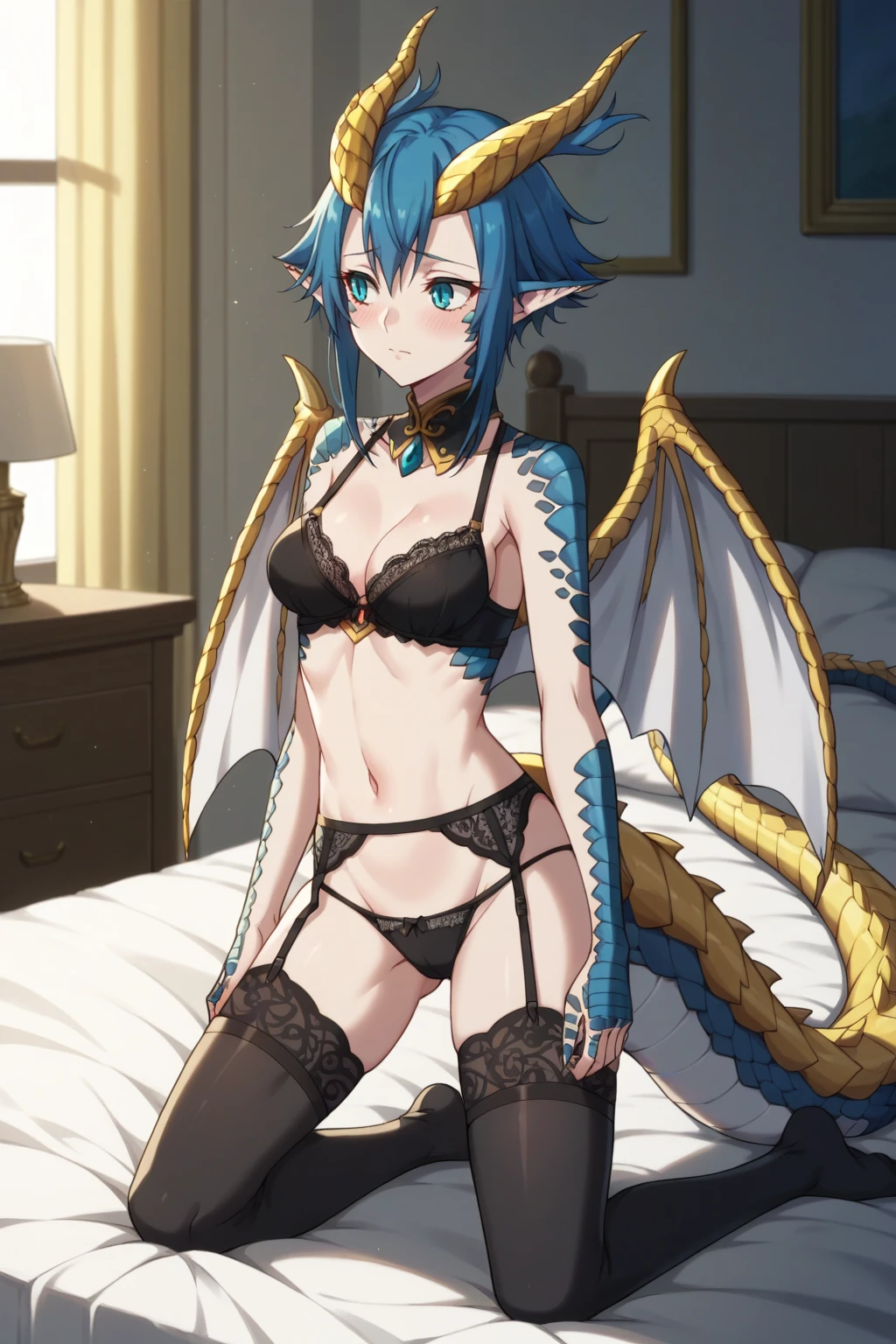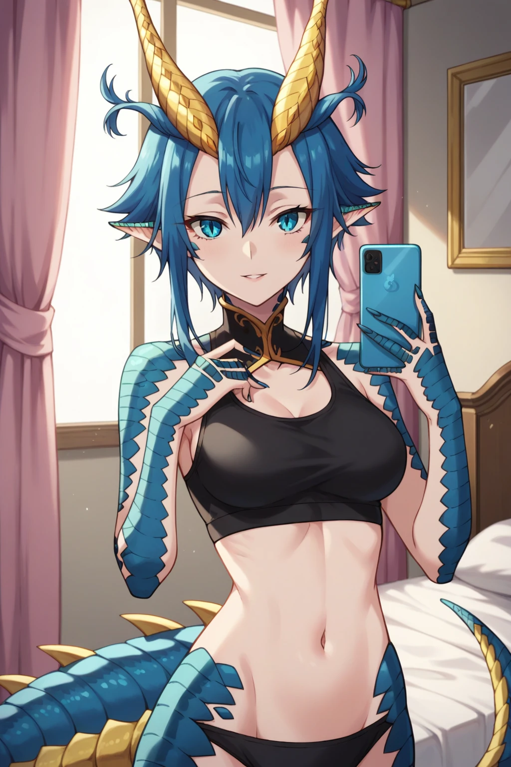 Triggers: KJOskadi, dragon girl, monster girl, dragon tail, scales, blue hair, horns, blue eyes, slit pupils, pointy ears, short hair, long ears, pale skin, wings,