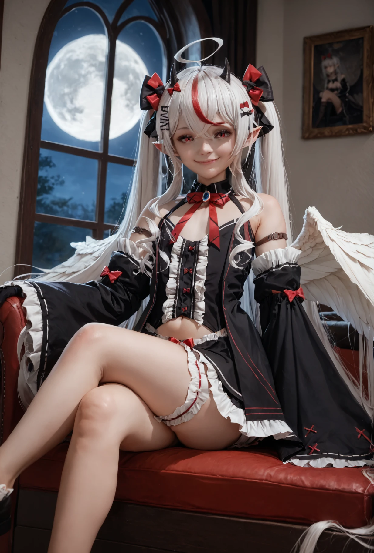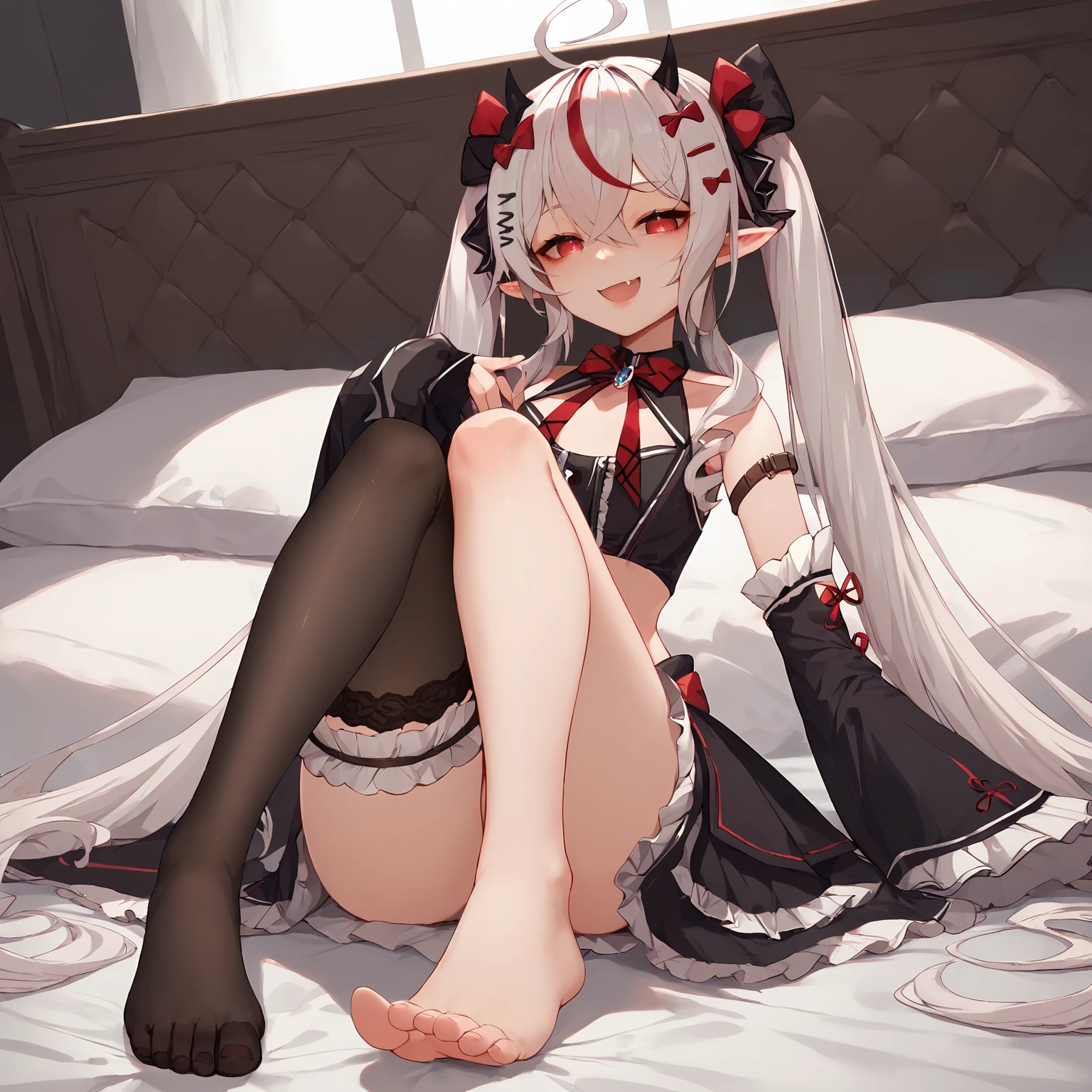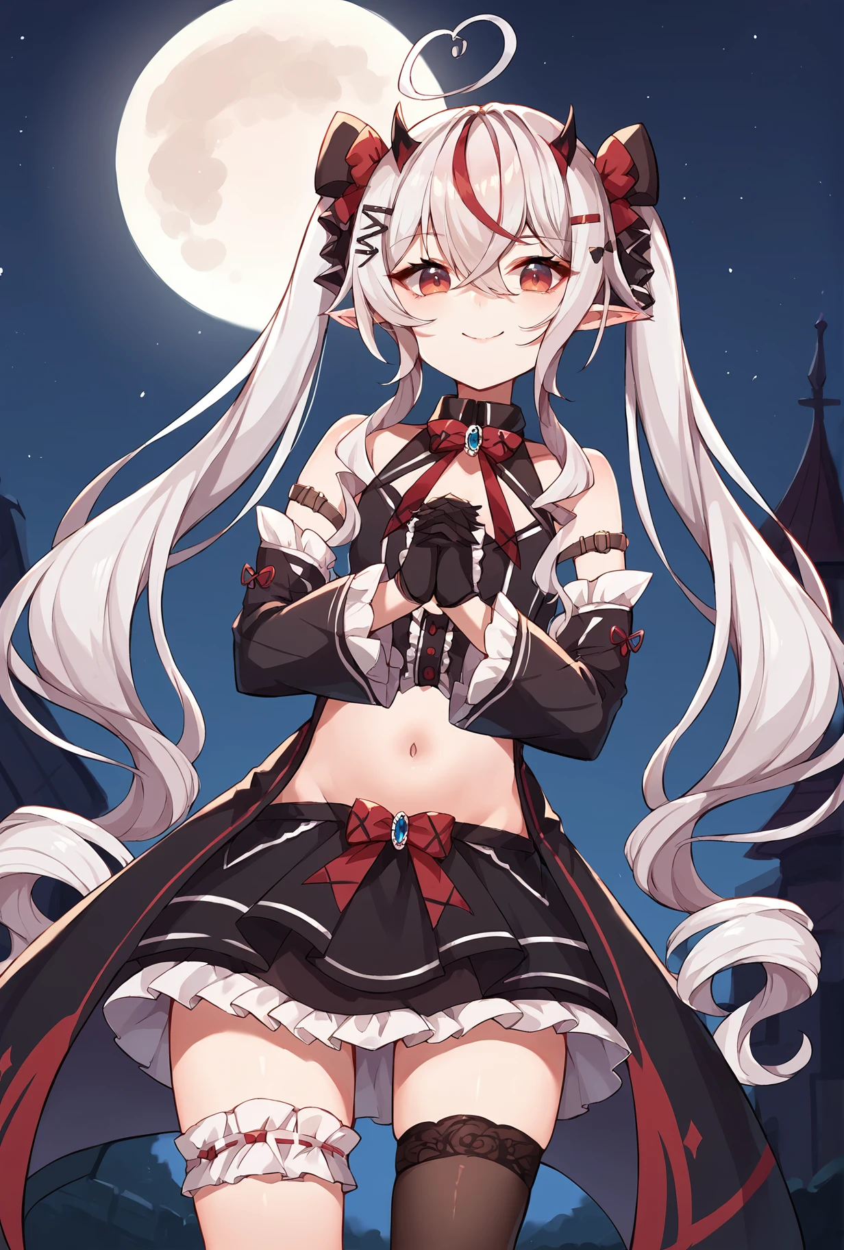 remilianephys, huge ahoge, pointy ears, black hair bow, red hair bow, red neck ribbon, blue brooch, black crop top, center frills, arm belt, detached sleeves, wide black sleeves, sleeves past wrists, black gloves, black frilled skirt, red waist bow, single thighhigh, bridal garter, black footwear, angel wings, black demon wings, heart tail