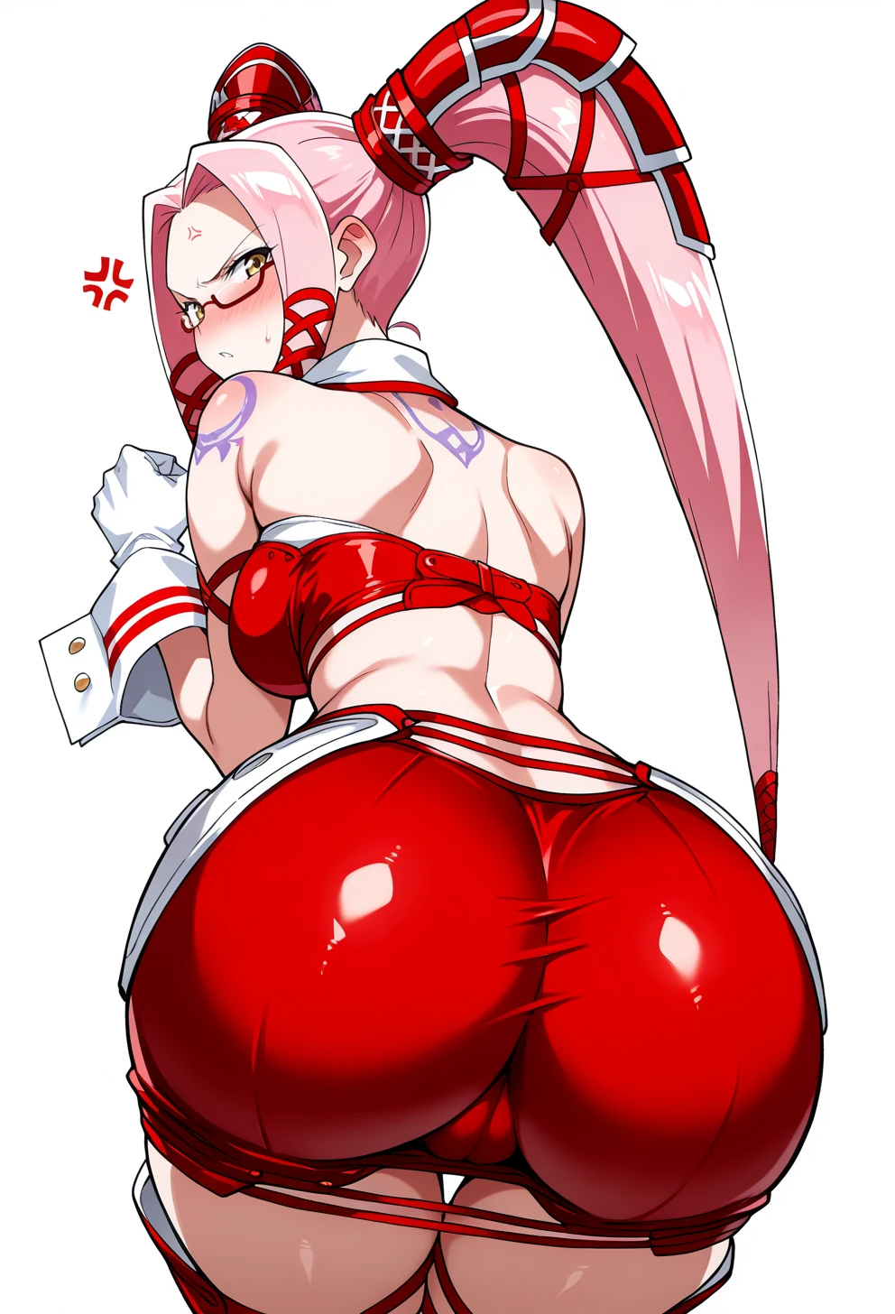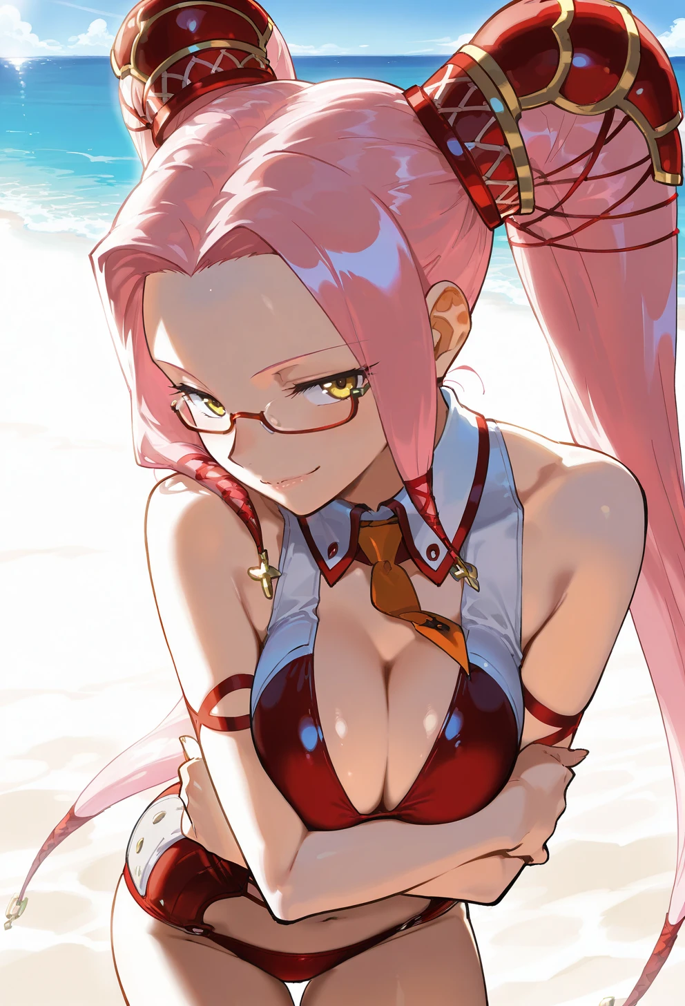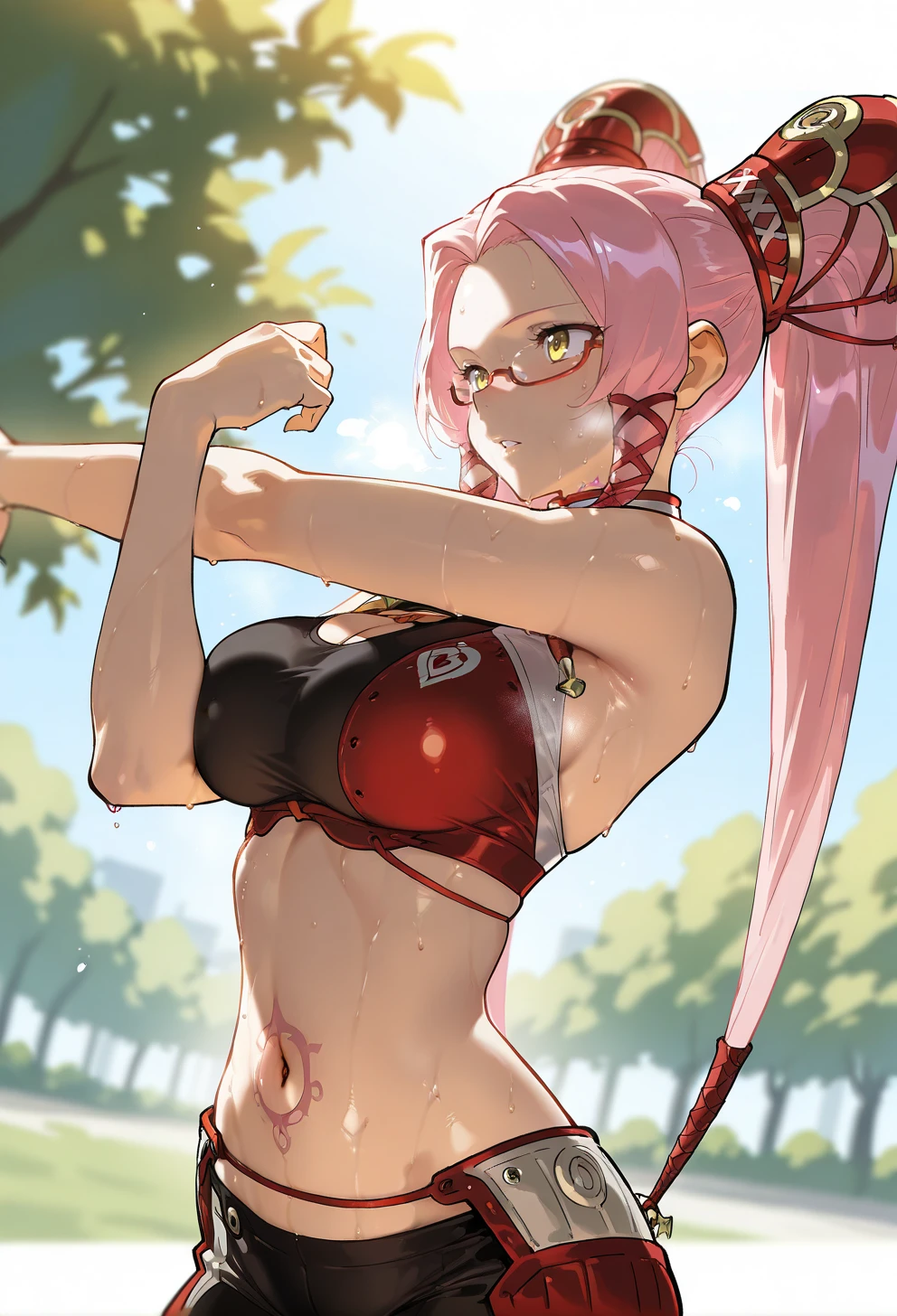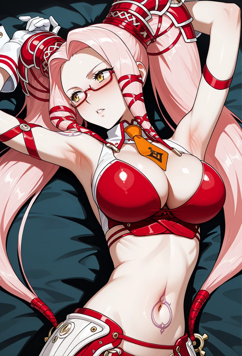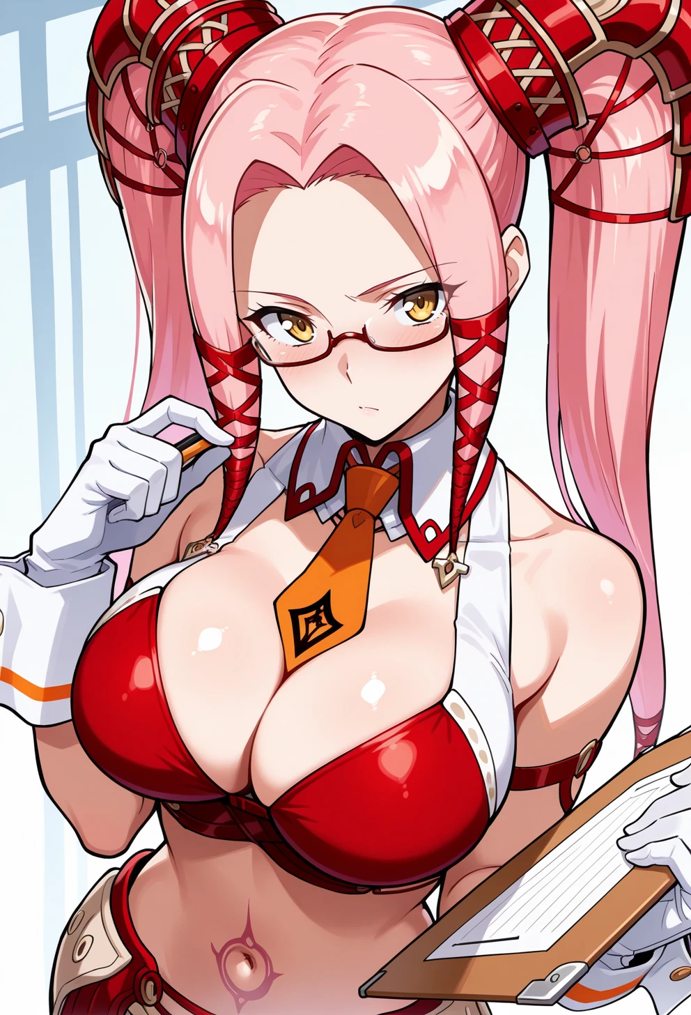 yellow eyes, pink hair, long hair, sidelocks, twintails, red-framed eyewear, under-rim eyewear, semi-rimless eyewear, glasses, tattoo, stomach tattoo,Outfit: