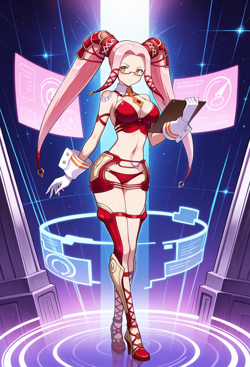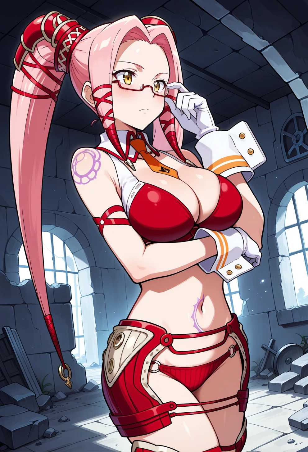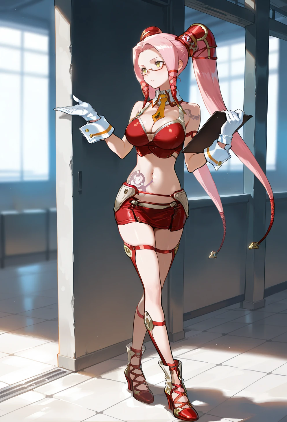 AEPi, yellow eyes, pink hair, long hair, sidelocks, twintails, red-framed eyewear, under-rim eyewear, semi-rimless eyewear, glasses, tattoo, stomach tattoo, hair ornament, detached collar, necktie, bare shoulders, cleavage, crop top, midriff, navel, white gloves, wrist cuffs, panties, miniskirt, red legwear, high heels, red footwear,