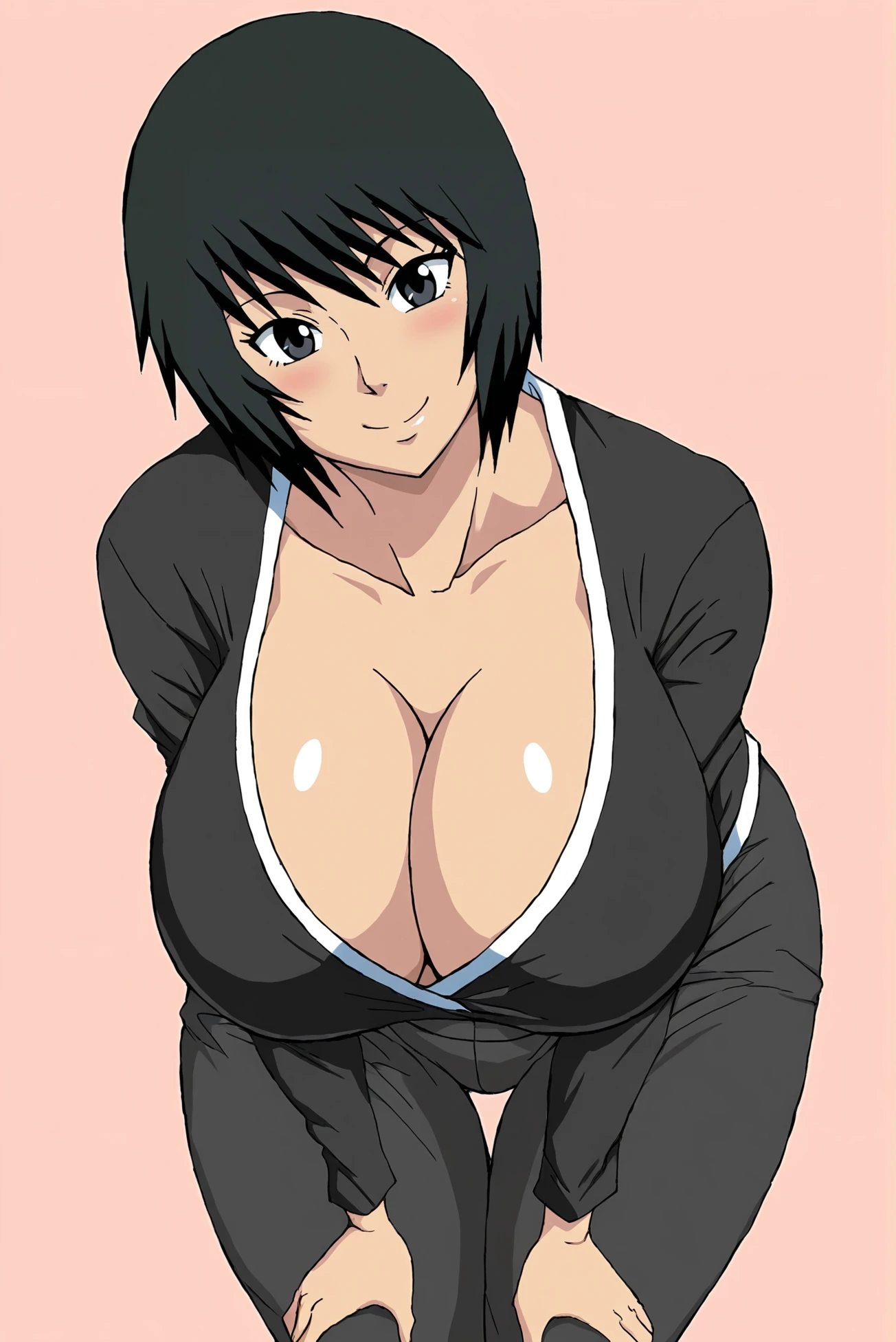 12.静音:Shizune,1girl,solo,black hair,black eyes,short hair,huge breasts/clothes:black kimono