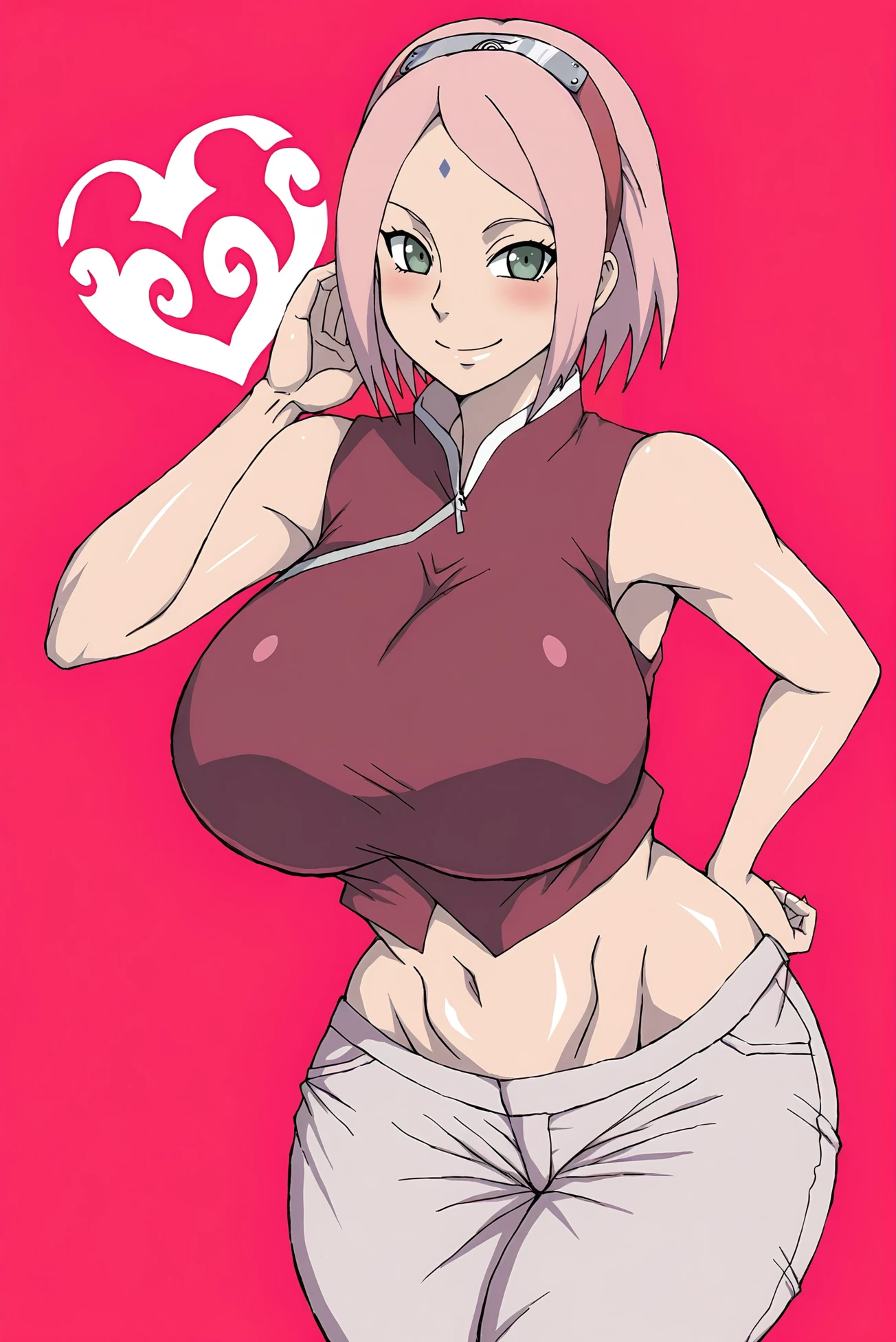 5.春野樱(博人转):haruno sakura(Boruto),1girl,solo,mature female,pink hair,green eyes,short hair,forehead mark,huge breasts/Clothes:bare shoulders, hairband, pants,midriff, groin, sleeveless,