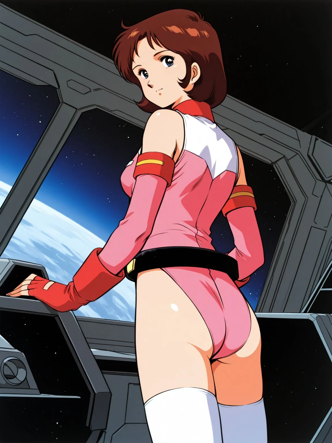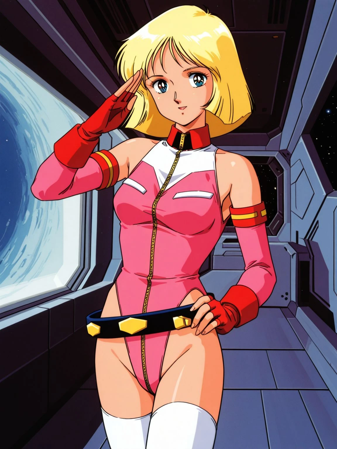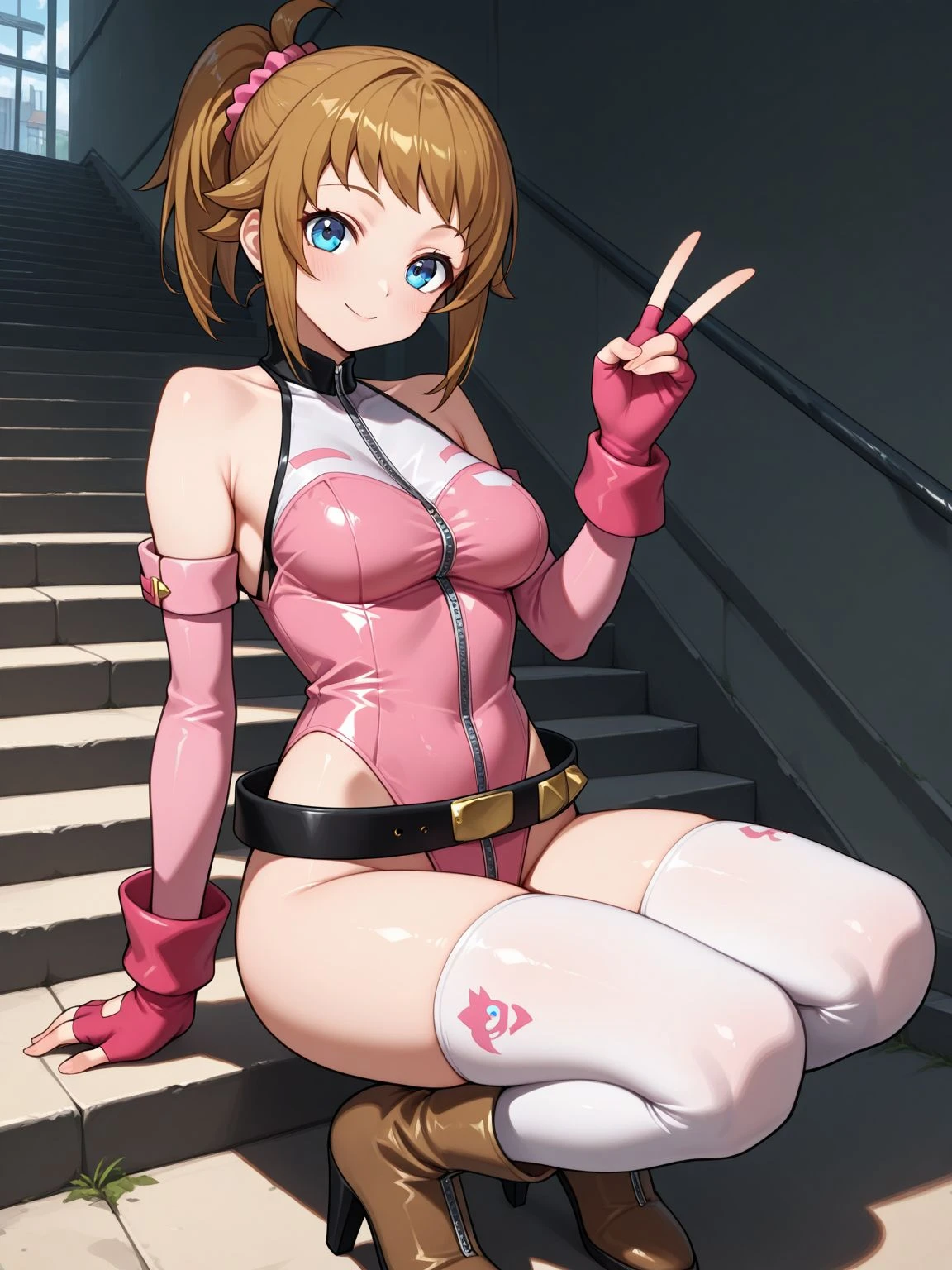 reileopink,pink leotard,leotard,highleg,highleg leotard,sleeveless turtleneck,bare shoulders,pink sleeves,detached sleeves,gloves,fingerless gloves,red gloves,belt,black belt,loose belt,thighhighs,white thighhighs,boots,brown footwear,high heels,high heel boots,