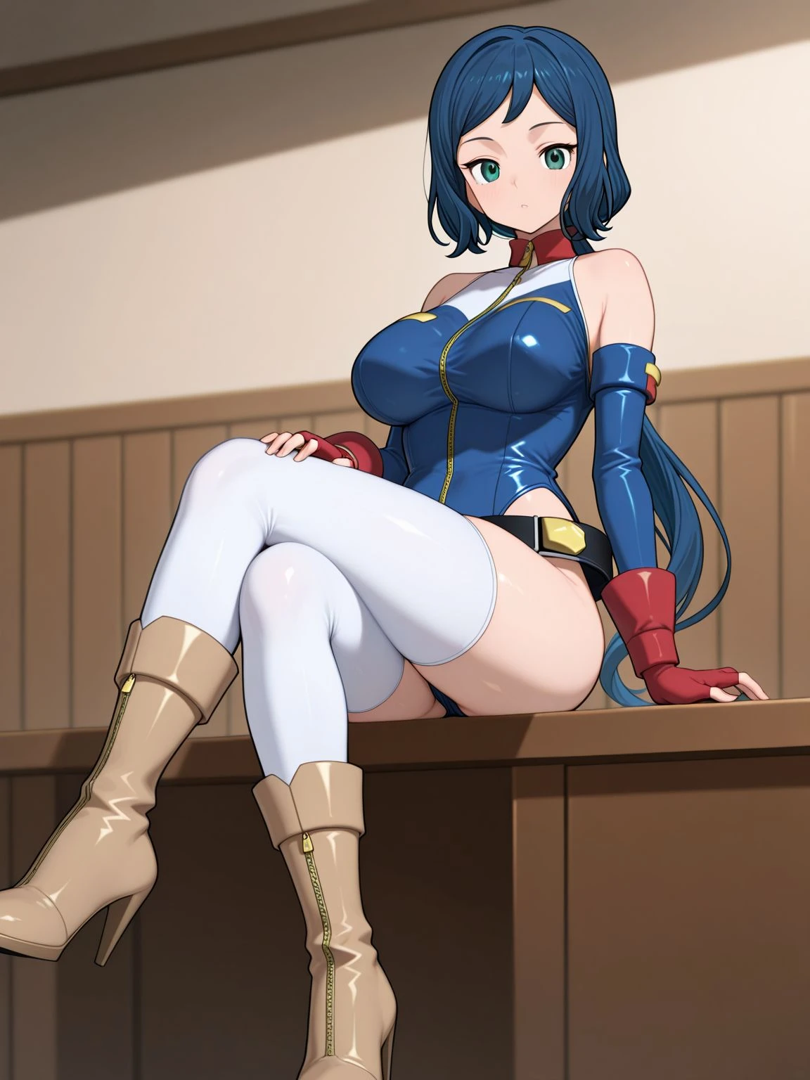 reileoblue,blue leotard,leotard,highleg,highleg leotard,sleeveless turtleneck,bare shoulders,blue sleeves,detached sleeves,gloves,fingerless gloves,red gloves,belt,black belt,loose belt,thighhighs,white thighhighs,boots,brown footwear,high heels,high heel boots,