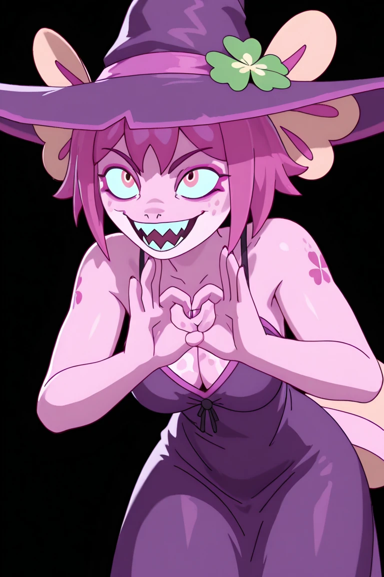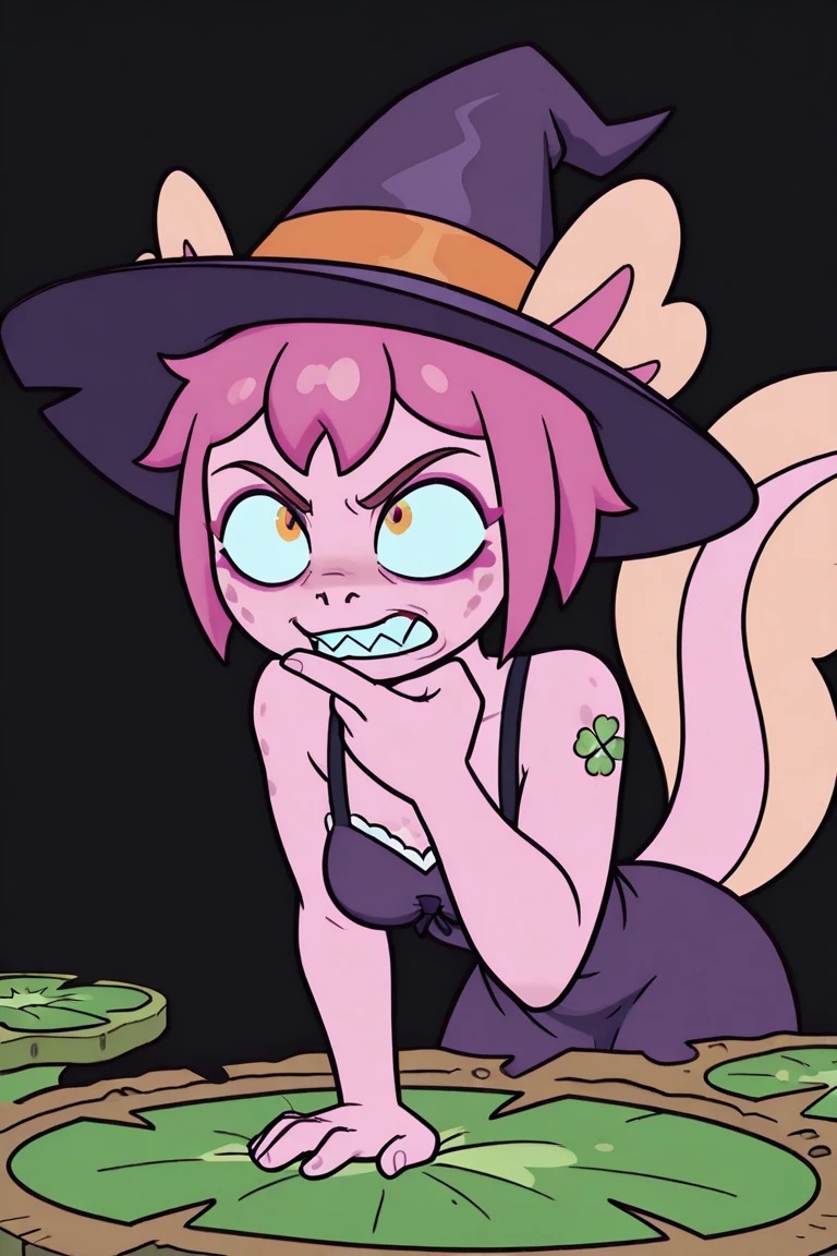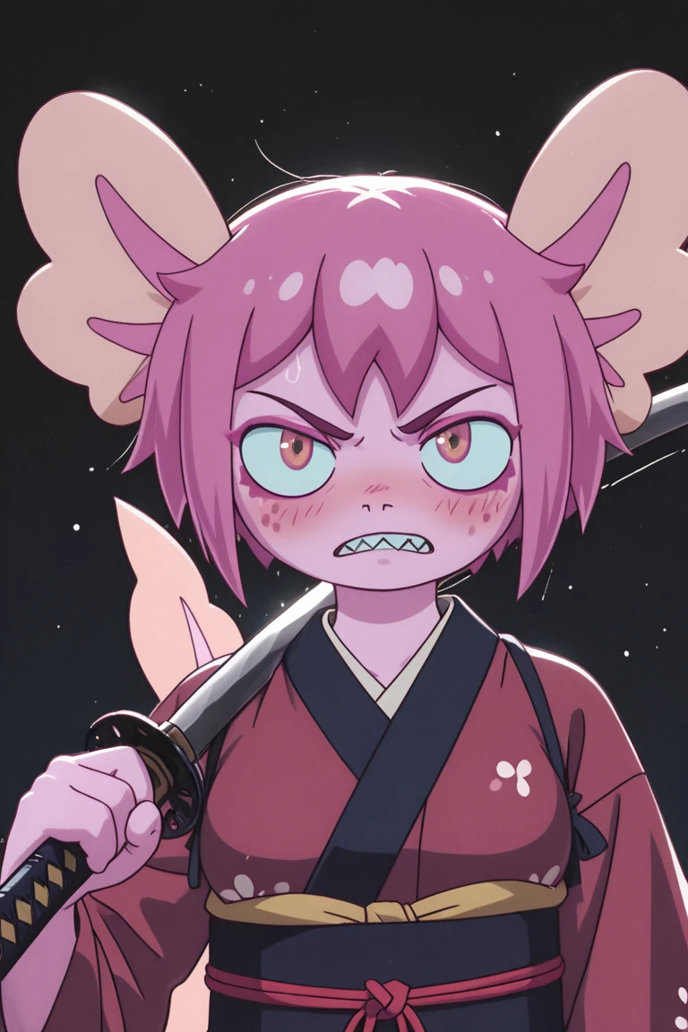 1girl,short hair,pink skin, pink hair,tail ,furry,sharp teeth