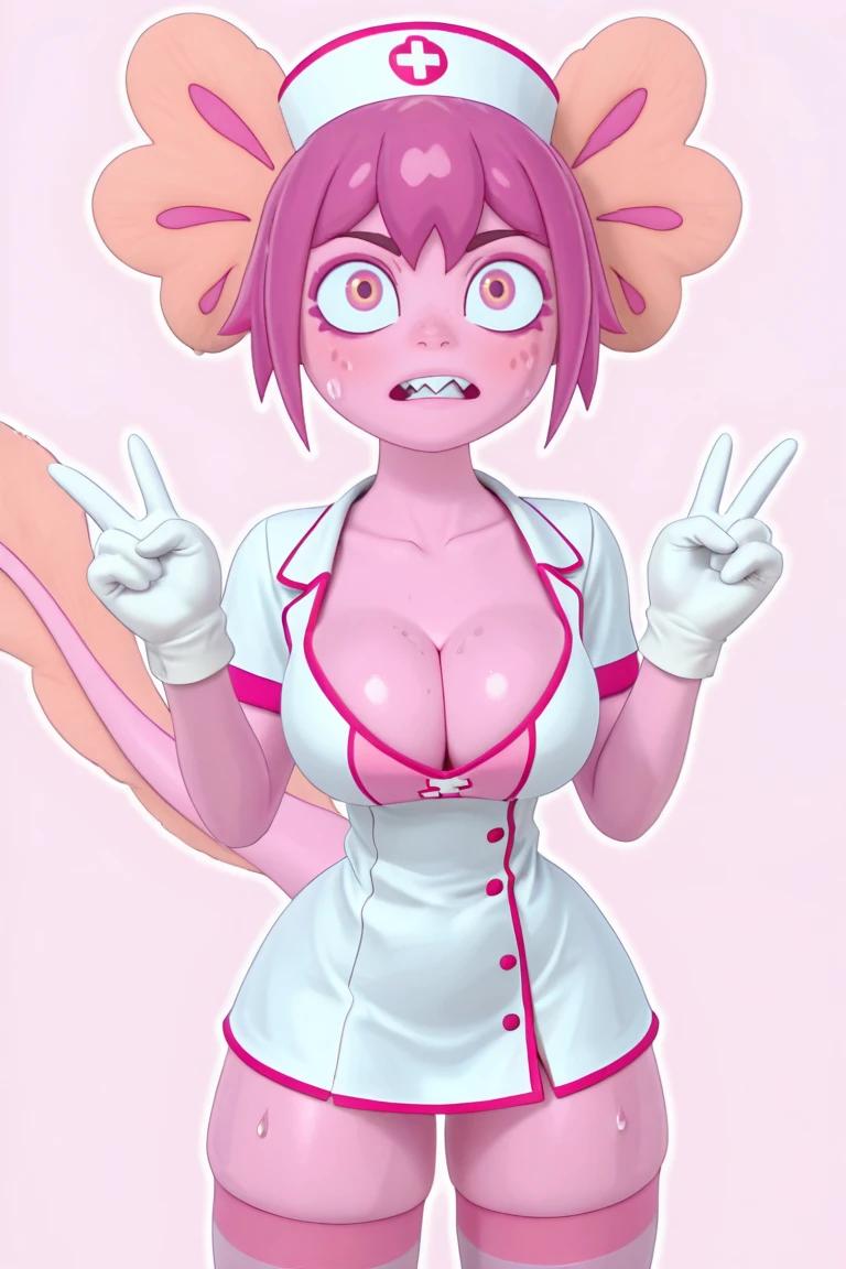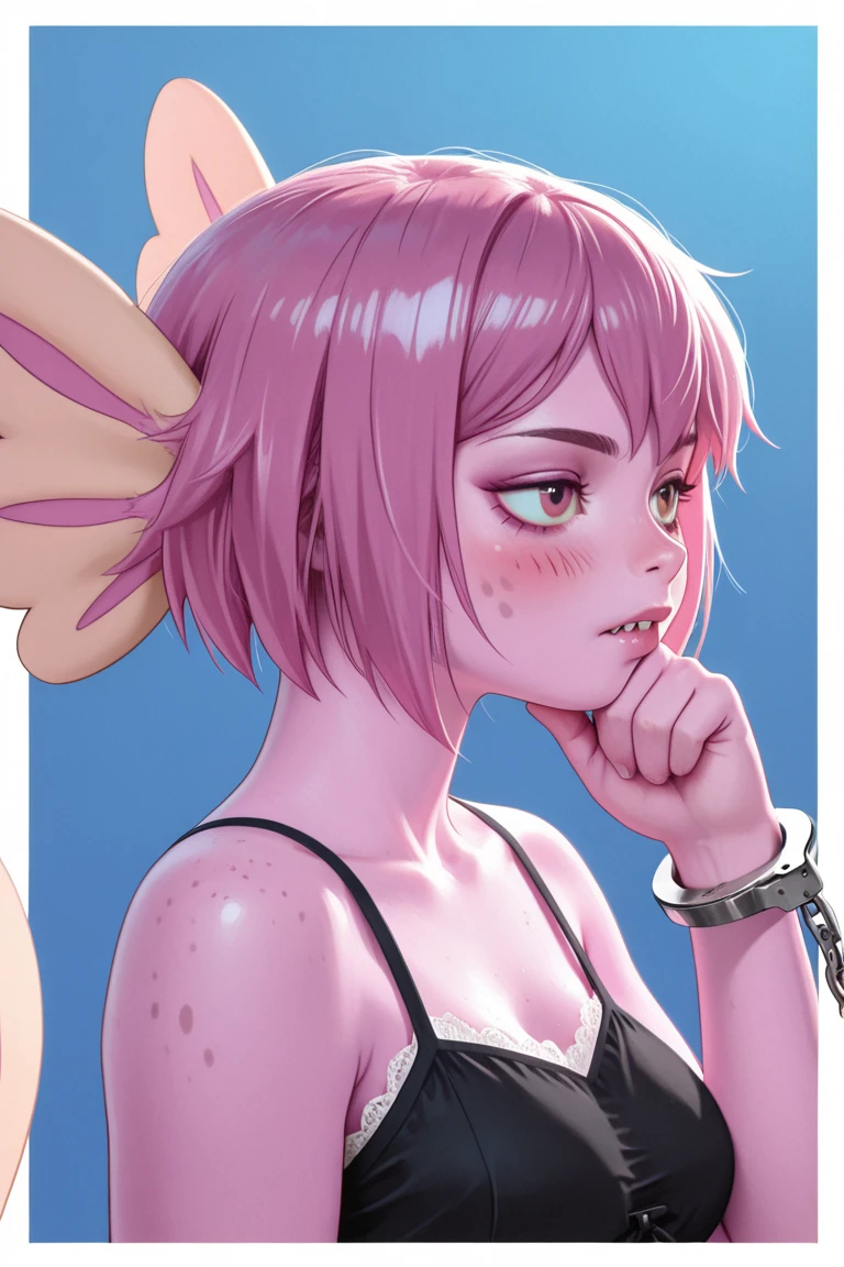 1girl,short hair,pink skin, pink hair,tail ,furry,