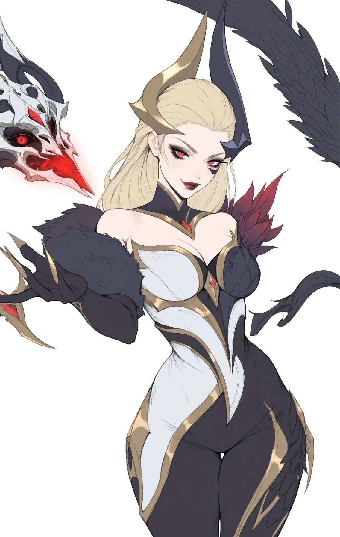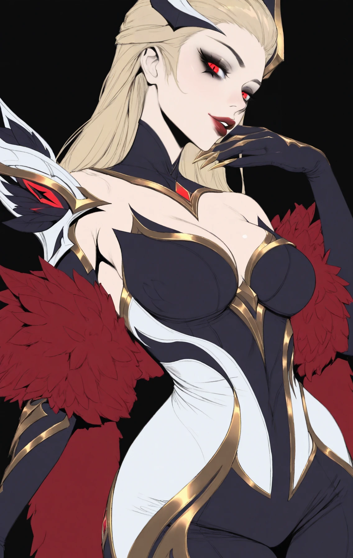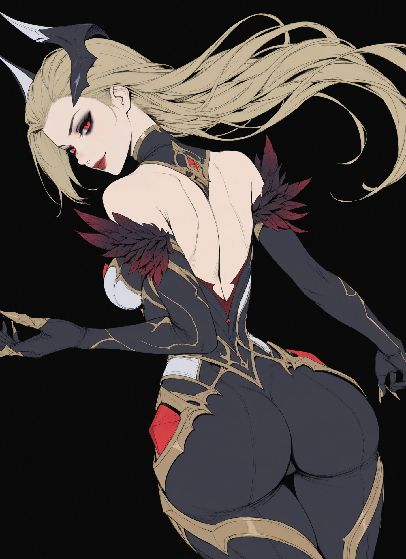 Coven_Eve,demon girl,red eyes,long blonde hair,side part,red lips,sharp eyes,dark gothic armor,coven outfit,horns,dark blonde bodysuit,feather armor,dark feathers,bare shoulders,(elegant),dark eye makeup,heels, elbow gloves,long golden nails
