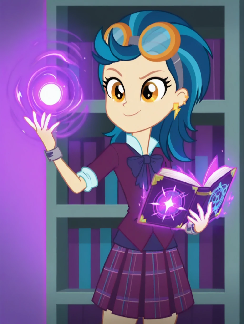 Indigo_Zap(EQG), 1girl, solo, blue hair, multicolored hair, orange eyes, smile, jewelry, earrings, goggles, bow, school uniform, skirt, socks, footwear,