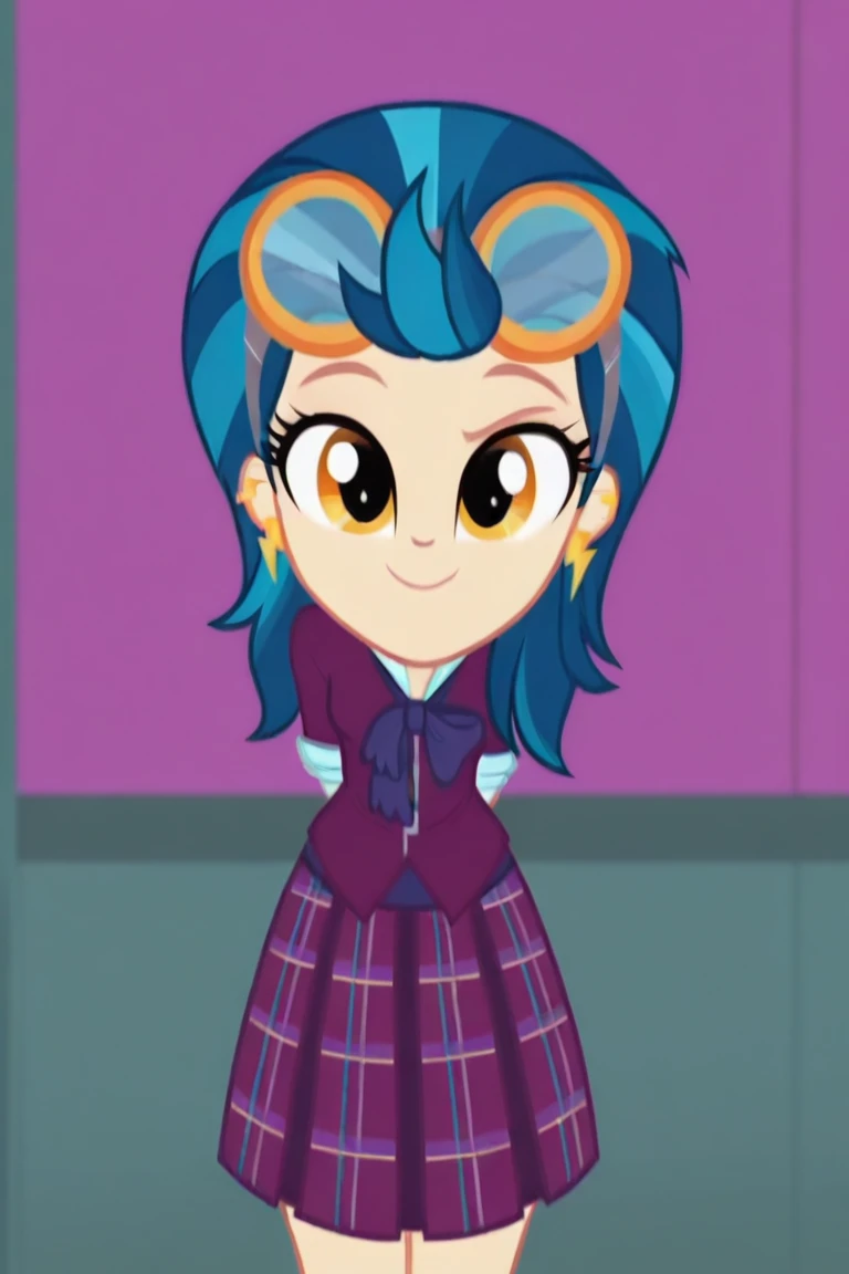 Indigo_Zap(EQG), 1girl, solo, blue hair, multicolored hair, orange eyes, smile, jewelry, earrings, goggles, bow, school uniform, skirt, socks, footwear,Weigh: 0.7 - 1.0
