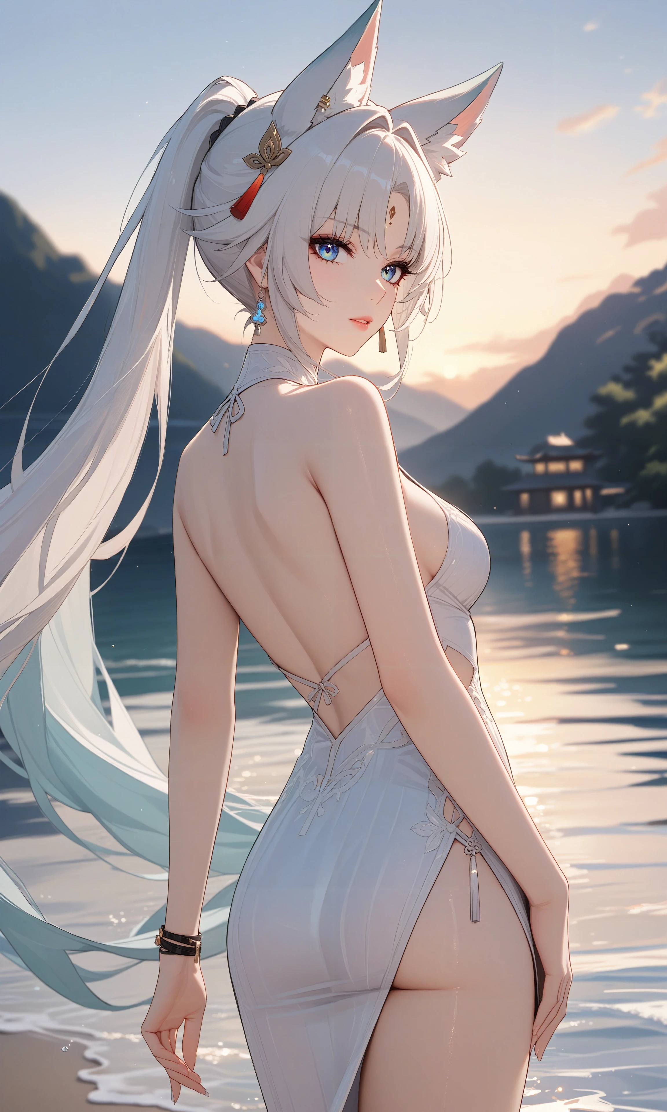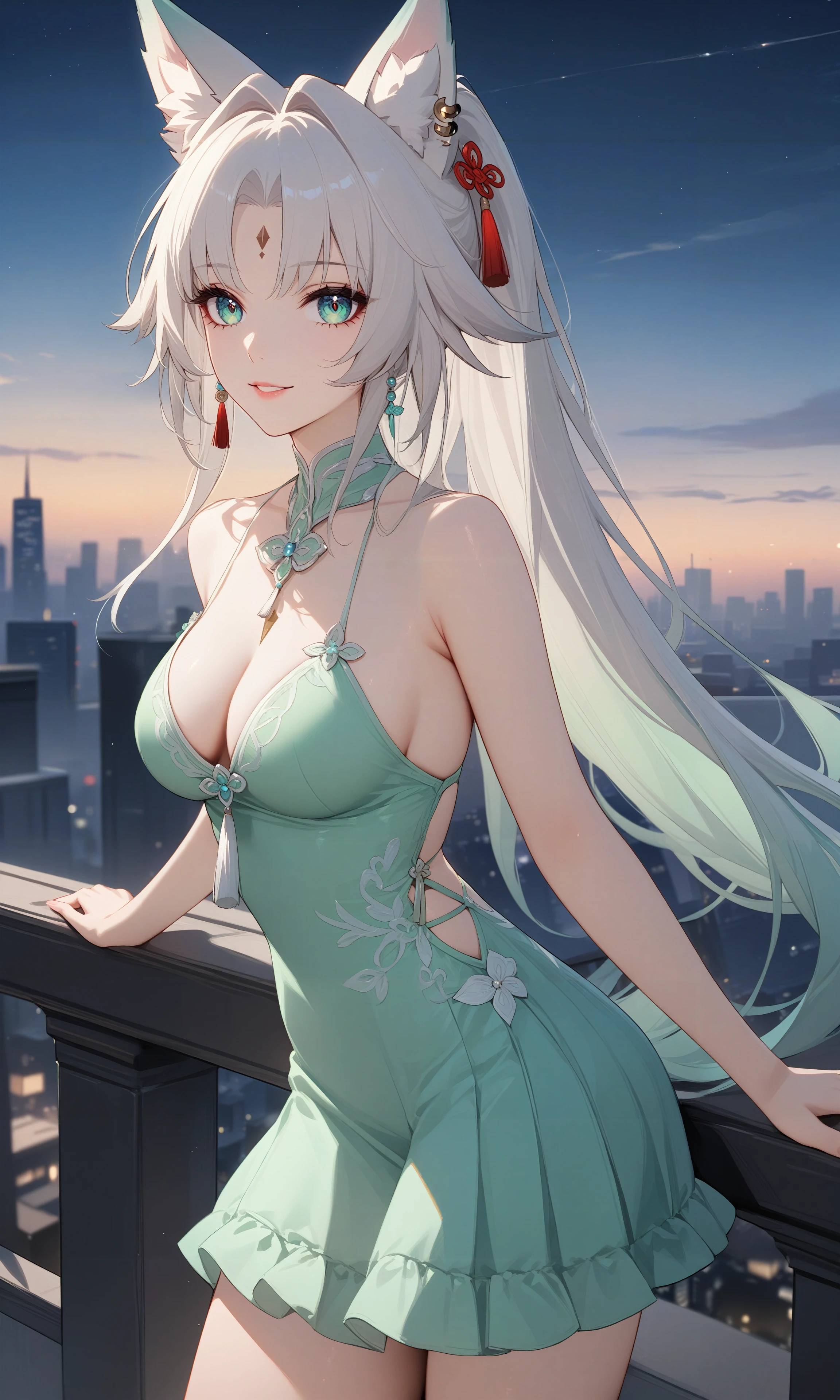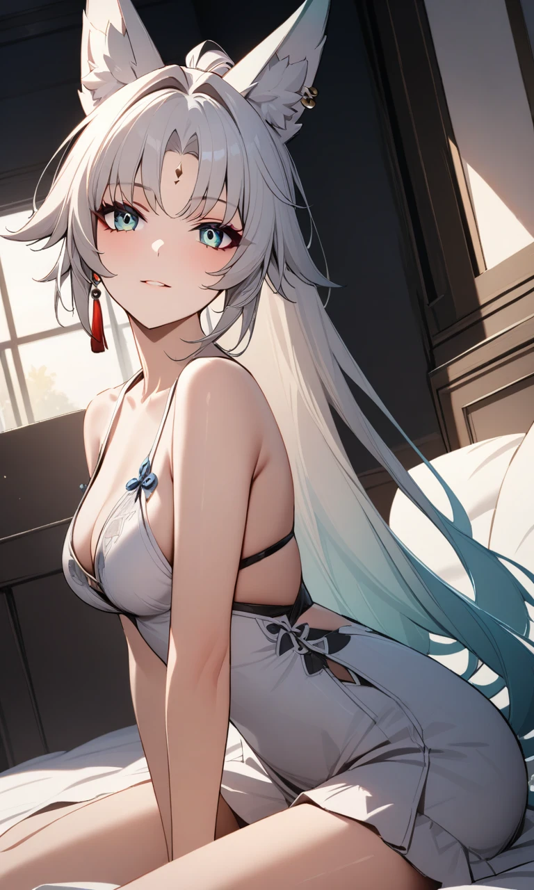 tj_feixiao,animal ears,long hair,ponytail,multicolored hair,white hair,red eyeliner,aqua_eyes,ringed eyes,forehead mark,ear piercing,tassel hair ornament,tassel earring,