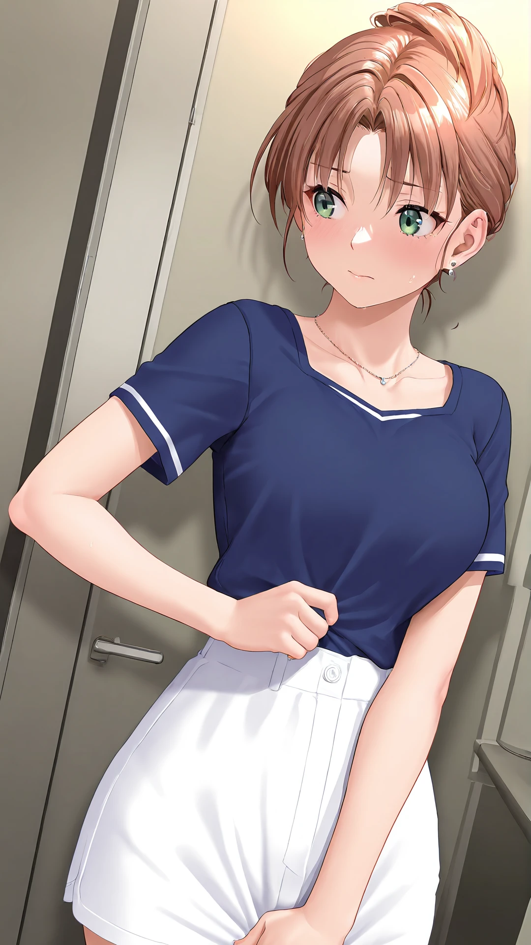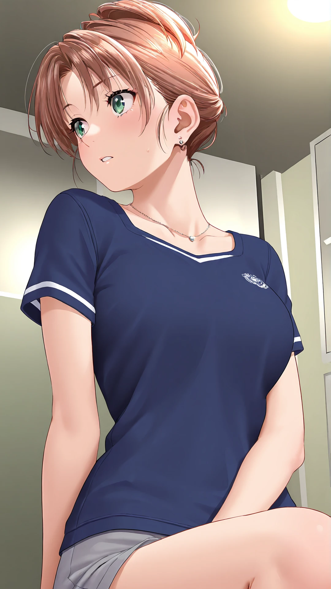 Itou Sayaka,1girl,solo,green eyes,jewelry,brown hair,necklace,earrings,shirt,short sleeves,short hair,