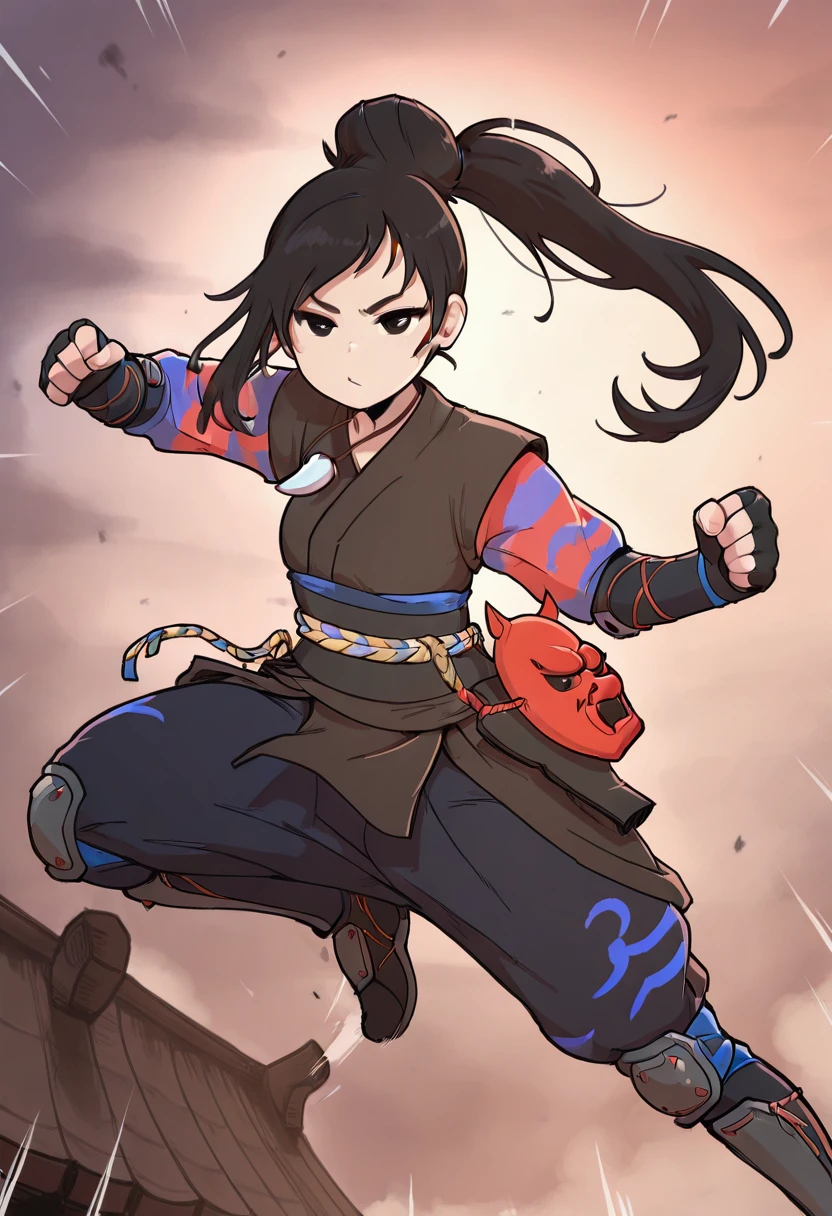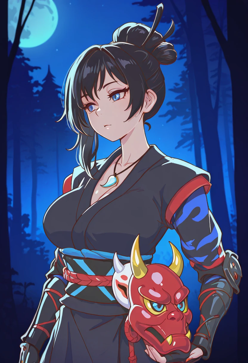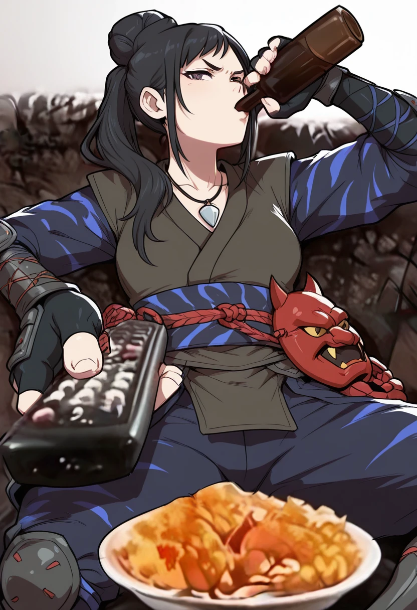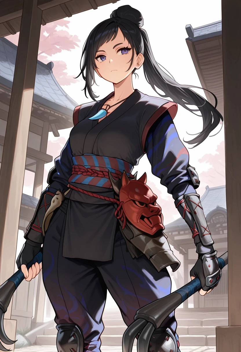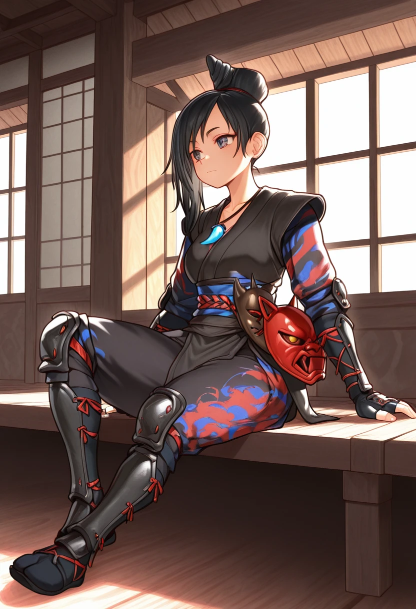 japanese clothes, armor, necklace, sash, kimono, pants, shin guards, knee pads, arm guards, fingerless gloves, mask on belt,
