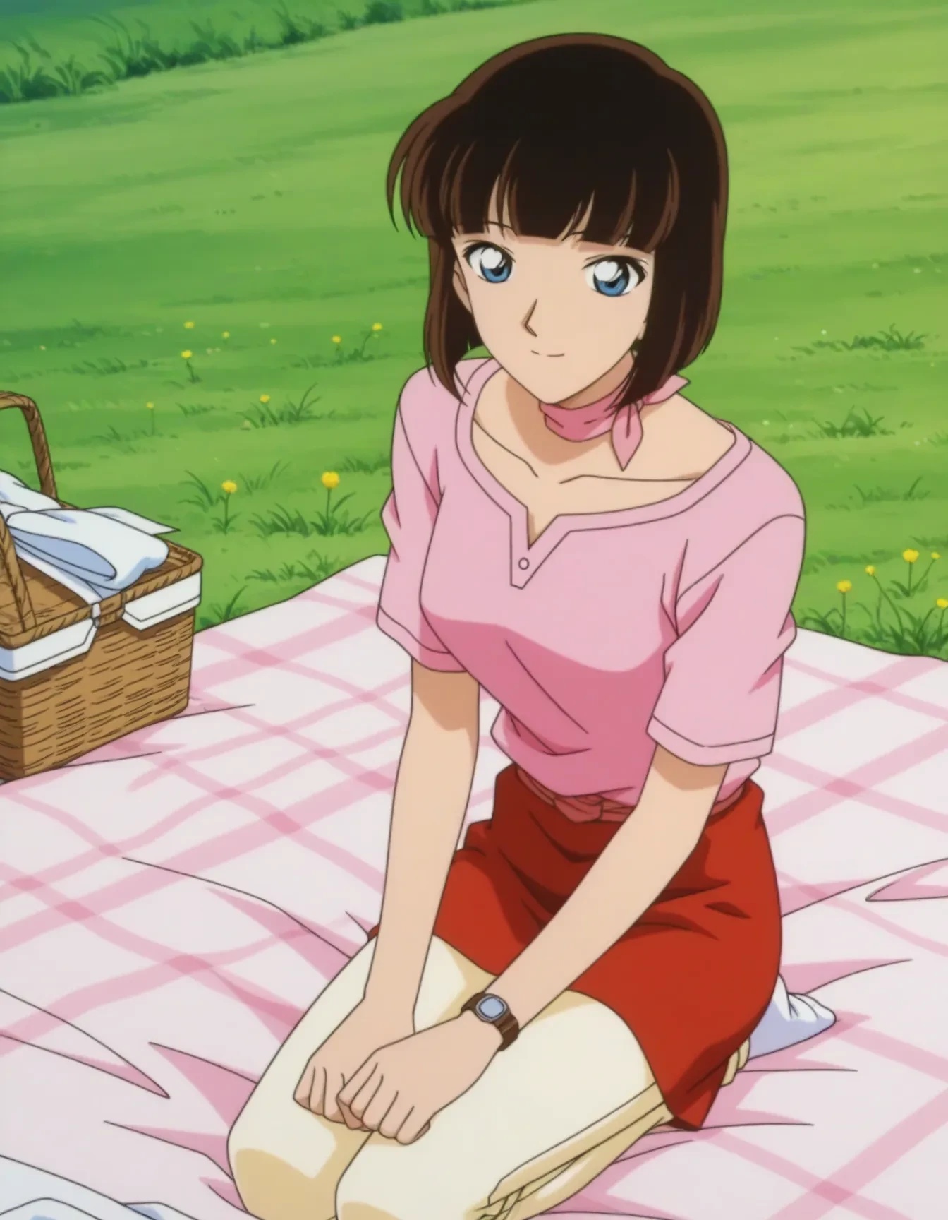 blunt bangs,pink shirt, choker,short sleeves,collarbone,red skirt,pink scarf,white pants,pantyhose,pants under skirt,wristwatch,