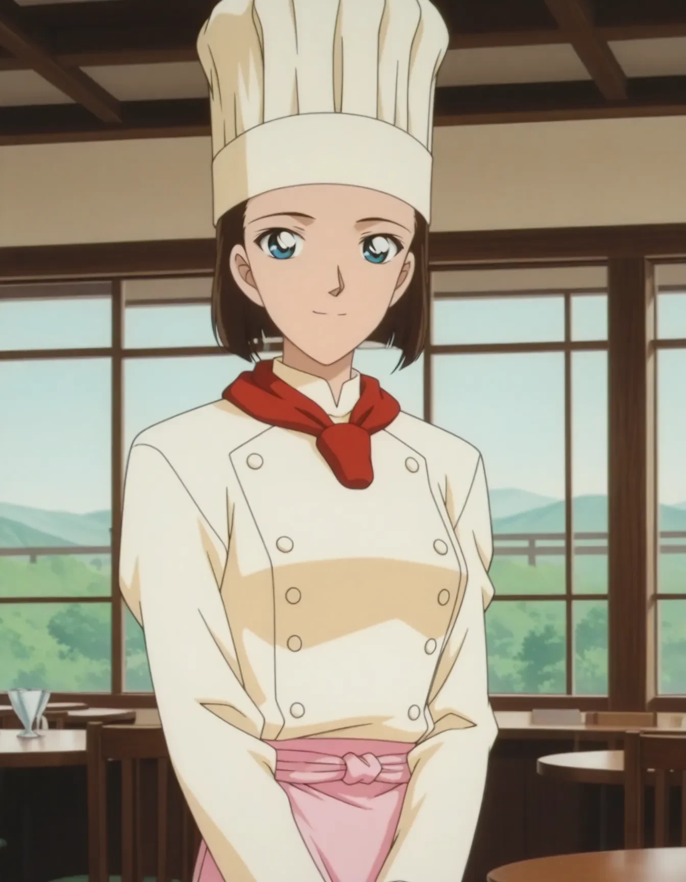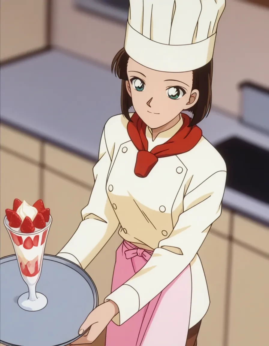 forehead,chef,chef hat,red neckerchief,white jacket,long sleeves,double-breasted,buttons,lightpink waist apron,brown pants,dress pants,