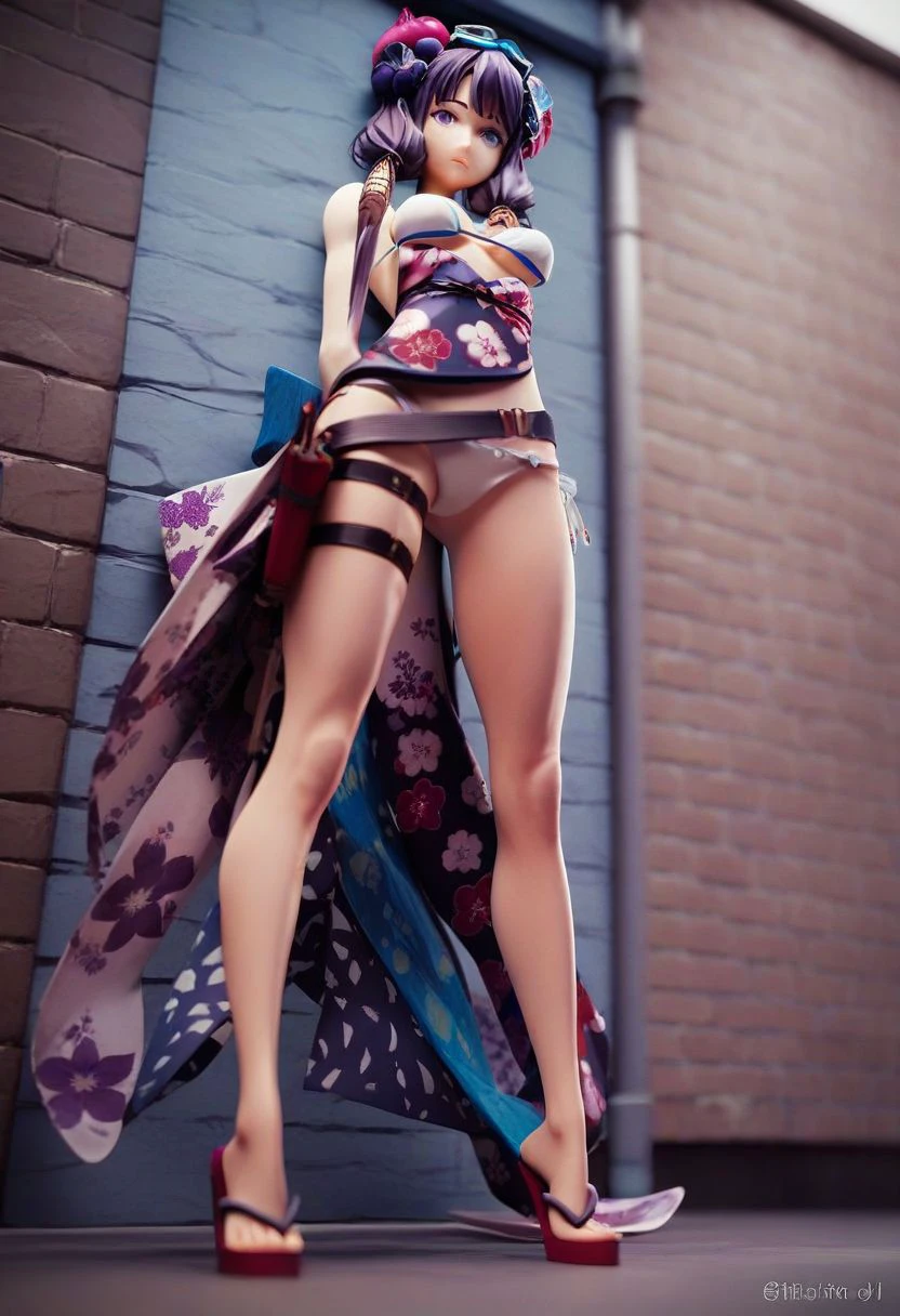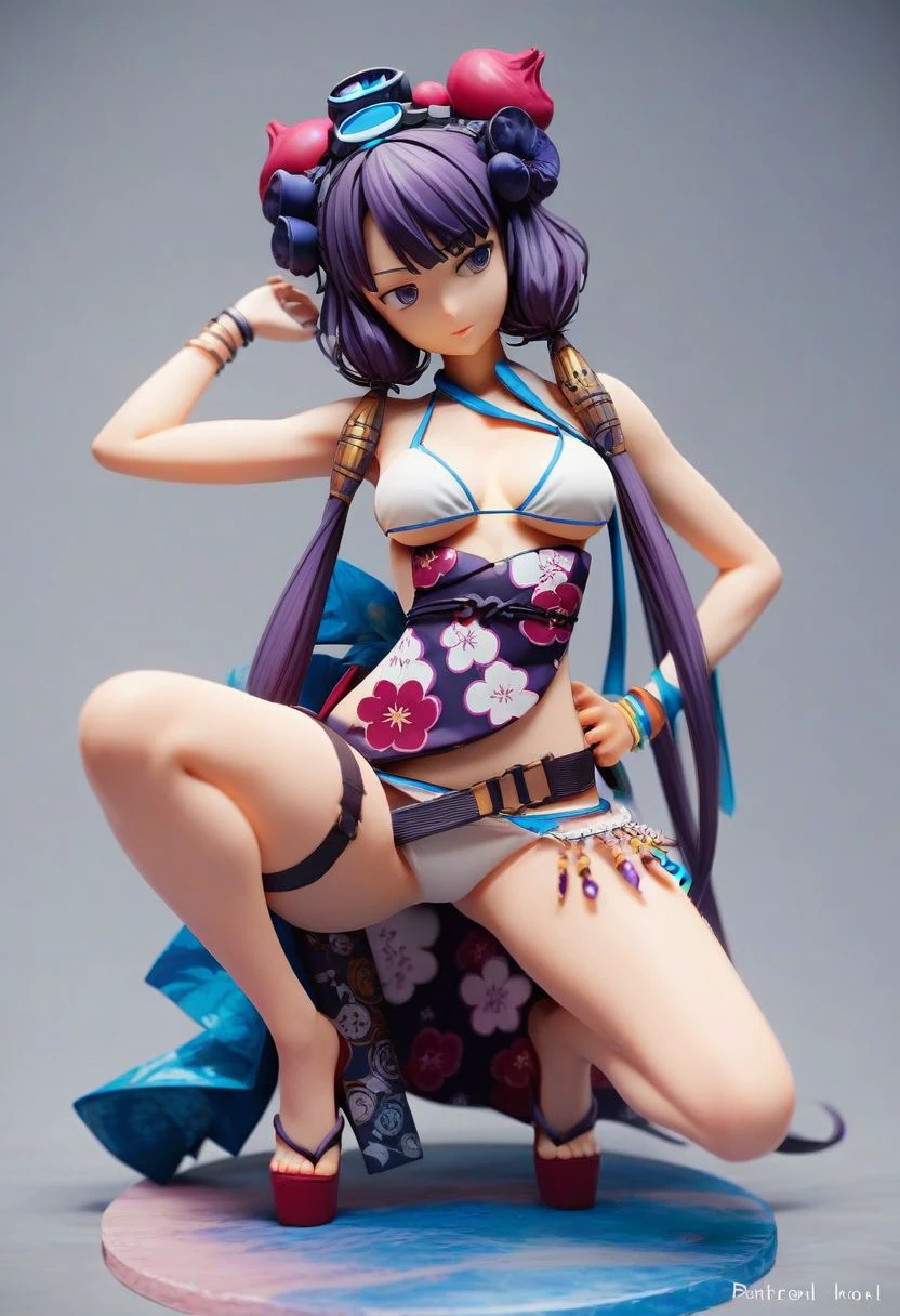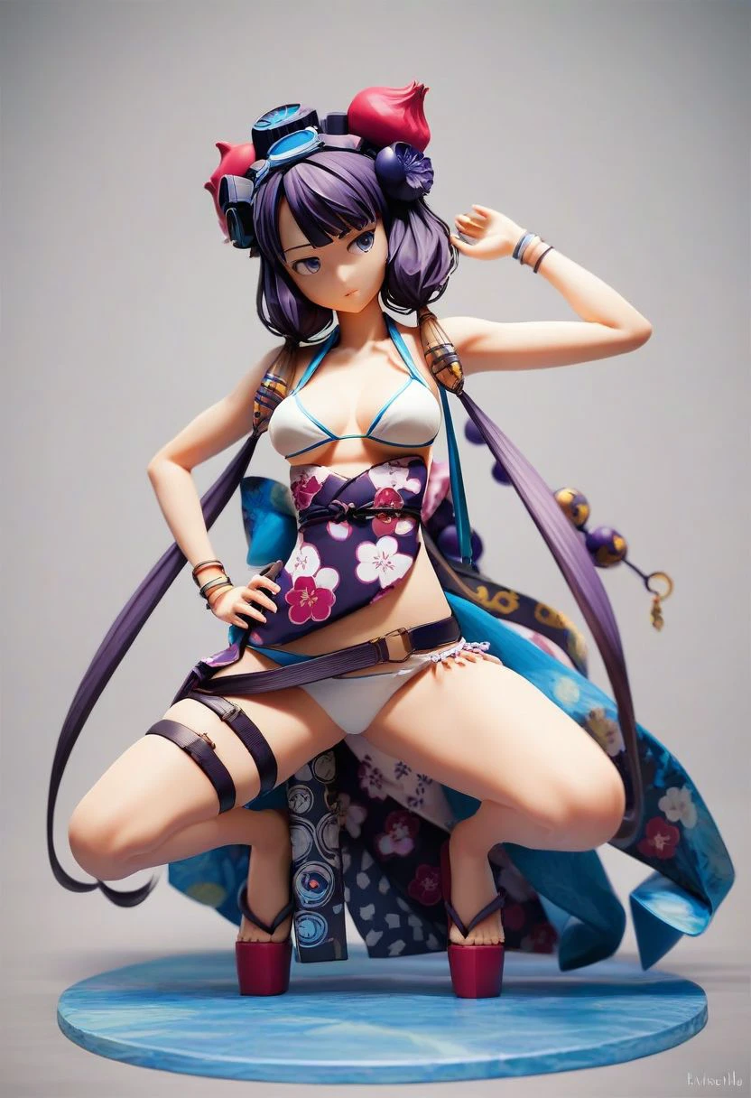 1girl, swimsuit, bikini, purple hair, white bikini, goggles on head, goggles, hair ornament, bracelet, jewelry, long hair, bangs, breasts, floral print, thigh strap, platform footwear, sash, belt, bare shoulders, sandals, beads, twintails, standing, full body