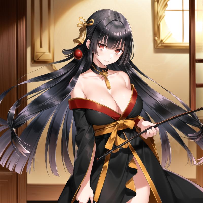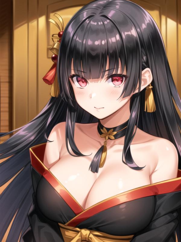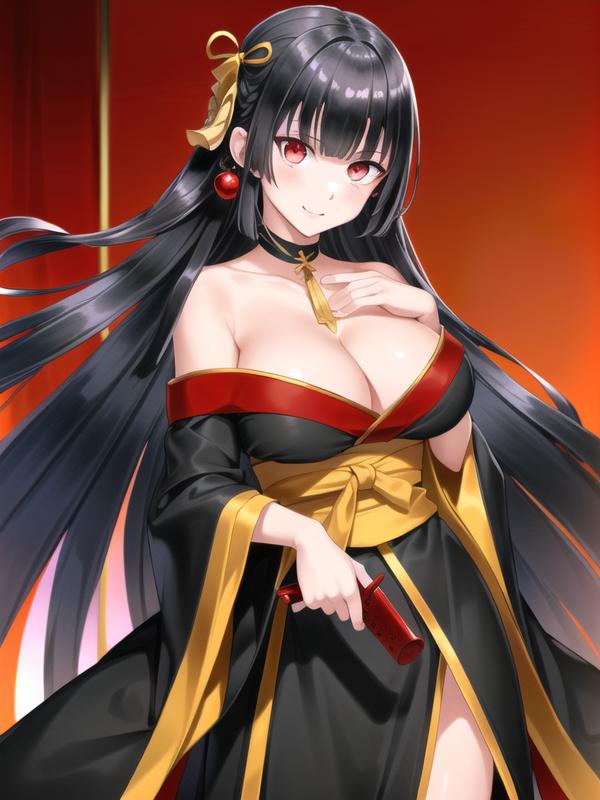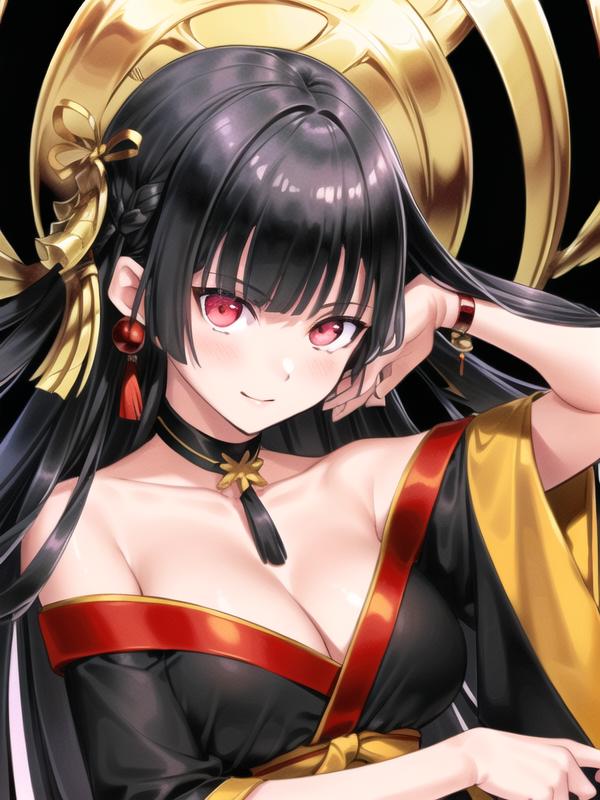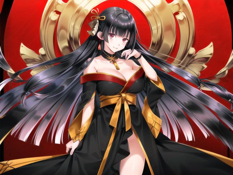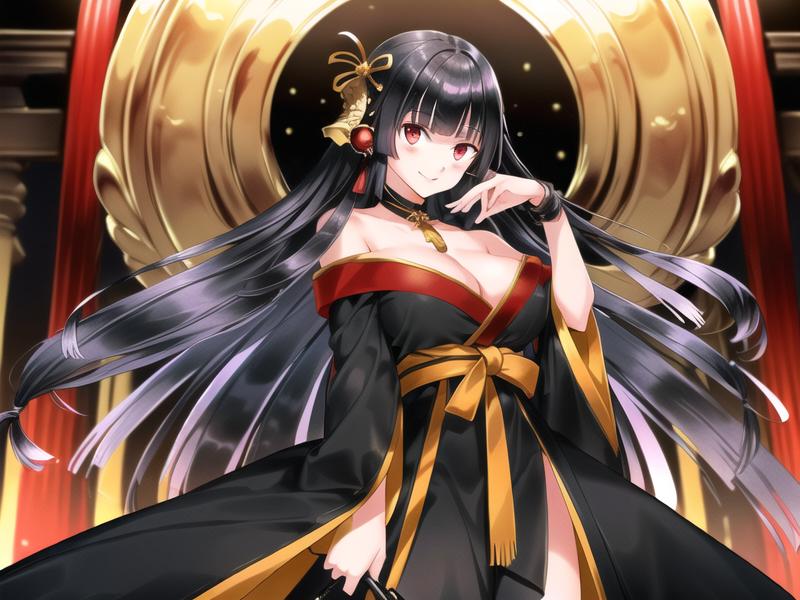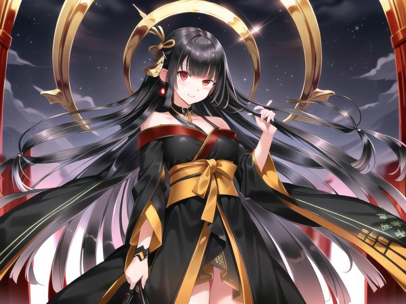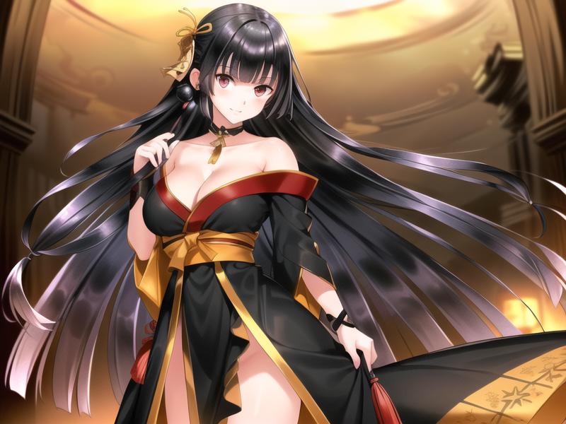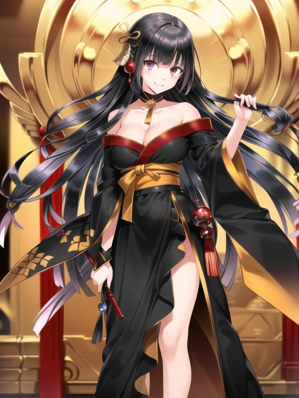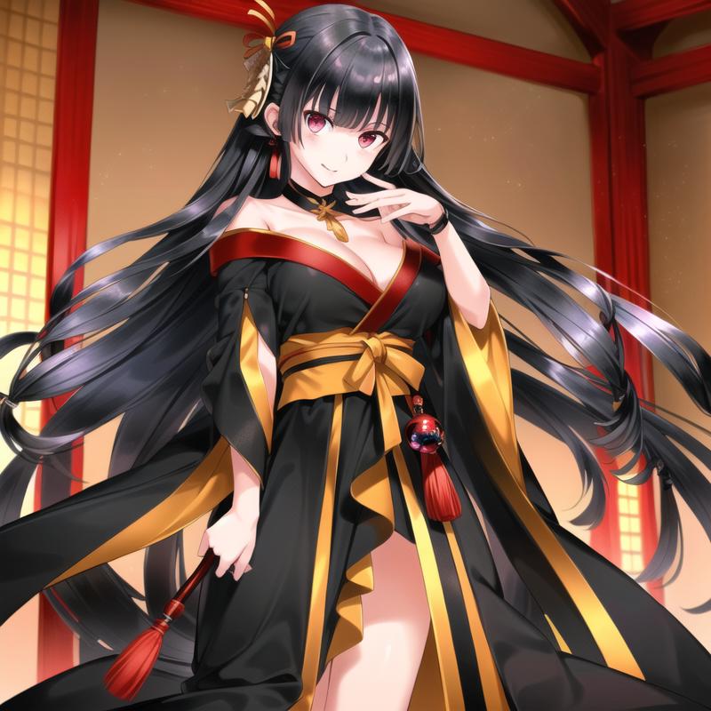 tachibanayama,black hair, long hair,hair ornament, black kimono,