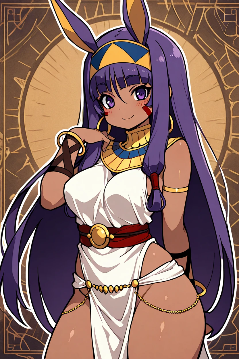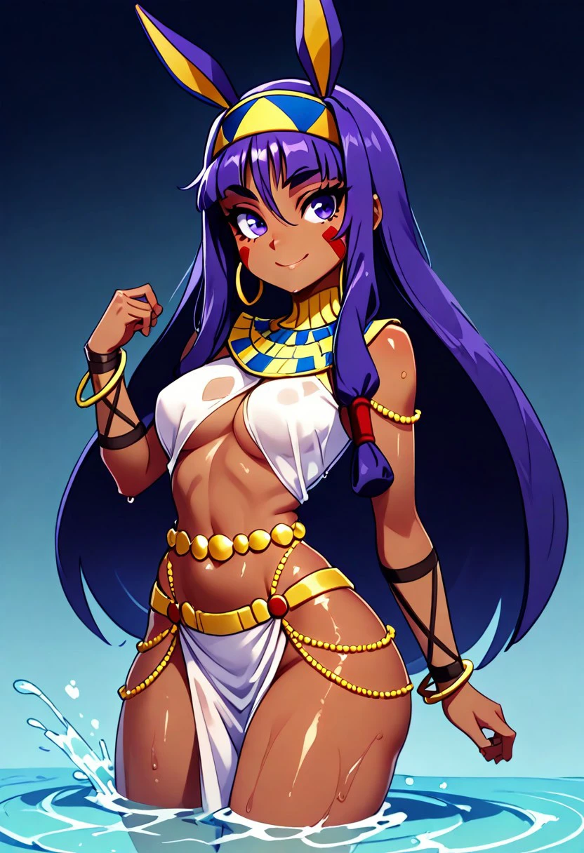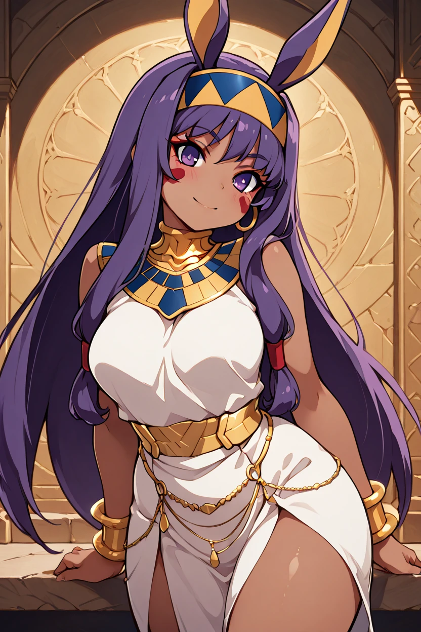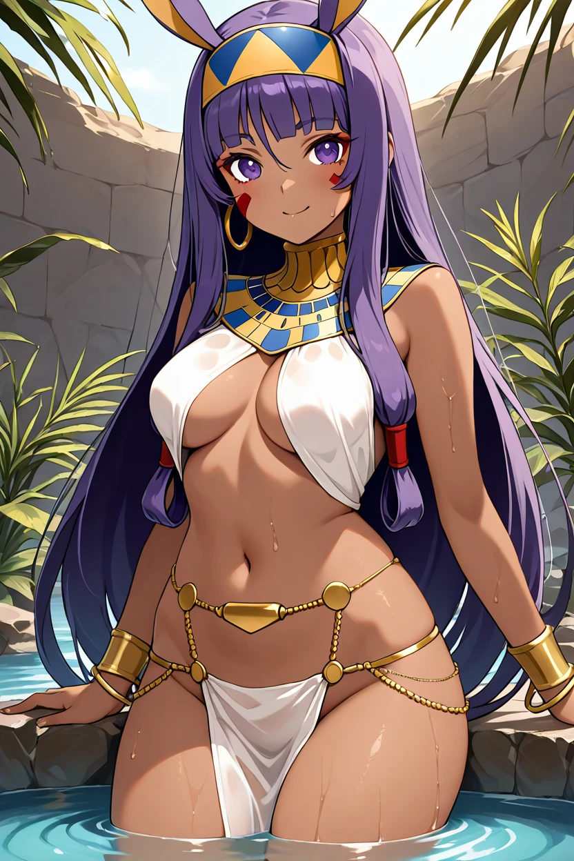 zzNitocris, purple hair, purple eyes, animal ears, dark skin, long hair, facial mark, hairband, jewelry, bracelet, egyptian clothes, thighs, belly chain, usekh collar,