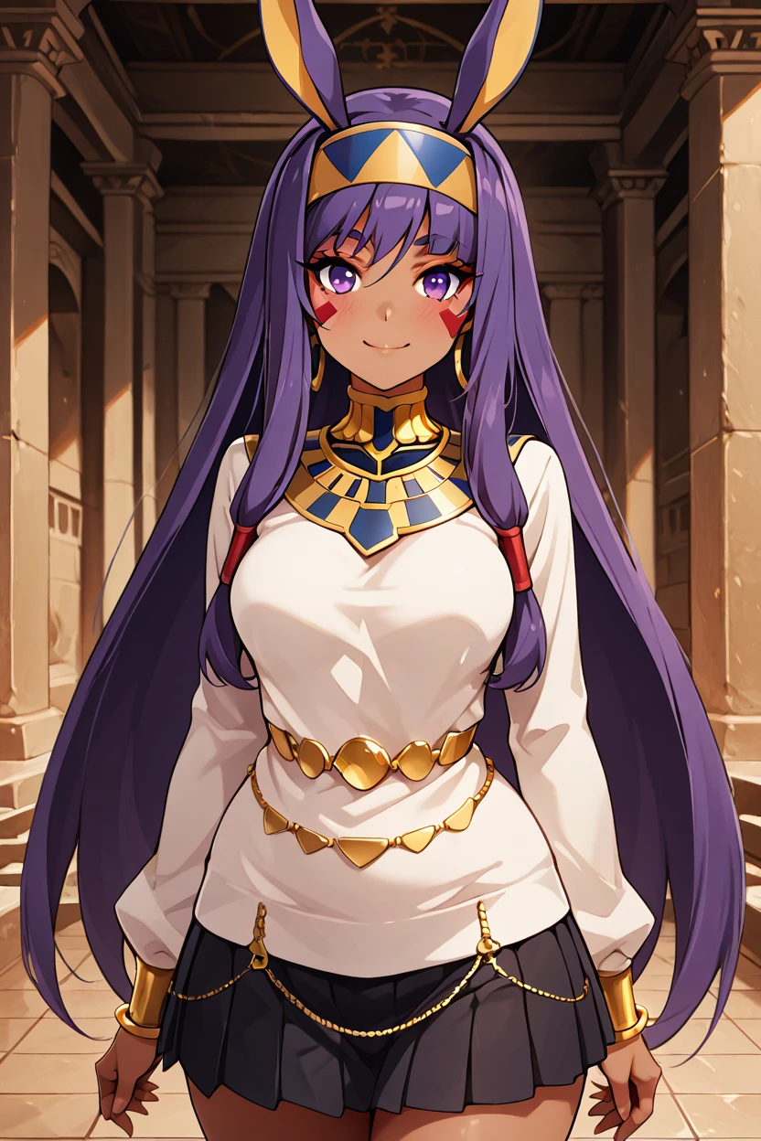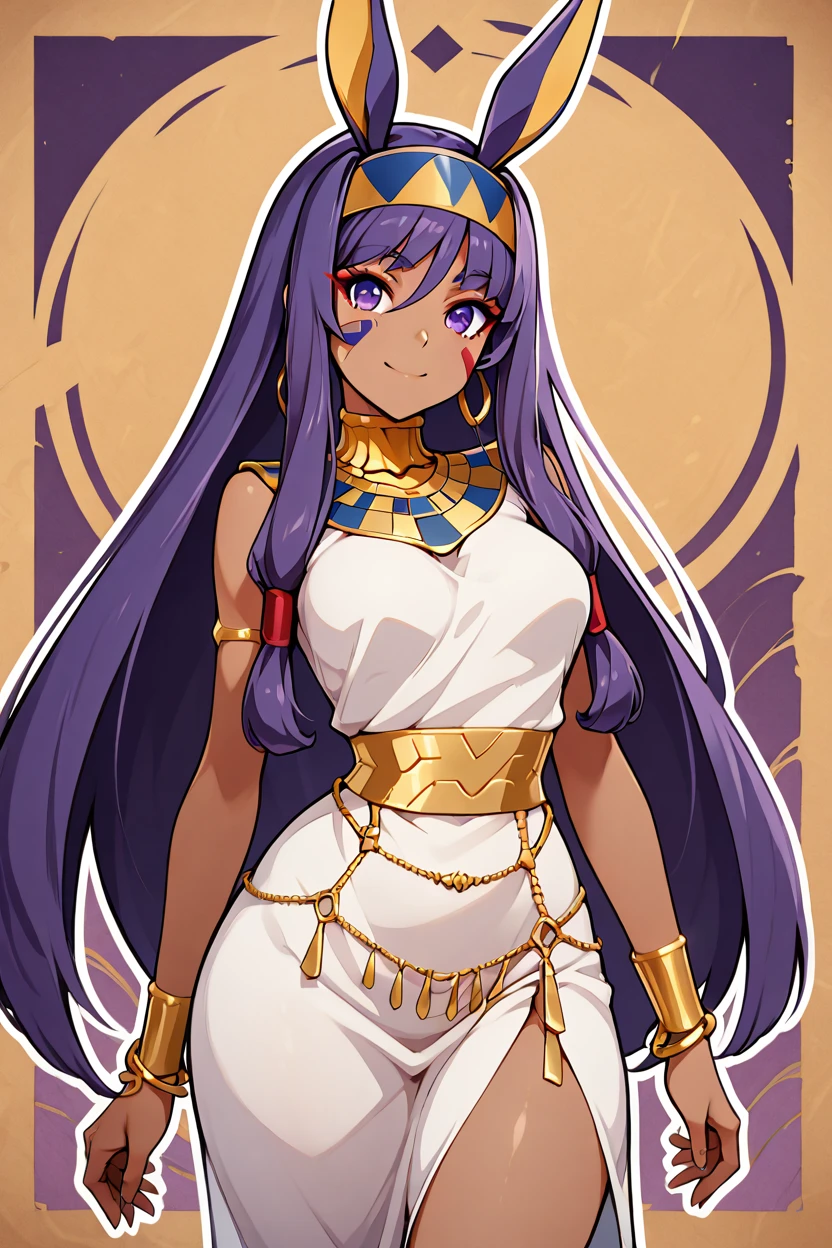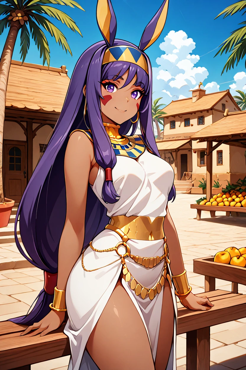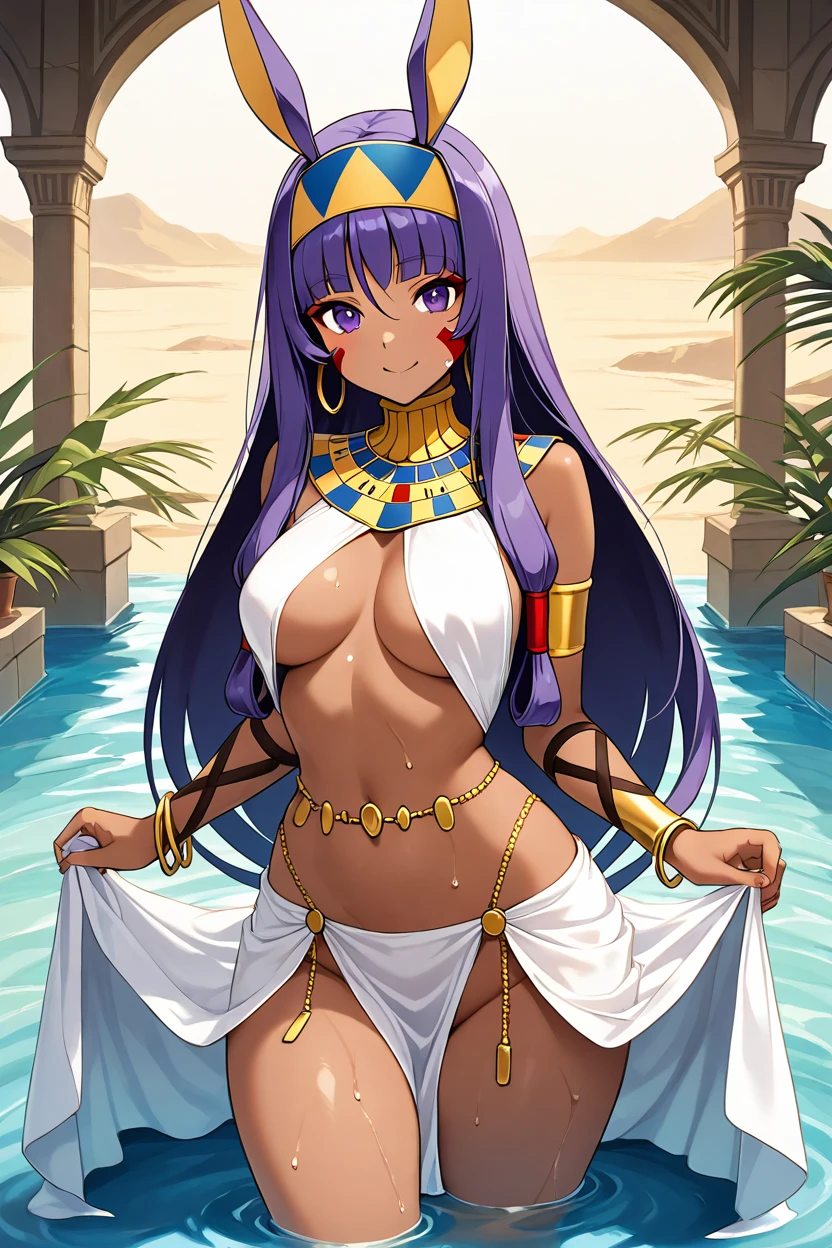 zzNitocris, purple hair, purple eyes, animal ears, dark skin, long hair, facial mark, hairband, jewelry, bracelet, egyptian clothes, thighs, belly chain, usekh collar,