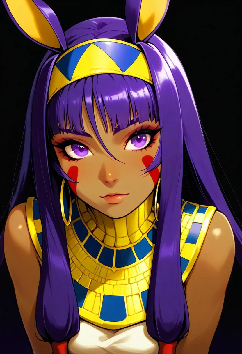 zzNitocris, purple hair, purple eyes, animal ears, dark skin, long hair, facial mark, hairband, jewelry, bracelet,