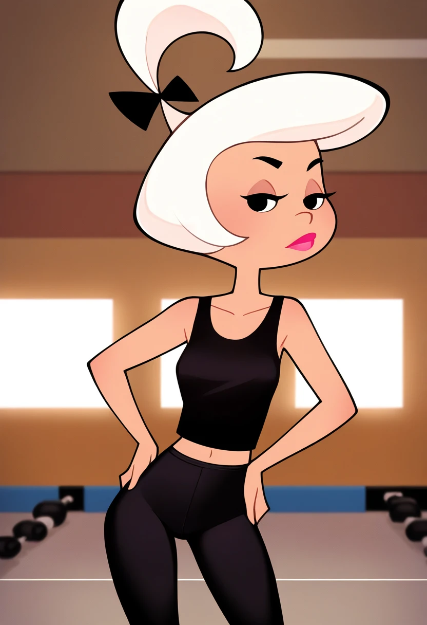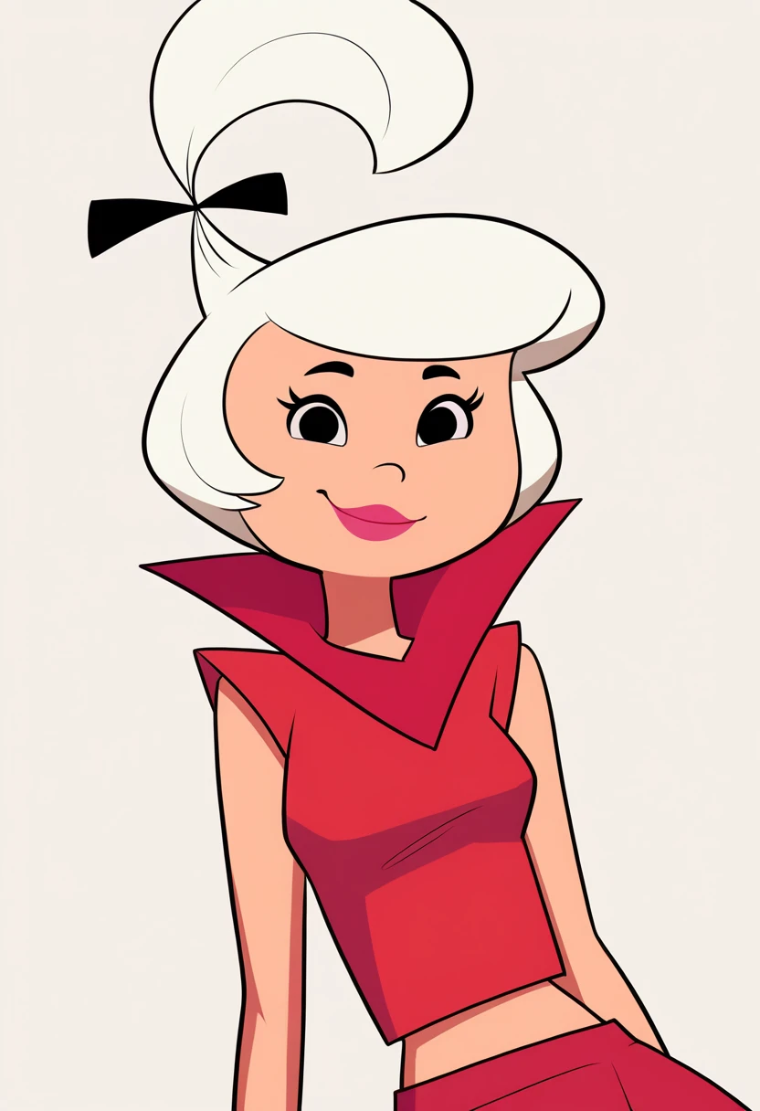 1girl, judy, white hair, black eyes, lipstick, black hair bow, topknot