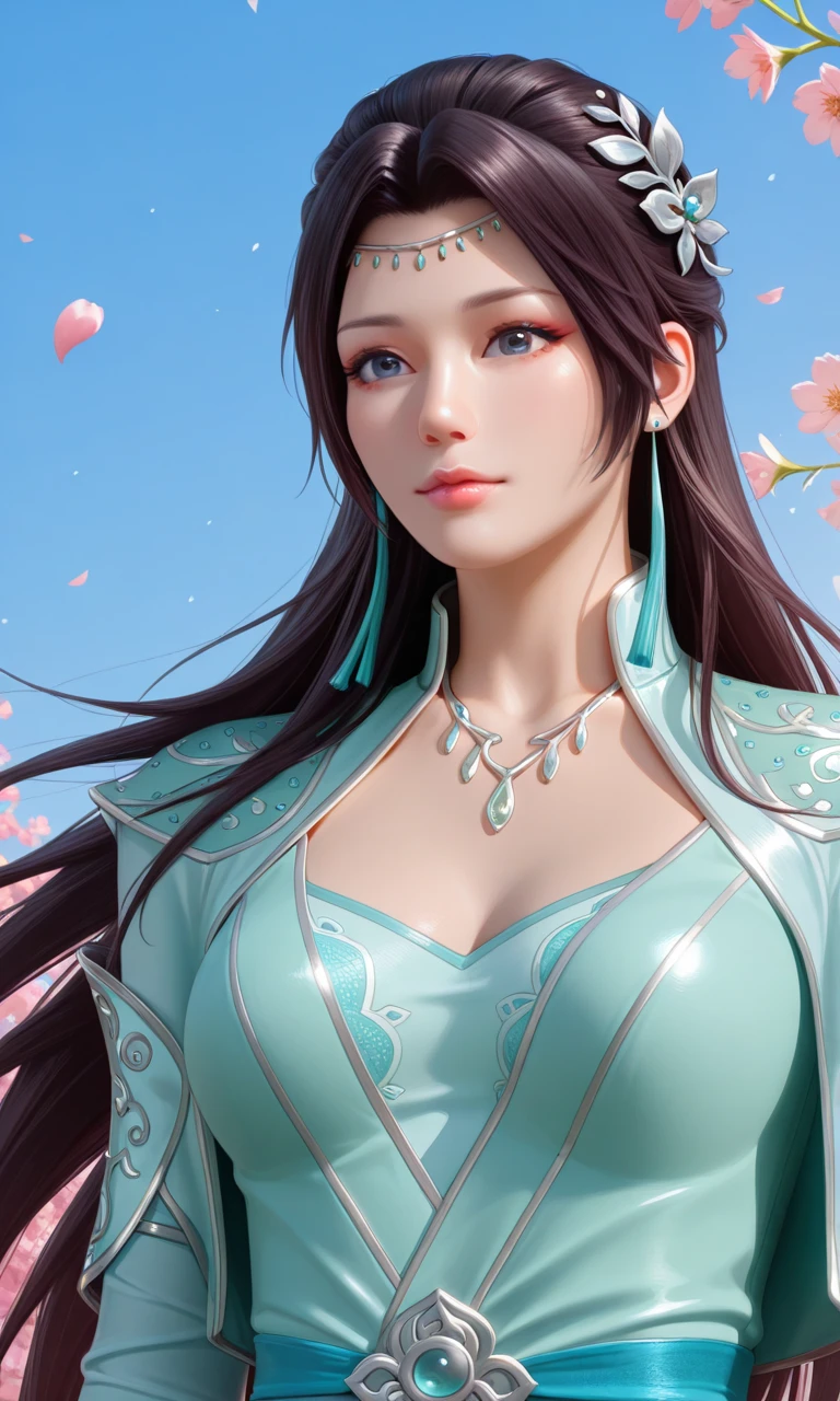 yunyun,1girl,solo,long hair,black hair,jewelry,dress,earrings,hair ornament,breasts,necklace,blue eyes,green dress,long sleeves,realistic,sash,hair bun,blue dress,cleavage,eyelashes,lips,makeup,long dress,ponytail,armor,brown hair,red lips,black footwear,