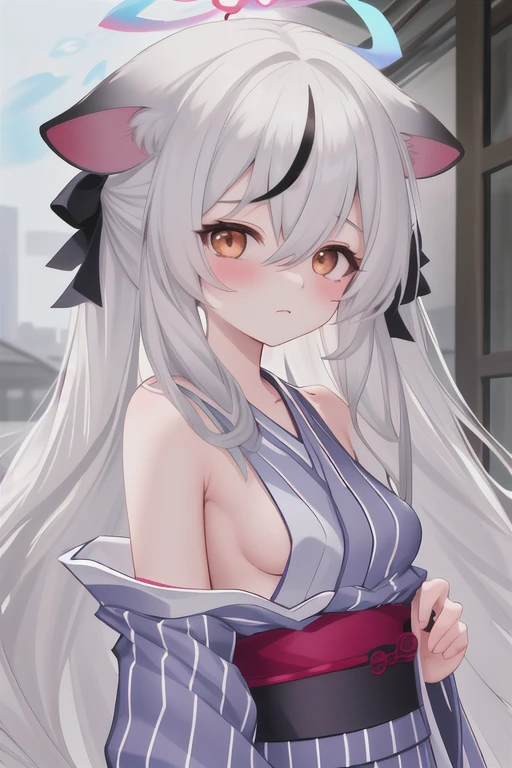 long_hair, animal_ears, black_hair, grey_hair, multicolored_hair, halo, streaked_hair, blush, bangs, breasts, small_breasts, brown_eyes, very_long_hair, striped, vertical_stripes, hair_between_eyes