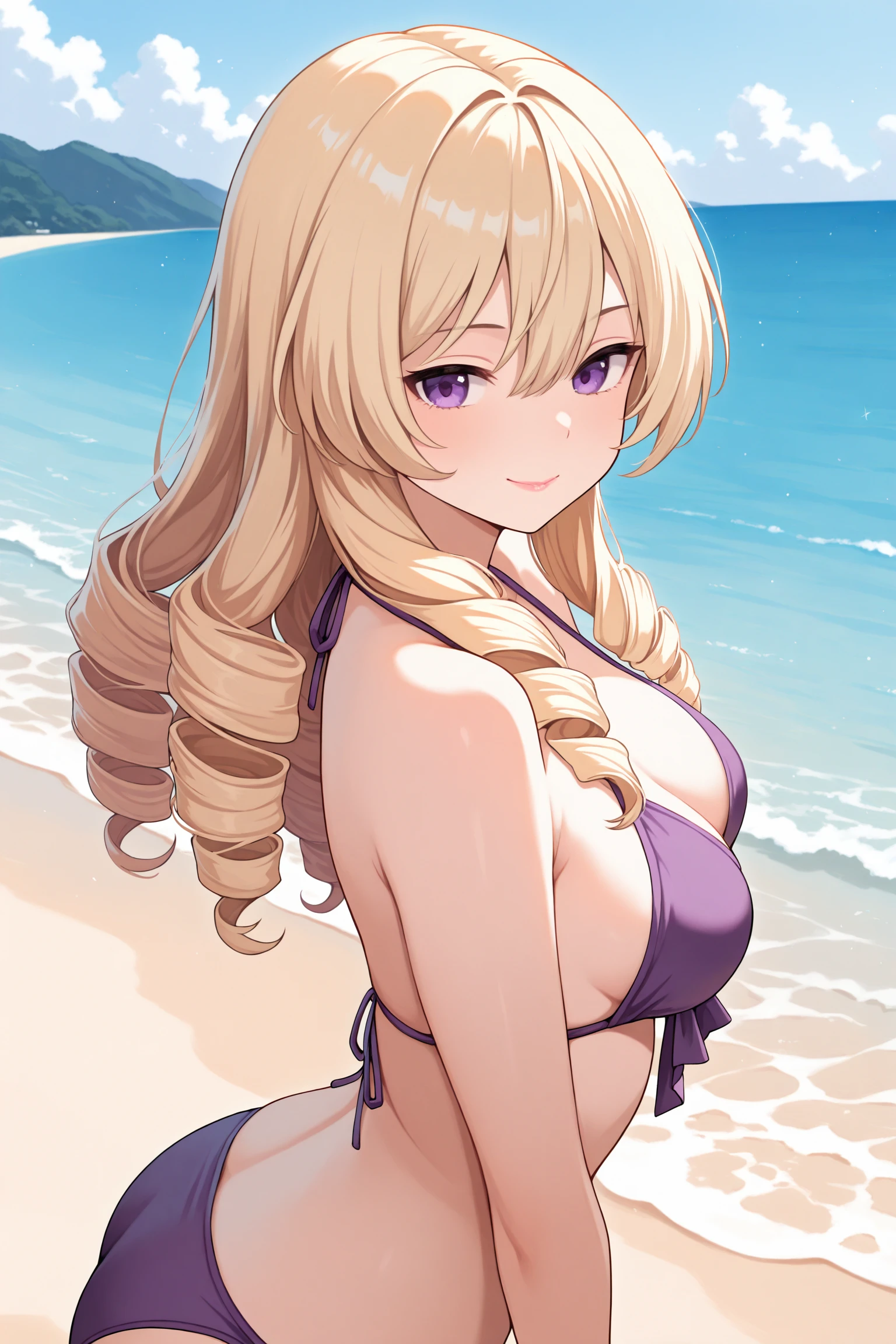 blonde hair, hair pink bow, hair between eyes, drill hair, long hair, purple eyes