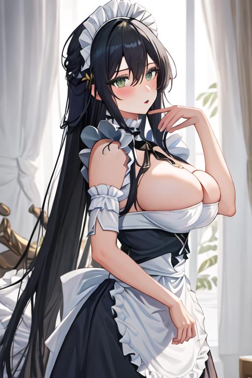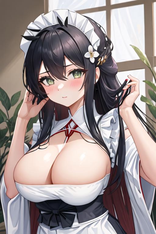 long_hair, black_hair, breasts, green_eyes, hair_between_eyes, bangs, large_breasts, blush, very_long_hair, maid_headdress, hair_ornament, hair_flower, huge_breasts
