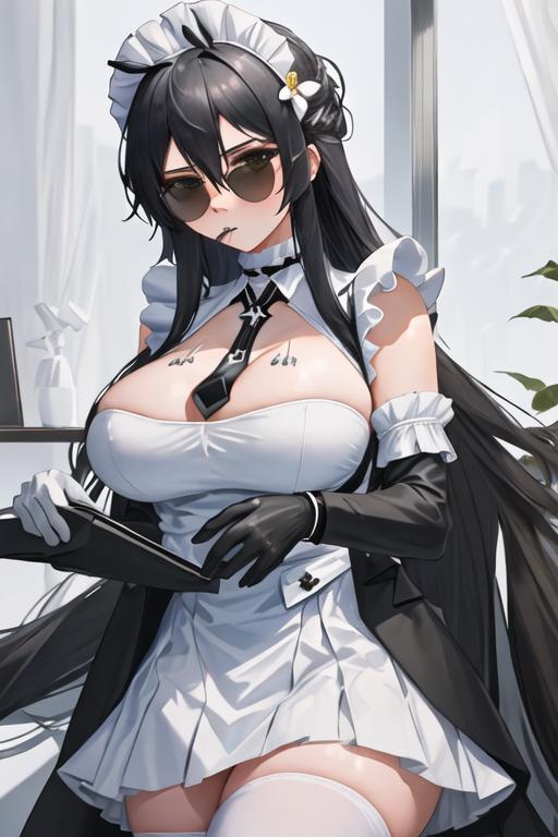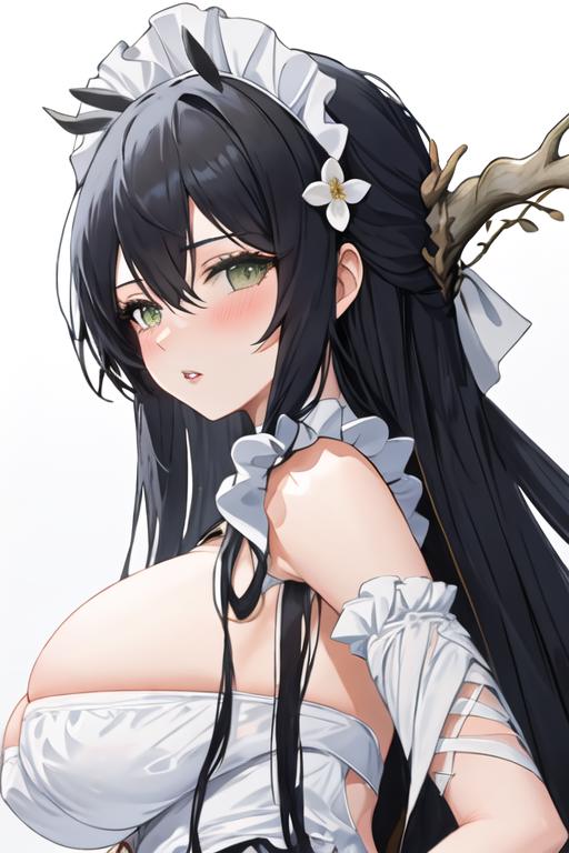 The trigger word is indomitable_azurlane, and the recommended tags are best quality, masterpiece, highres, solo, {indomitable_azurlane:1.15}, long_hair, black_hair, breasts, green_eyes, hair_between_eyes, bangs, large_breasts, blush, very_long_hair, maid_headdress, hair_ornament, hair_flower, huge_breasts.