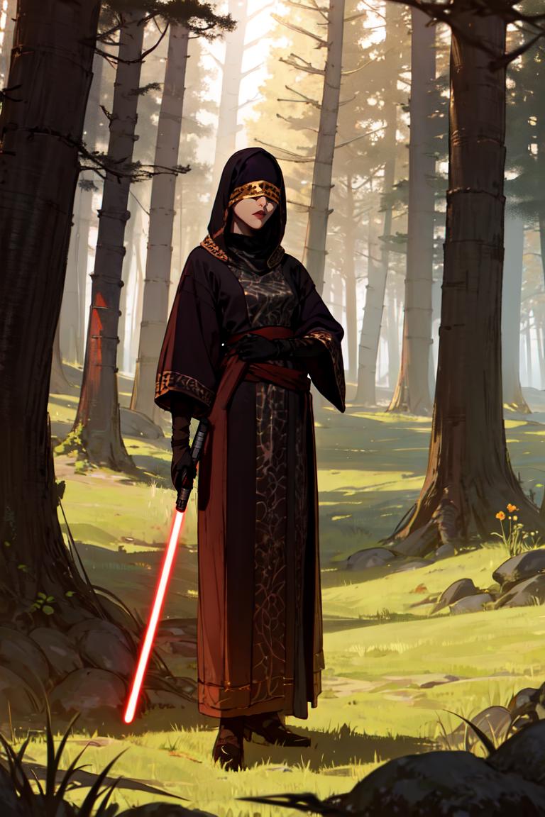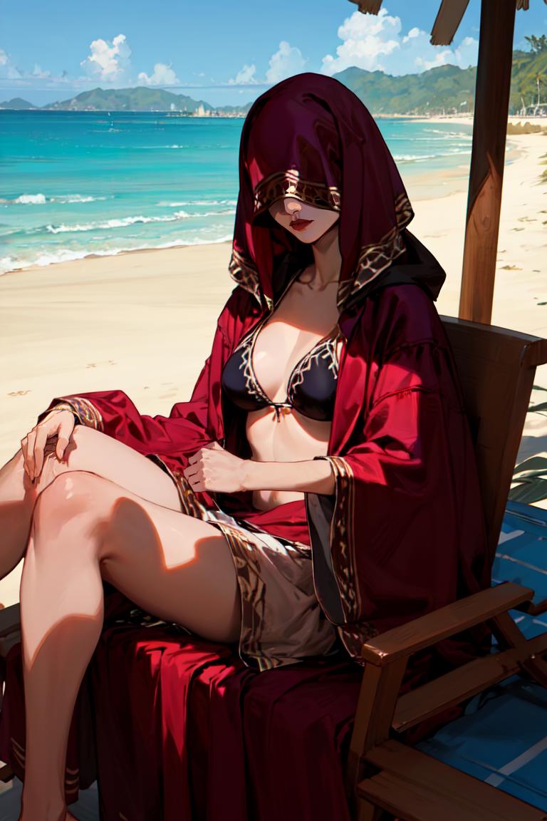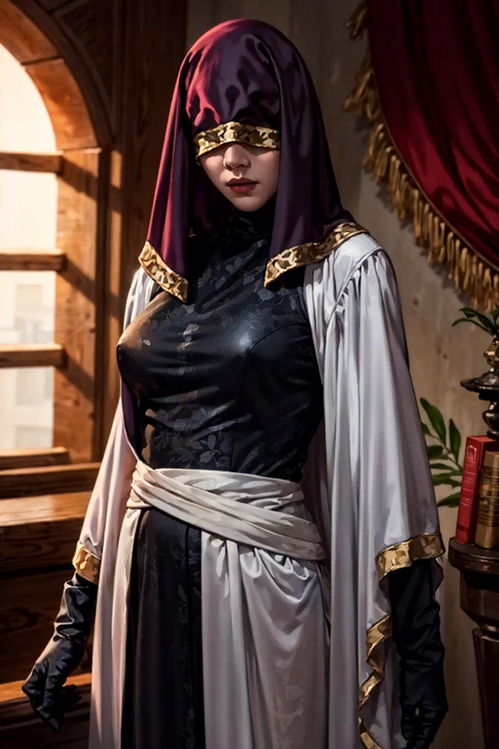 Main triggers - 1girl, robe, dress, hood, obscured eyes, black gloves, black footwear