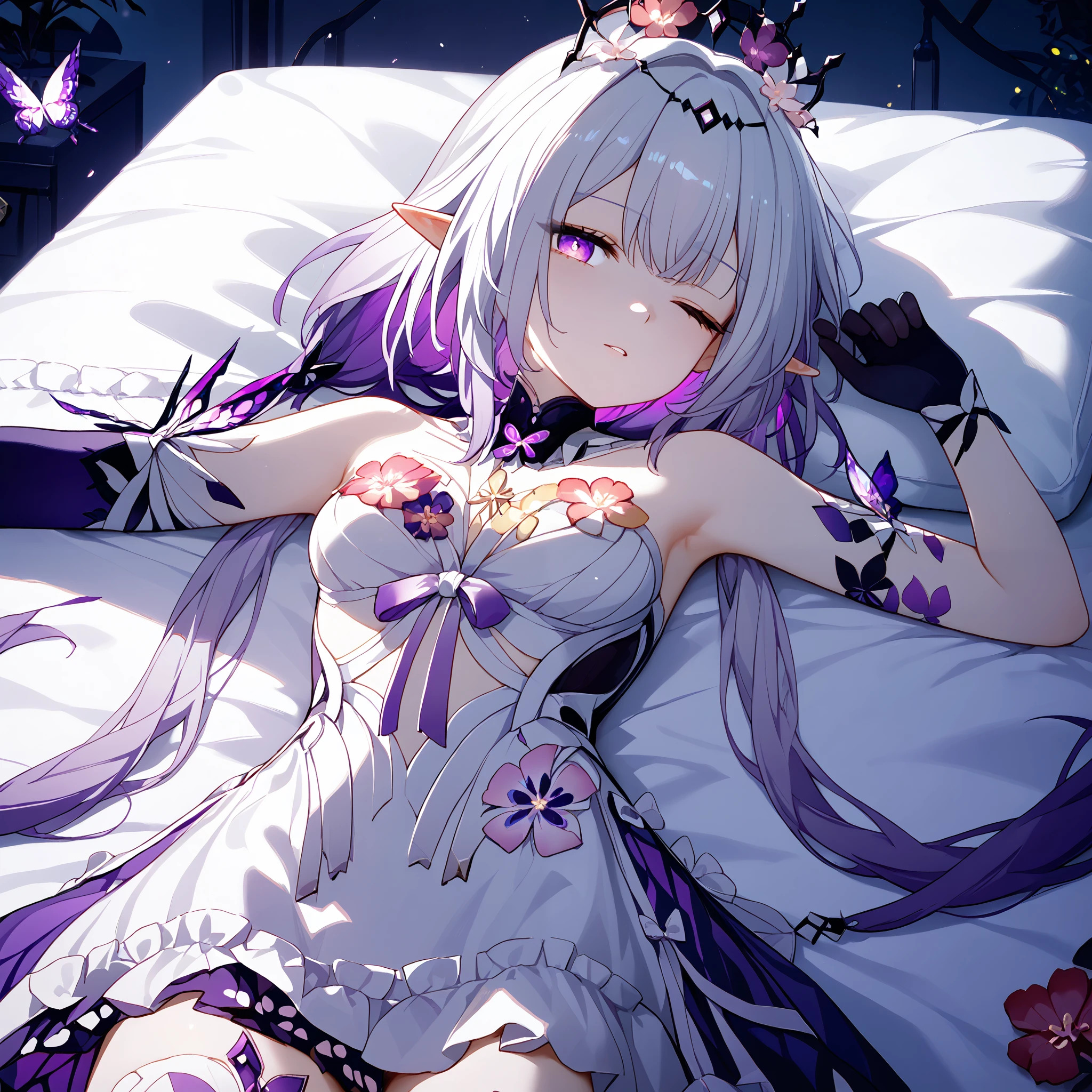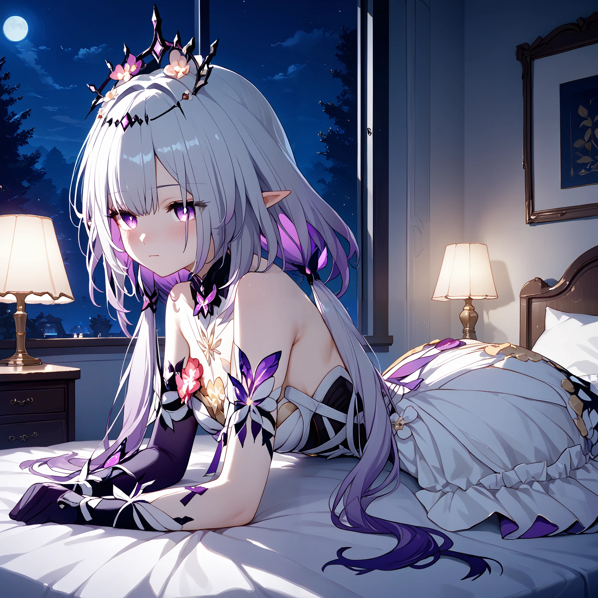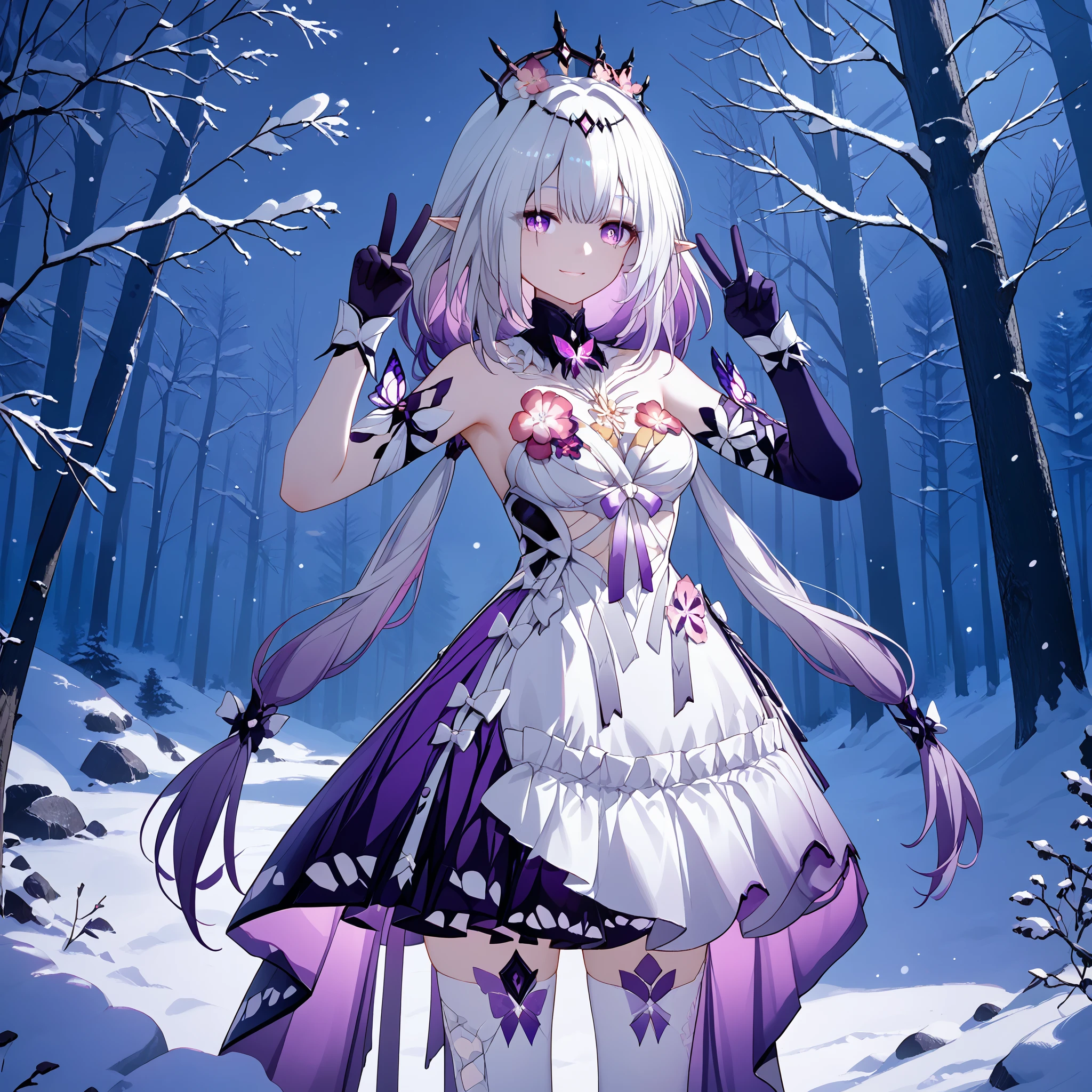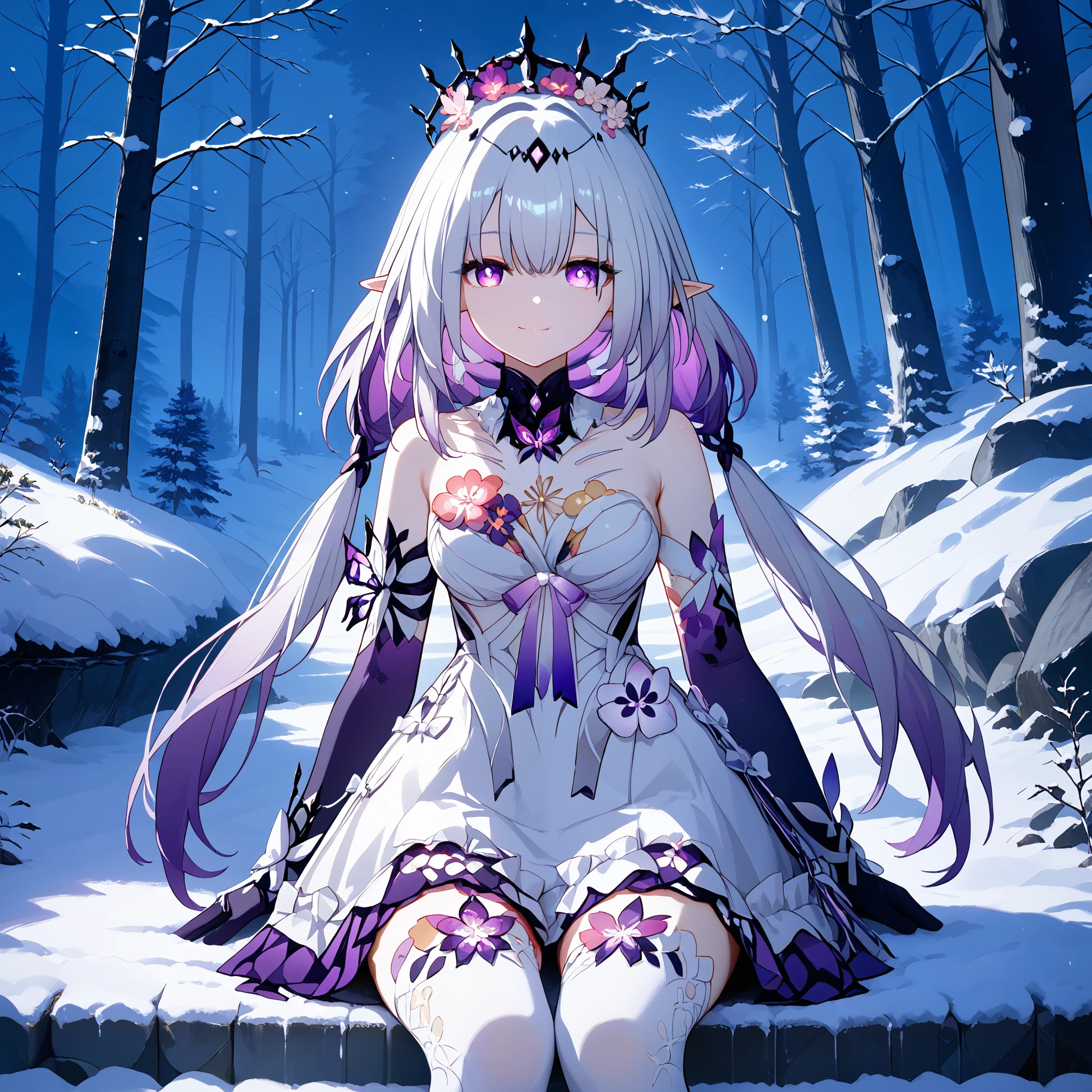 Default : castorice_(honkai:_star_rail), purple eyes, white hair, multicolored hair, colored inner hair, low twintails, pointy ears, crown, two-tone dress, layered dress, elbow gloves, white thighhighs, Description