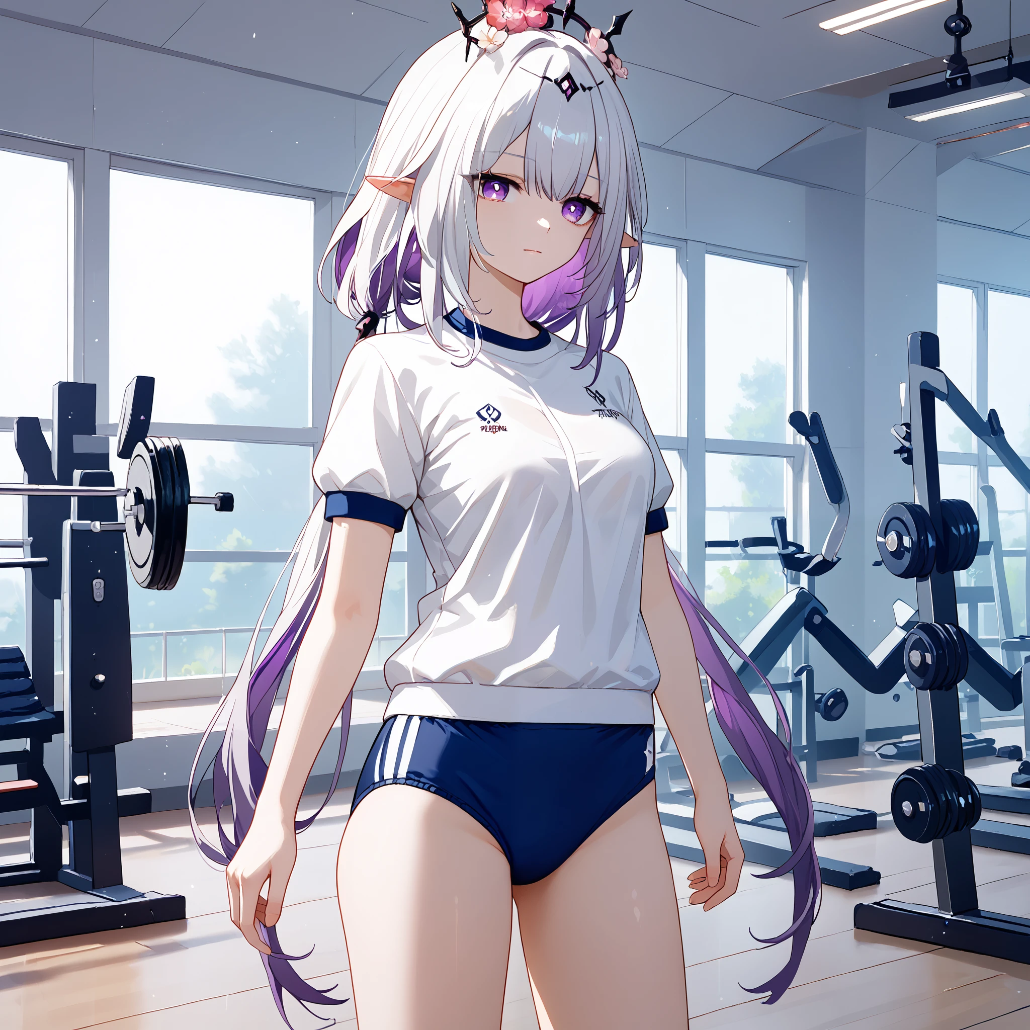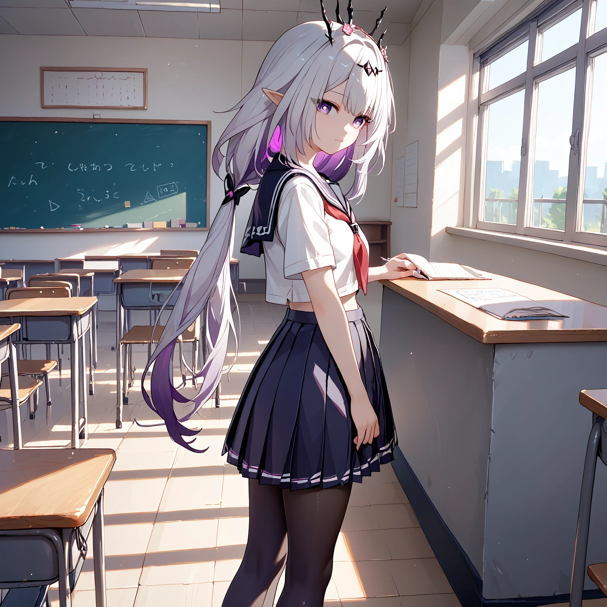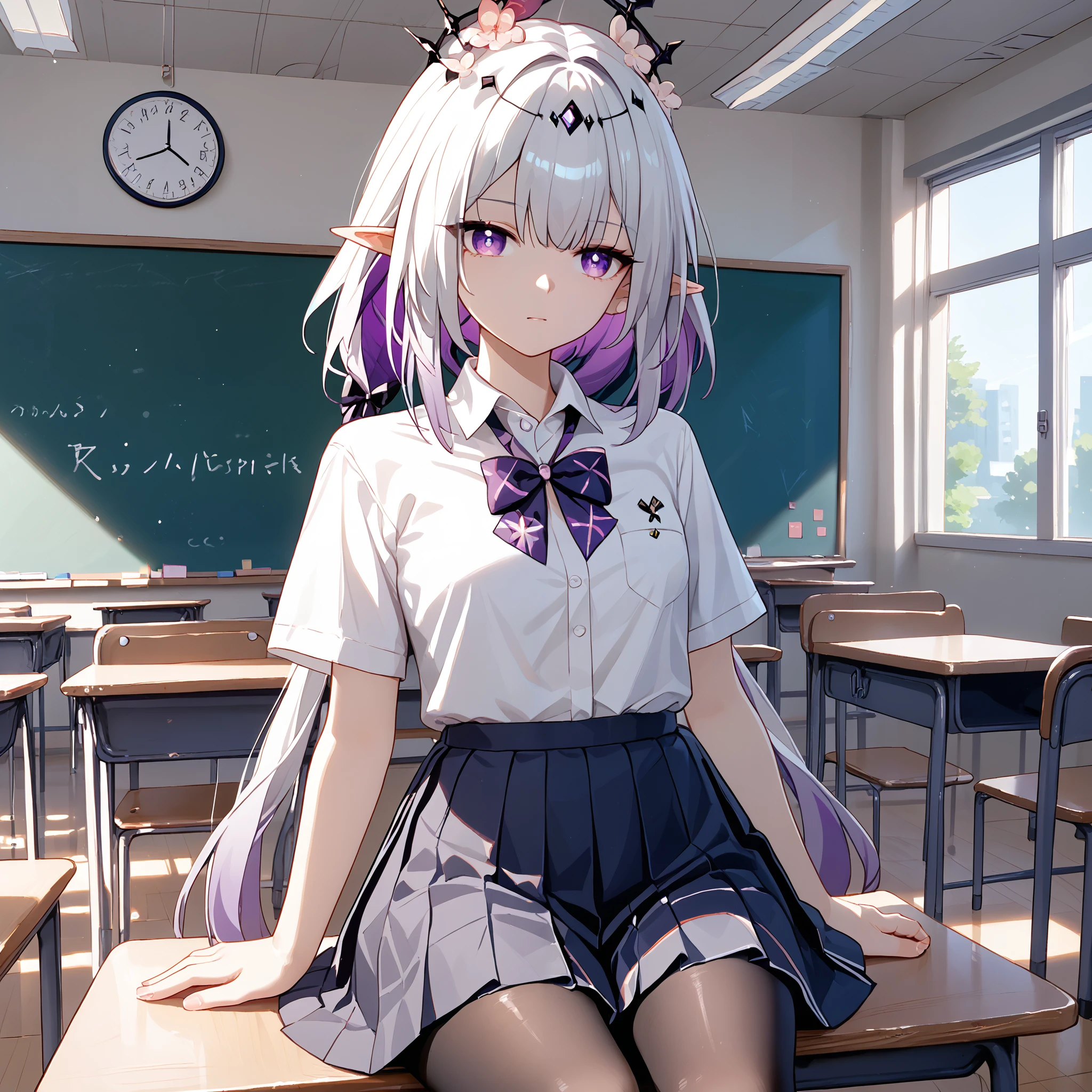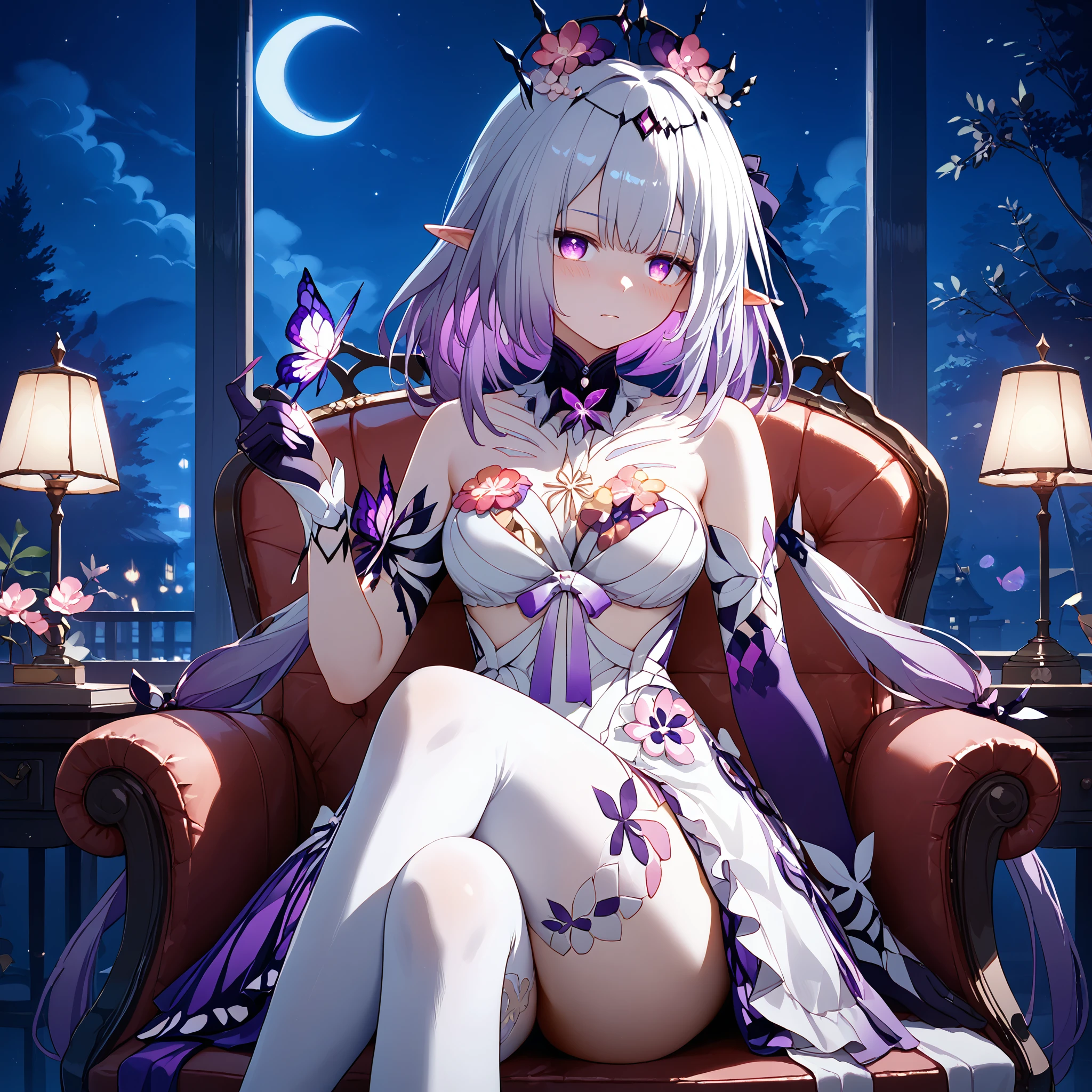 Default : castorice_(honkai:_star_rail), purple eyes, white hair, multicolored hair, colored inner hair, low twintails, pointy ears, crown, two-tone dress, layered dress, elbow gloves, white thighhighs, Description