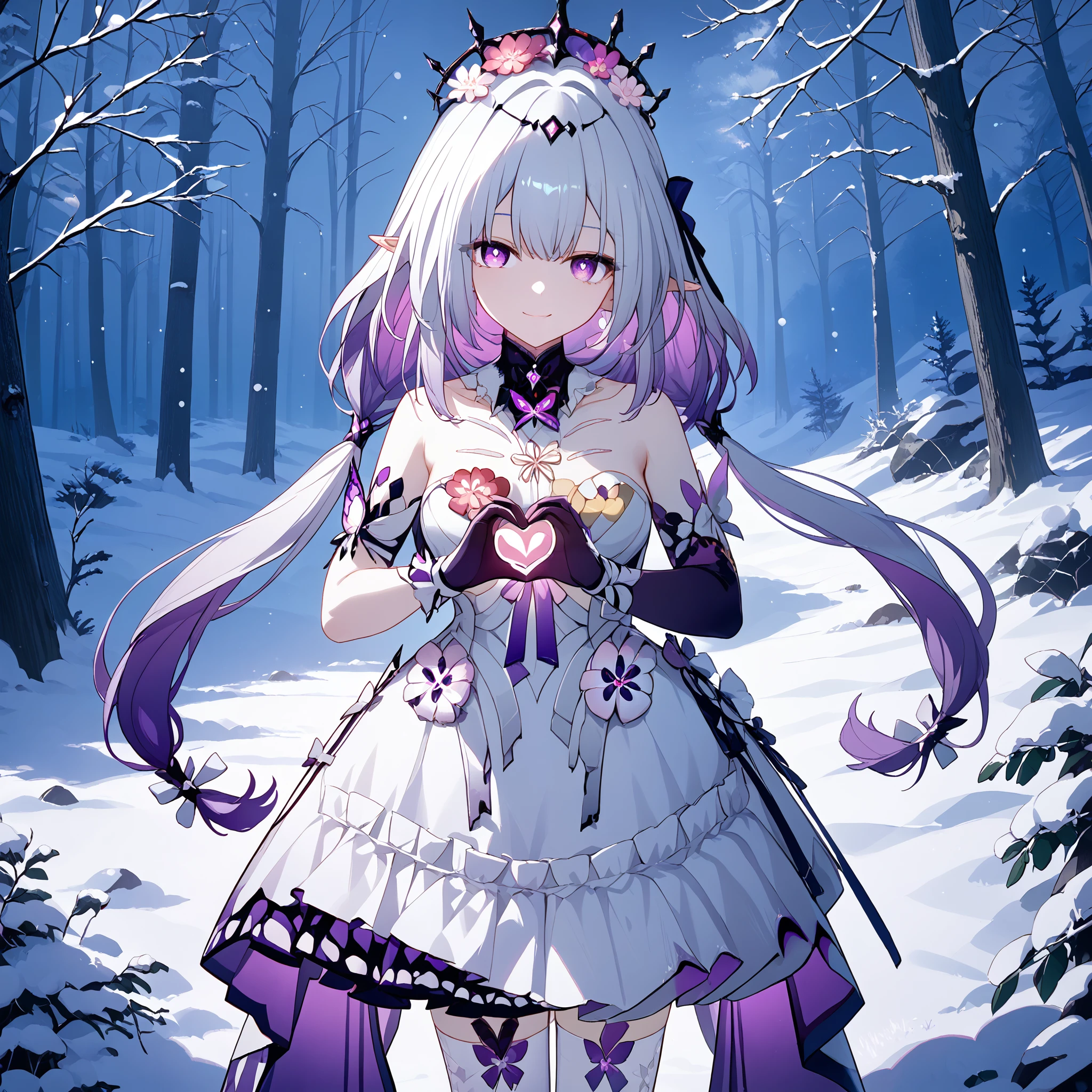 castorice_(honkai:_star_rail), purple eyes, white hair, multicolored hair, colored inner hair, low twintails, pointy ears, crown, two-tone dress, layered dress, elbow gloves, white thighhighs,