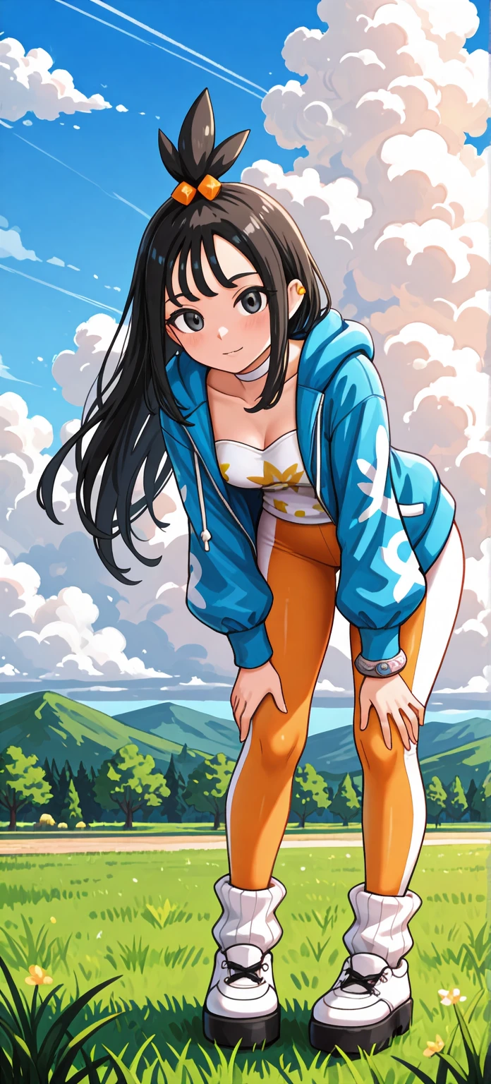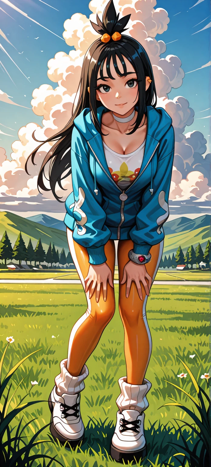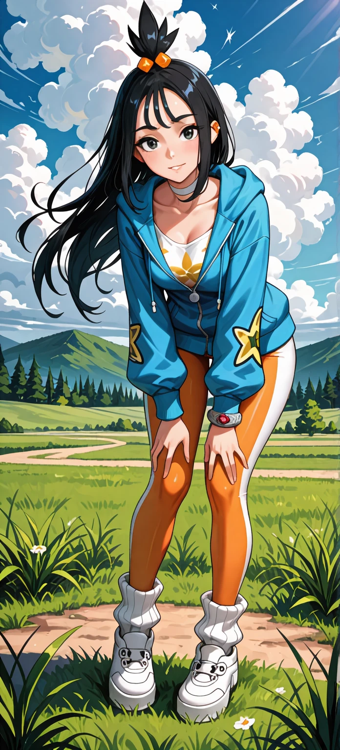 zalida, lida \(pokemon\), aged up, black hair, black eyes, long hair, bangs, sidelocks, topknot, hair bobbles, ear piercing, partially open jacket, blue jacket, hooded jacket, hood down, zipper pull tab, long sleeves, single bracelet, jewelrly, collarbone, white shirt, print shirt, white choker, yoga pants, two-tone pants, orange pants, white pants, white socks, ribbed socks, loose socks, platform shoes, white footwear, colored shoe soles