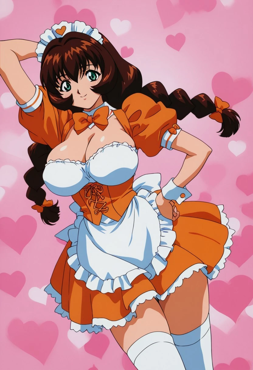 Outfit 02: waitress, maid headdress, orange dress, huge cleavage, orange corset,white apron, wrist cuffs, puffy short sleeves, orange neck bow, white thigh-high socks,